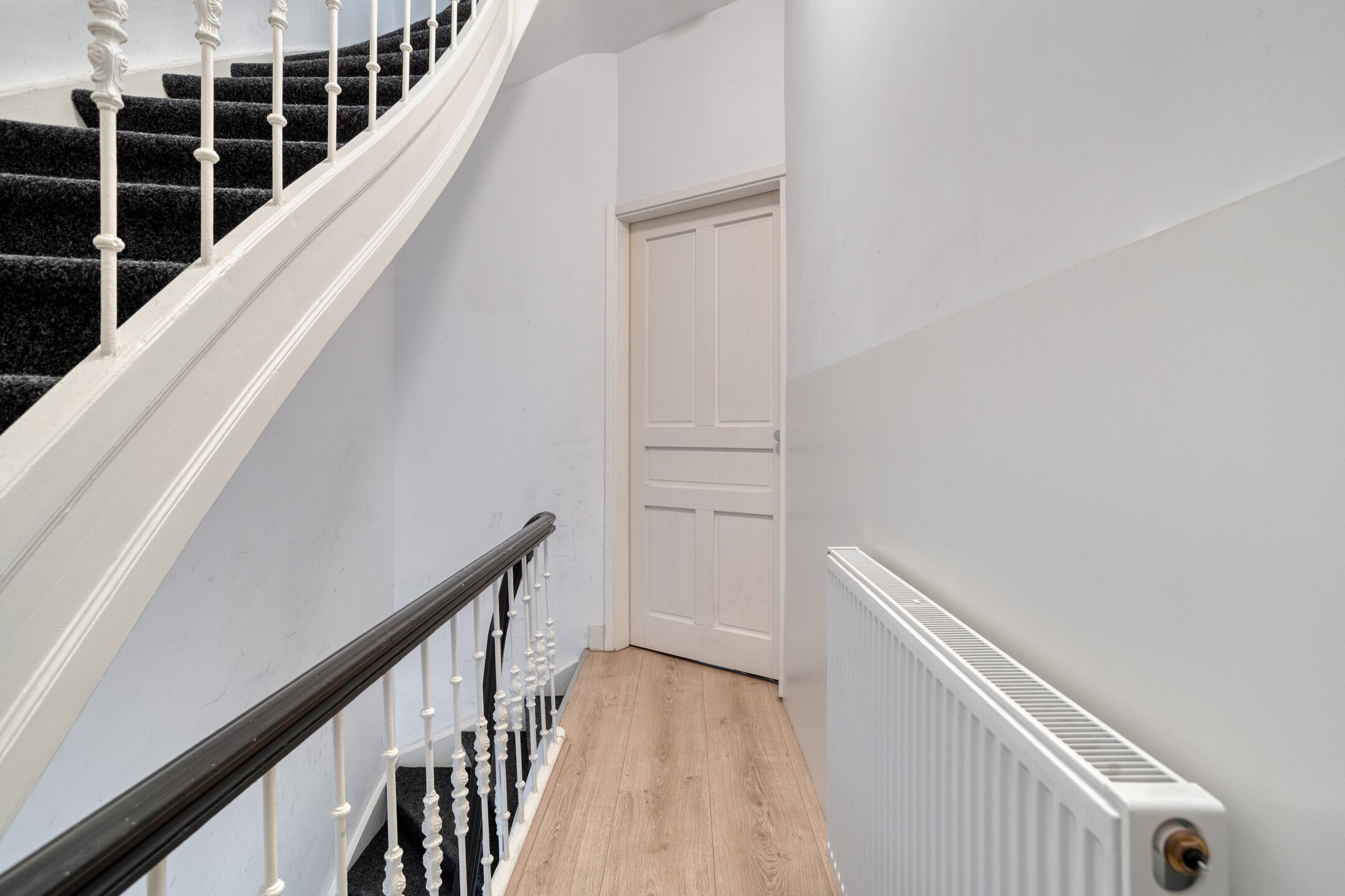 Ground Floor: An impressive, wide entrance door opens into a hall featuring the modernized meter cupboard and the staircase.