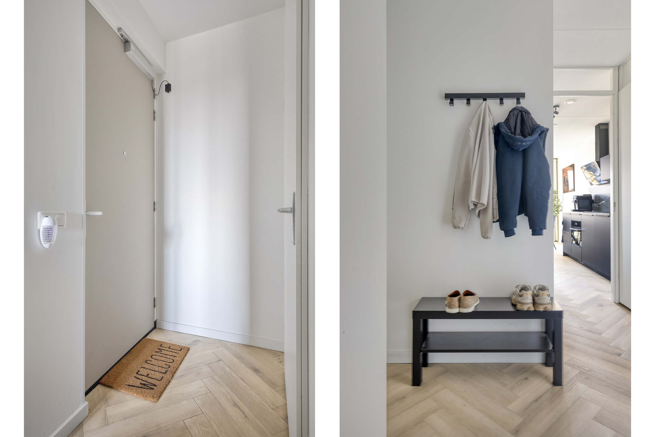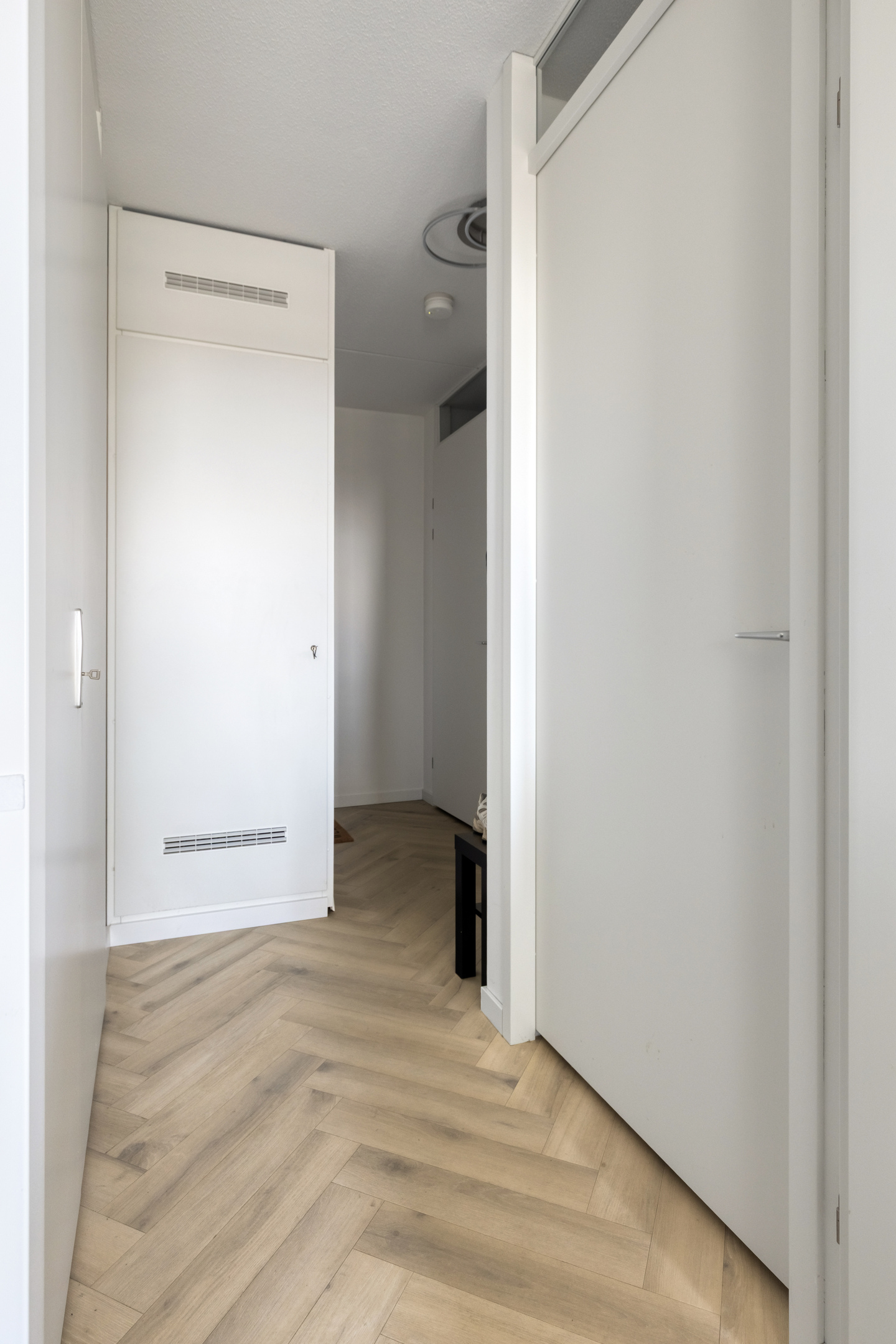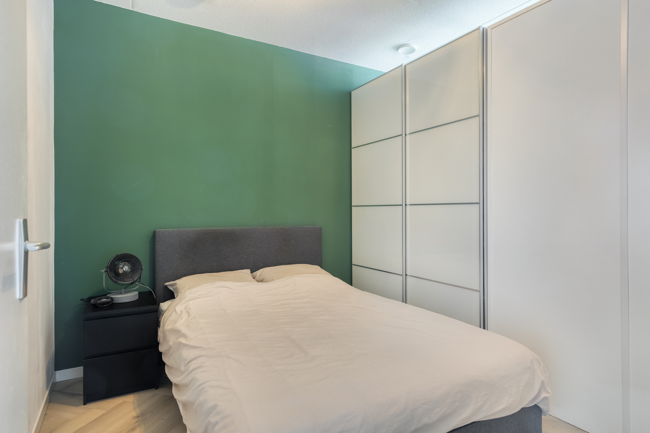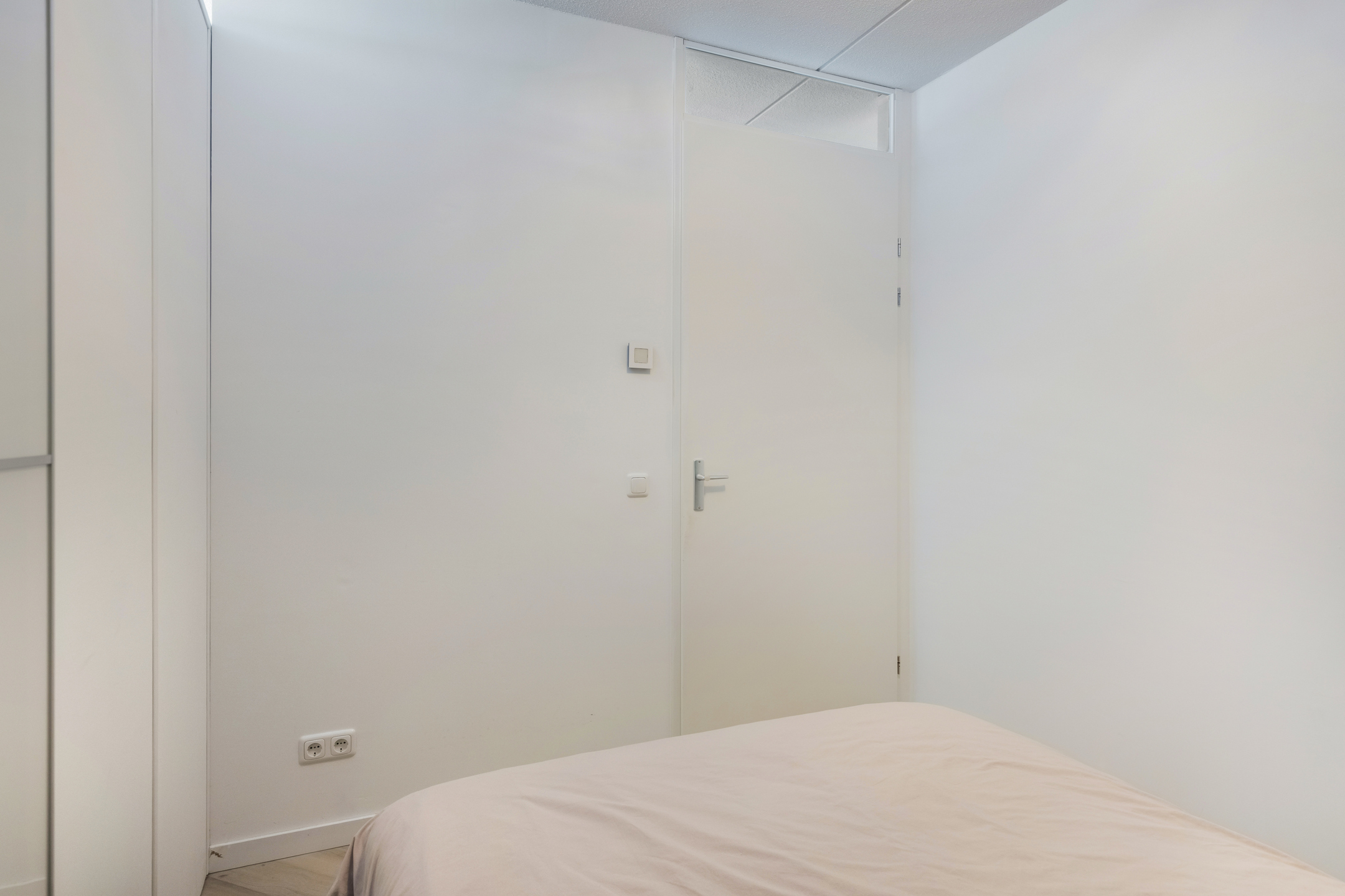 Door de slimme situering van de kasten in de woonkamer is er op een praktische en doordachte manier een afgesloten slaapkamer gerealiseerd, bereikbaar via een deur vanuit de hal. Dit zorgt voor een duidelijke scheiding tussen wonen en slapen en maakt het appartement extra comfortabel en functioneel.