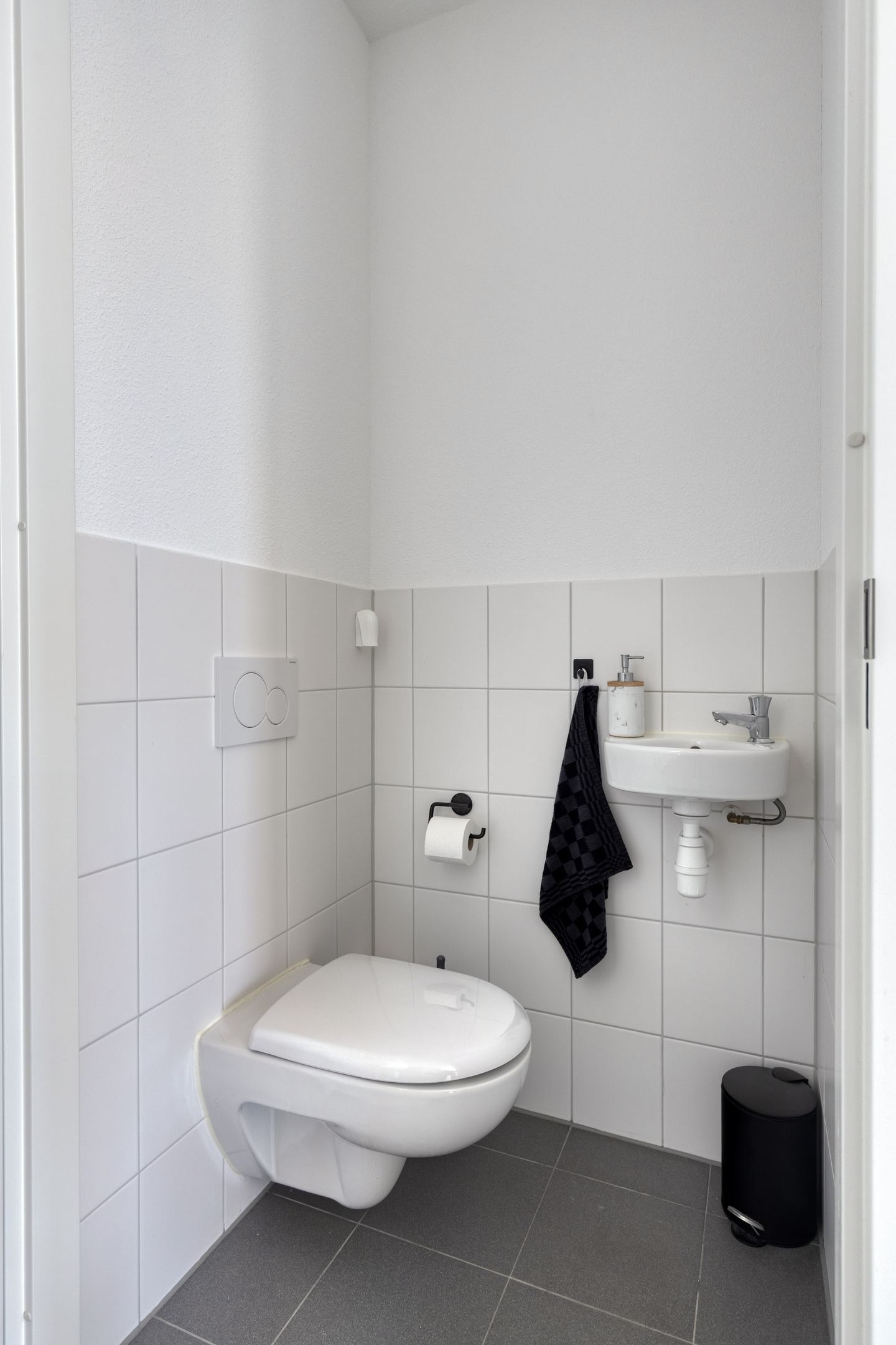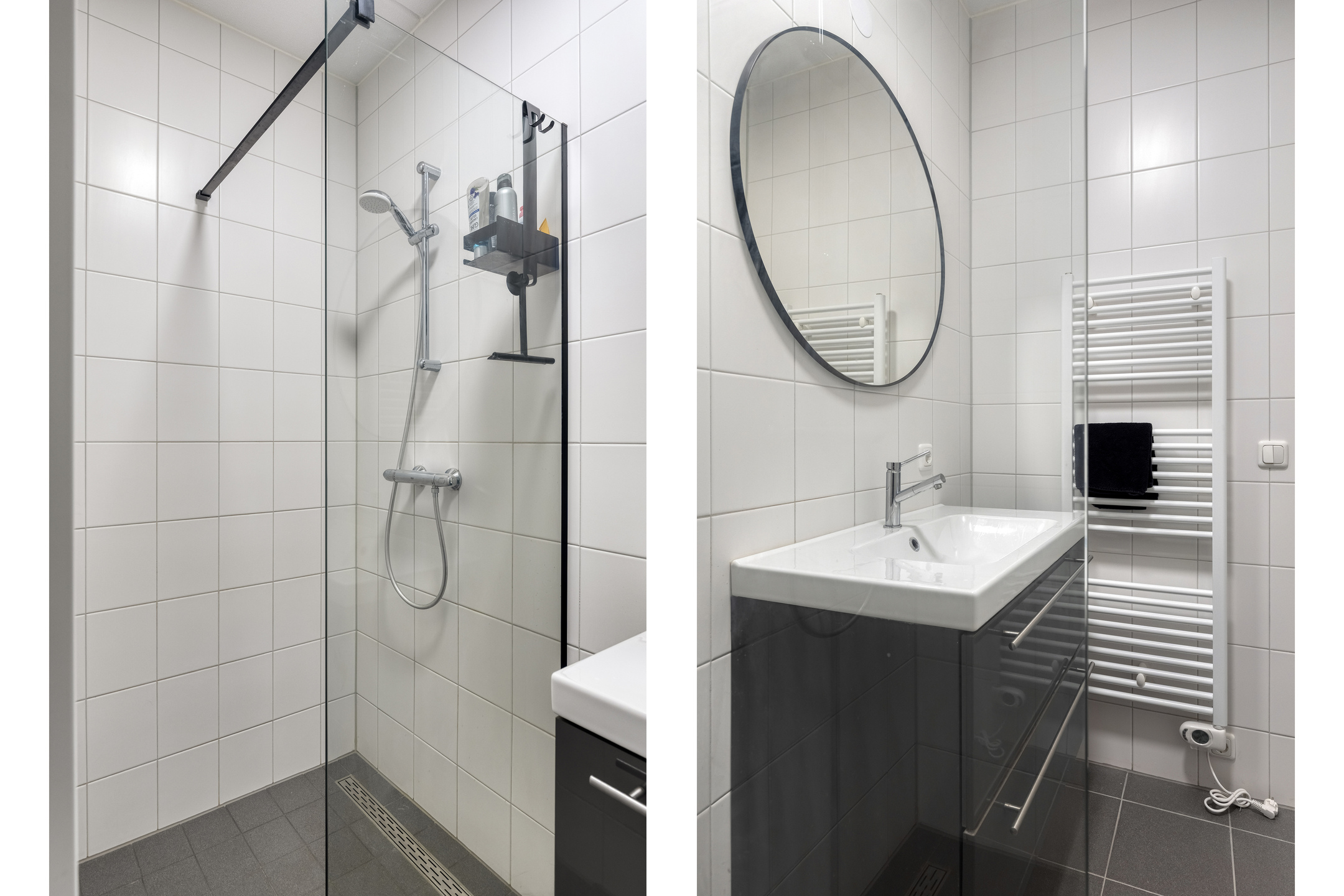 Via het portiek kom je binnen in de hal. De hal geeft toegang tot een separate toiletruimte en de nette badkamer, voorzien van een douche en wastafel(meubel). Vanuit de hal, waar ook praktische bergkasten, de technische ruimte en de wasopstelling zijn gesitueerd, bereik je de woonkamer met open keuken én de toegang tot de slaapkamer.