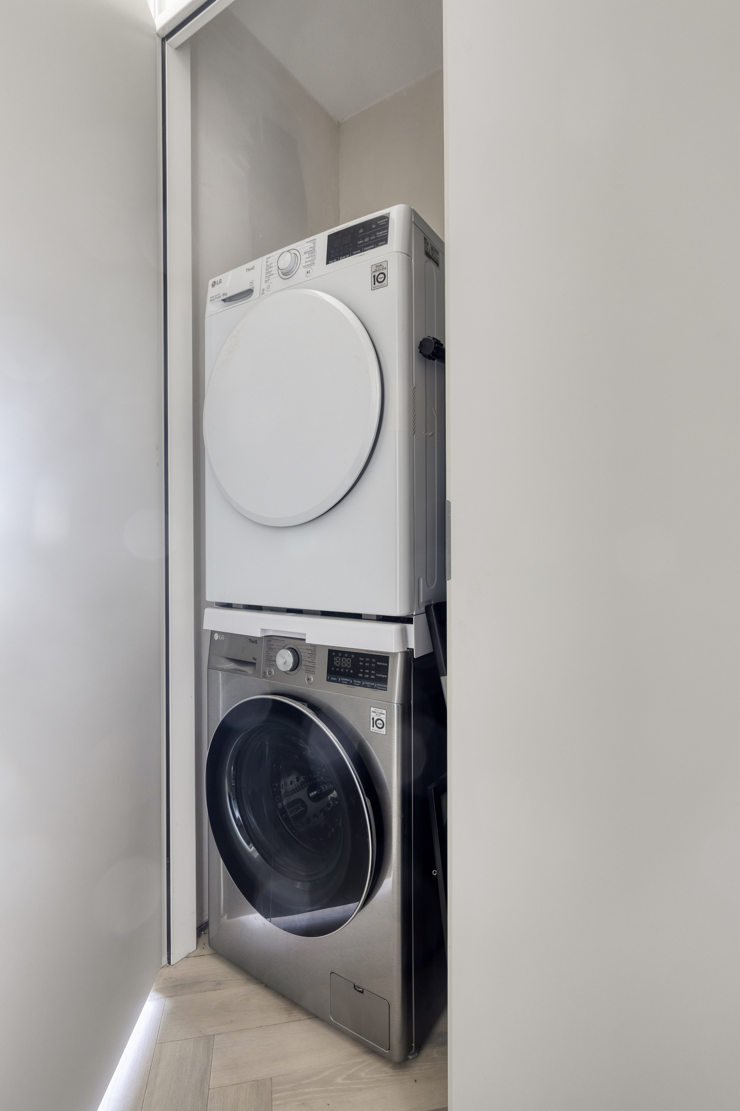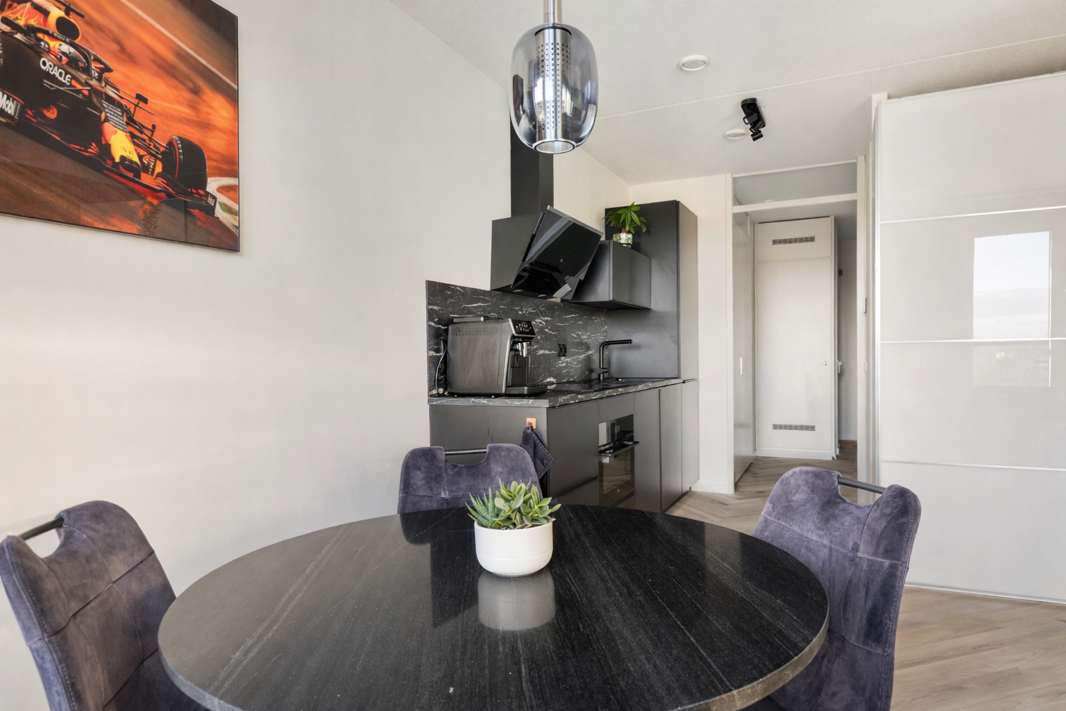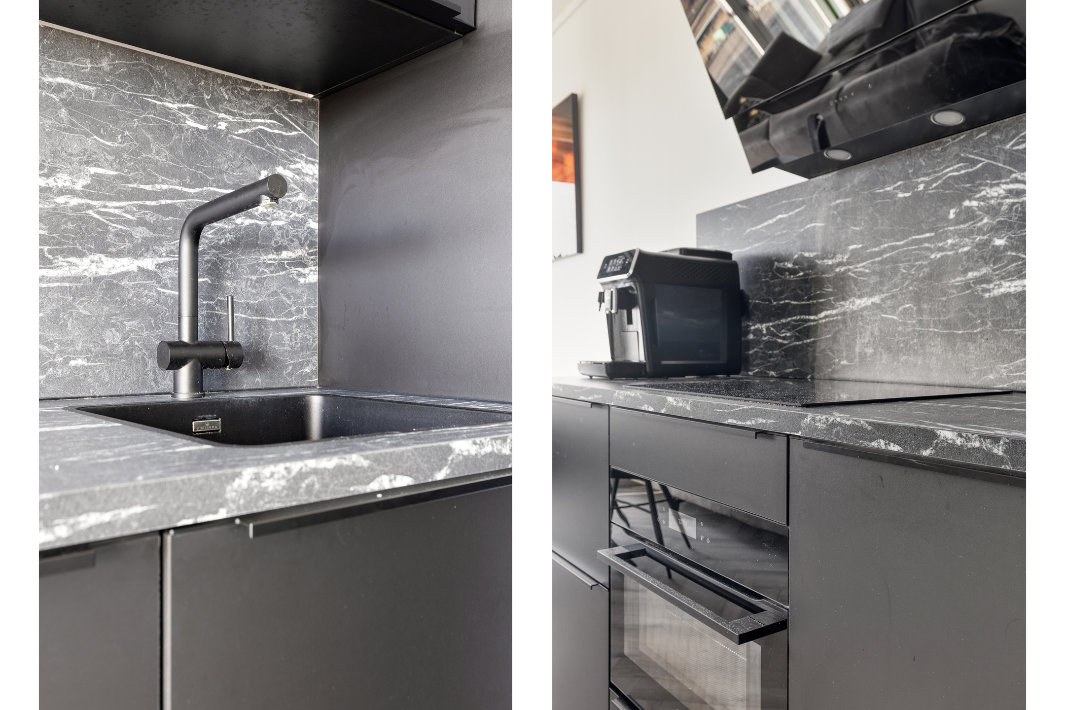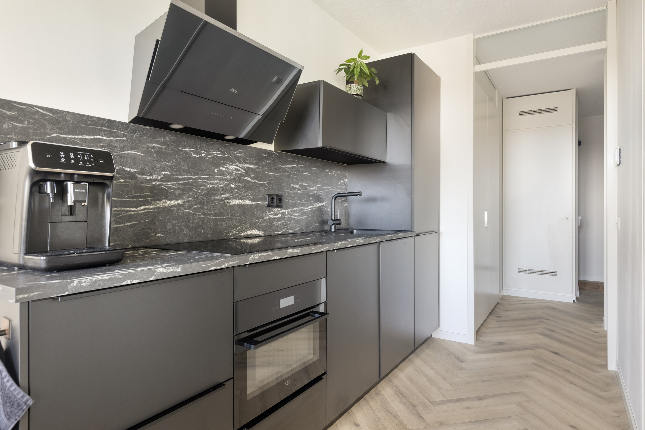 De keuken is modern uitgevoerd en voorzien van hoogwaardige AEG-inbouwapparatuur, waaronder een combimagnetron, vaatwasser, koelkast, aparte vriezer en inductiekookplaat. De strakke afwerking en kwaliteit maken de keuken compleet en direct klaar voor gebruik.