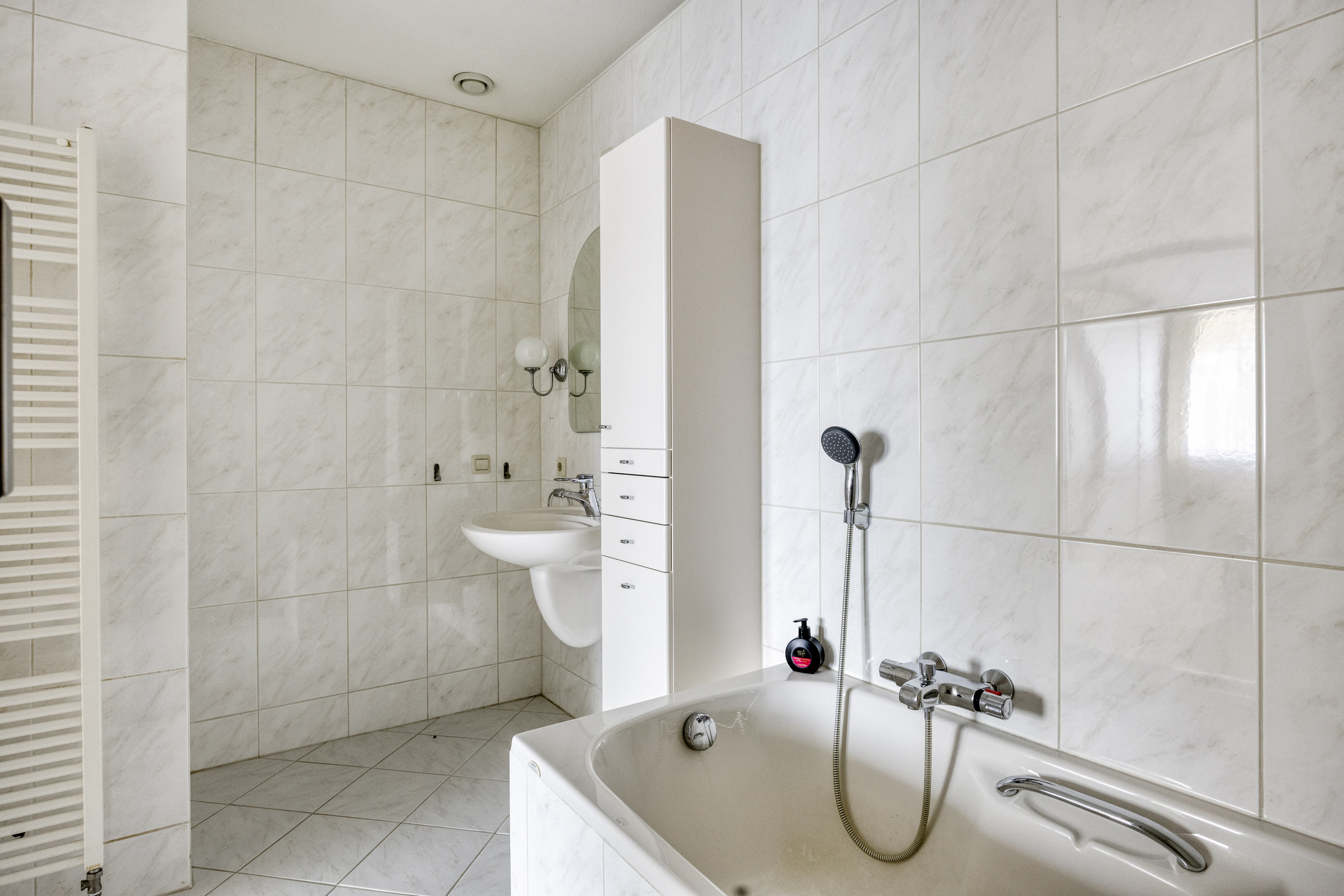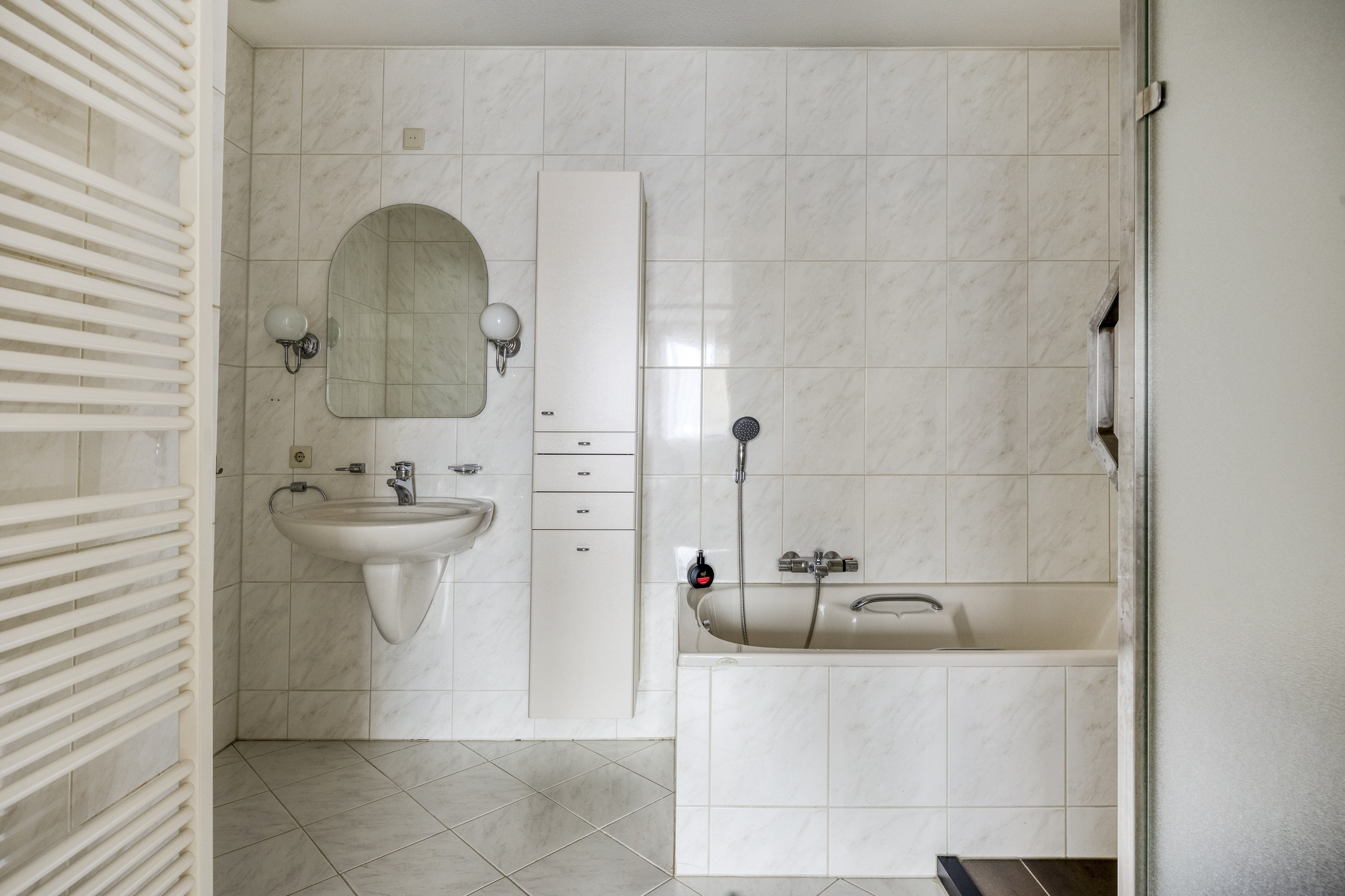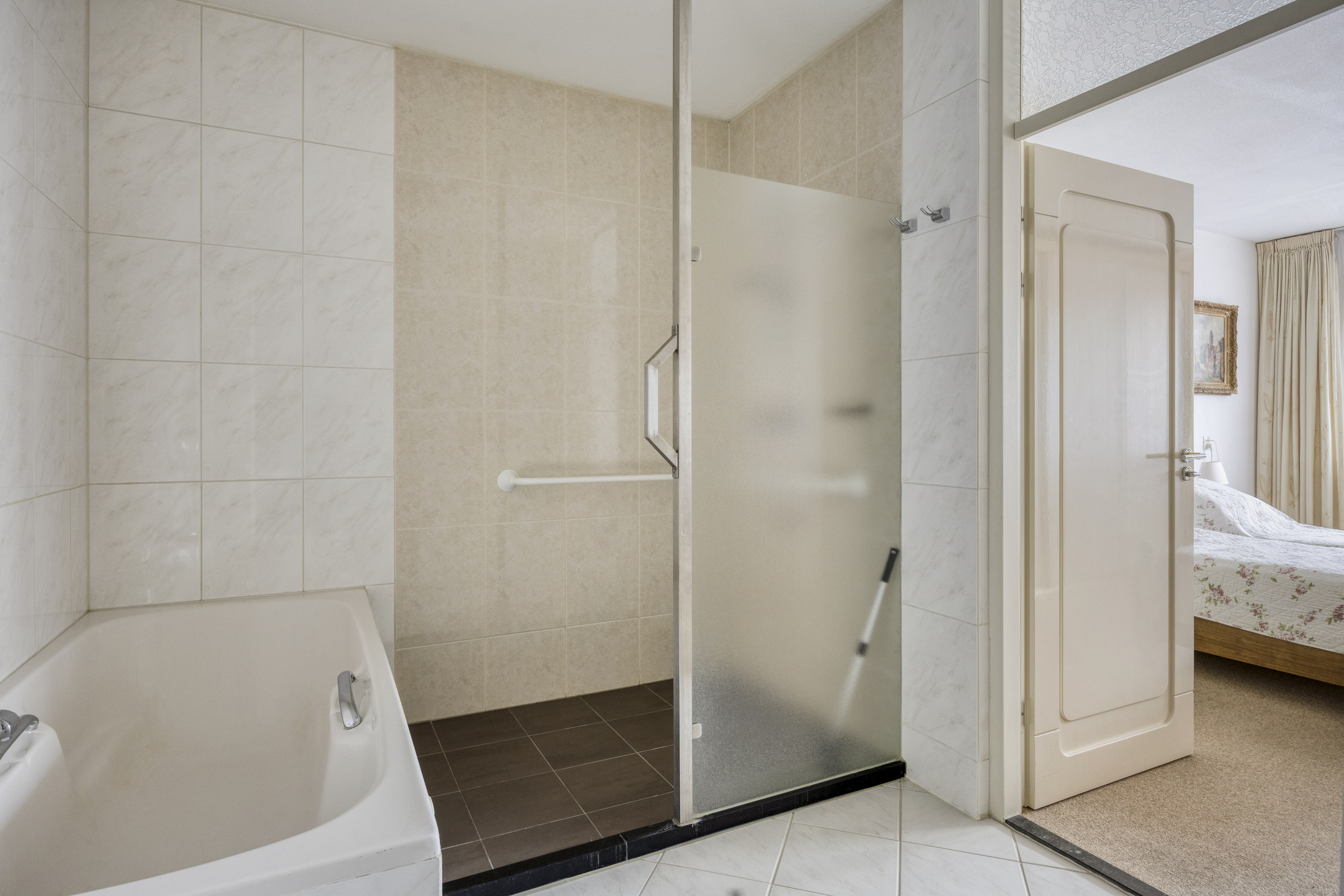 Badkamer ensuite: De licht betegelde badkamer is voorzien van een ligbad en separate inloopdouche, een wastafel, badkamermeubel en radiator.