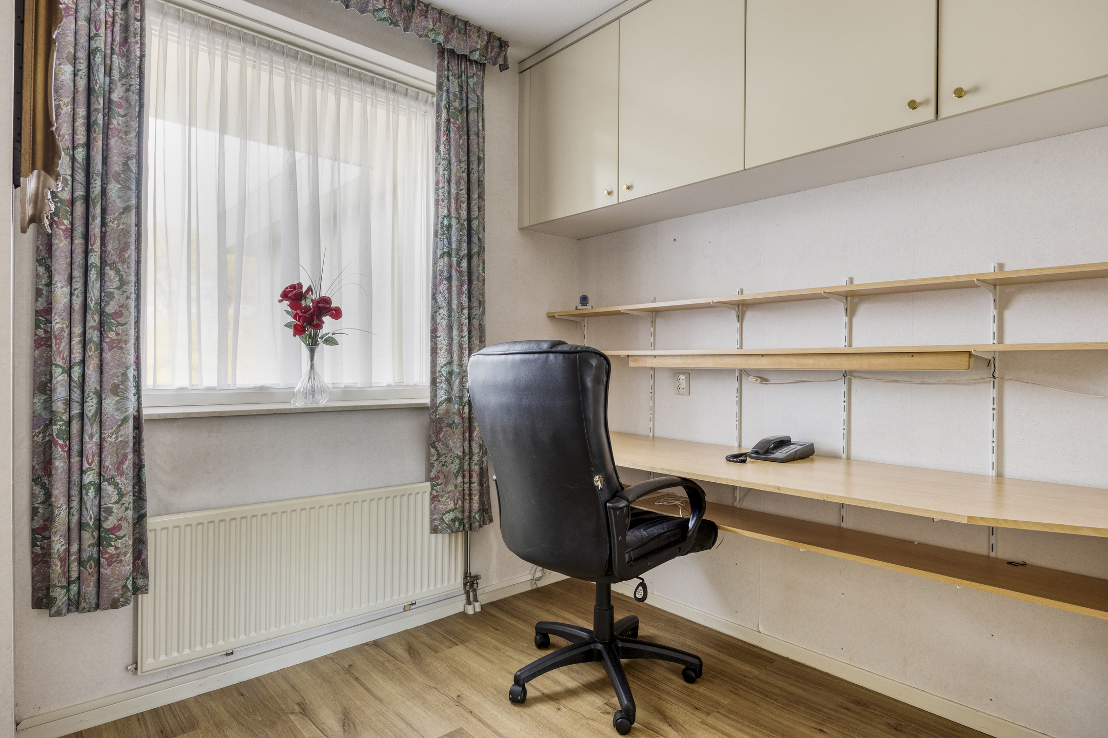 Slaapkamer 2: Deze slaapkamer (1-persoons) is ook heel goed te gebruiken als logeerkamer of studeer/hobby kamer en is voorzien van een bureautafel met planken en vaste opbergkasten.