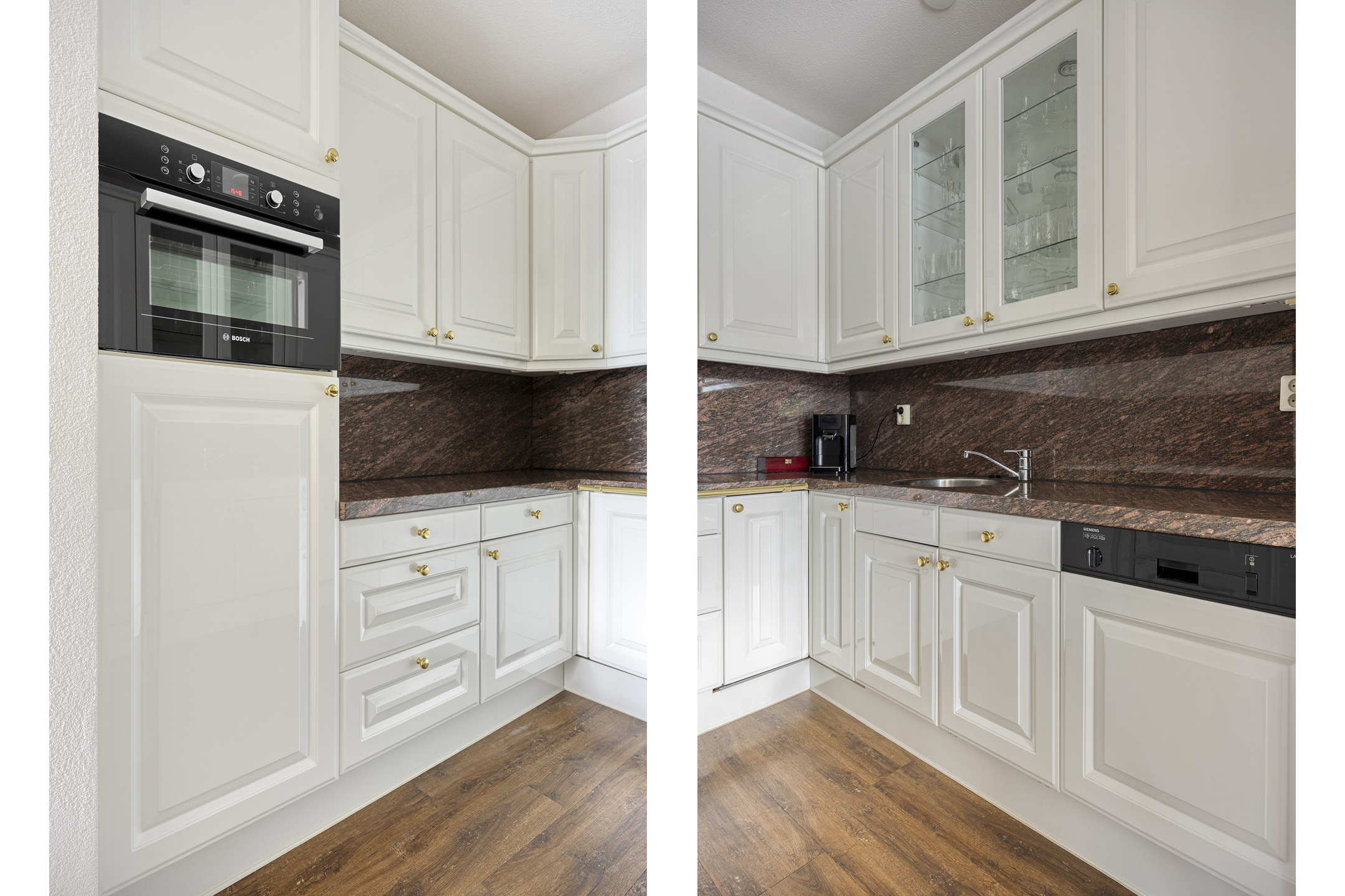 Keuken: De praktische open keuken combineert overzicht met comfort. Het onderhoudsarme composiet keukenblad en de frisse witte kasten zorgen voor een lichte, prettige werkplek. De keuken is compleet uitgerust met betrouwbare inbouwapparatuur, te weten; een Siemens vaatwasser, een veelzijdige Bosch combi-ovenmagnetron en een ruime Bosch koelkast. Met de handige waterkraan en spoelbak heb je alles binnen handbereik. Koken en genieten wordt hier een plezier en met alle gemak!