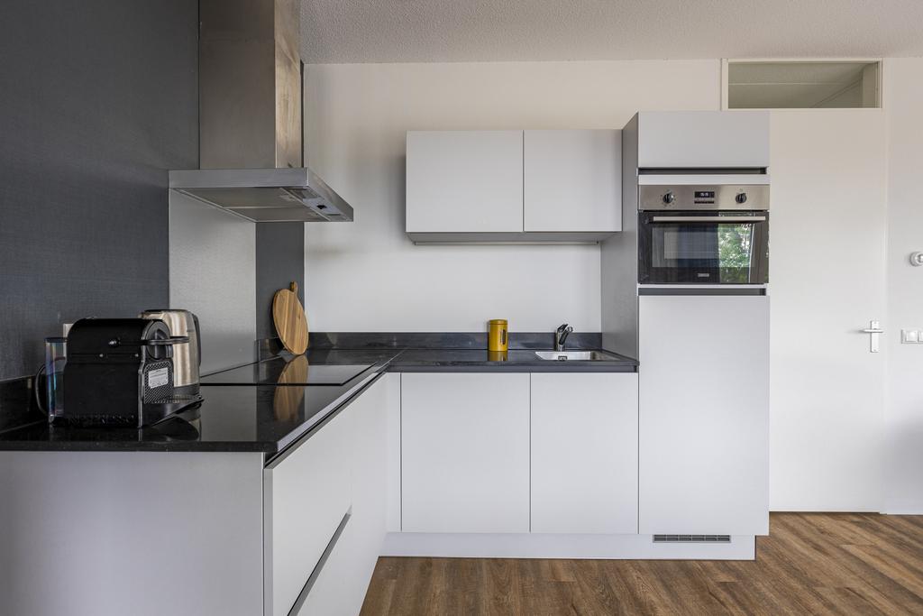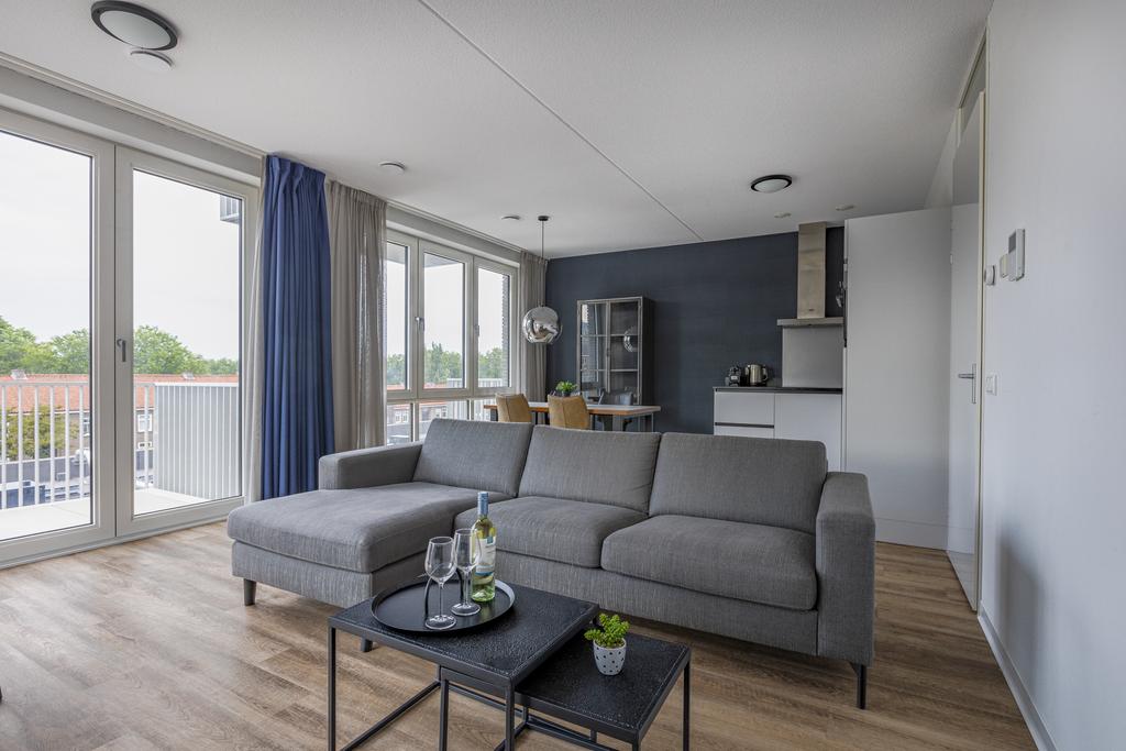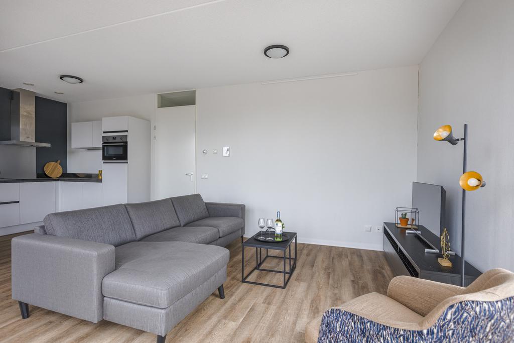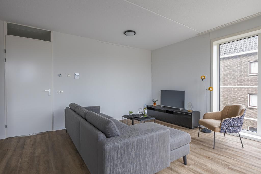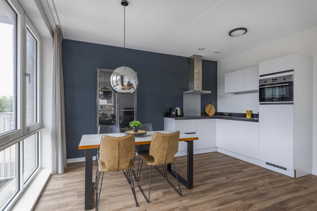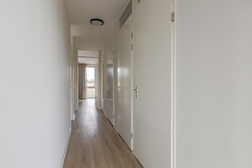 Dit gestoffeerde en gemeubileerde driekamerhoekappartement op de 5e verdieping combineert functionaliteit met comfort en biedt twee ruime slaapkamers, een badkamer met douchecabine en wastafelmeubel, een woonkamer met grote raampartijen die voor veel licht zorgen. De luxe keuken is voorzien van inbouwapparatuur zoals een vaatwasser, combimagnetron, inductie kookplaat en afzuigkap. Daarnaast biedt het appartement een prettige ruime gang met toilet, bergkast, meterkast en inpandige berging met warmte terugwin installatie en wasmachine aansluiting. Het appartement is voorzien van een smaakvolle PVC-vloer met vloerverwarming wat zorgt voor een warme en behaaglijke leefomgeving. Het appartement is tevens voorzien van een separate berging in de onderbouw alsmede een gemeenschappelijke fietsenberging en er is een prive parkeerplaats (op basis van beschikbaarheid) te koop.