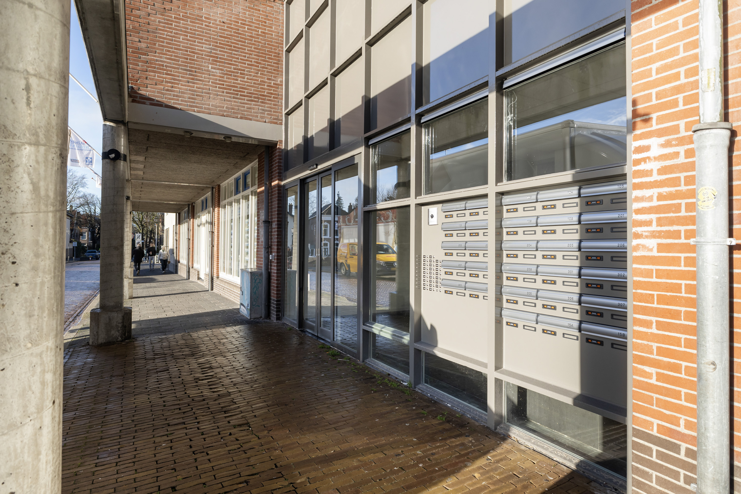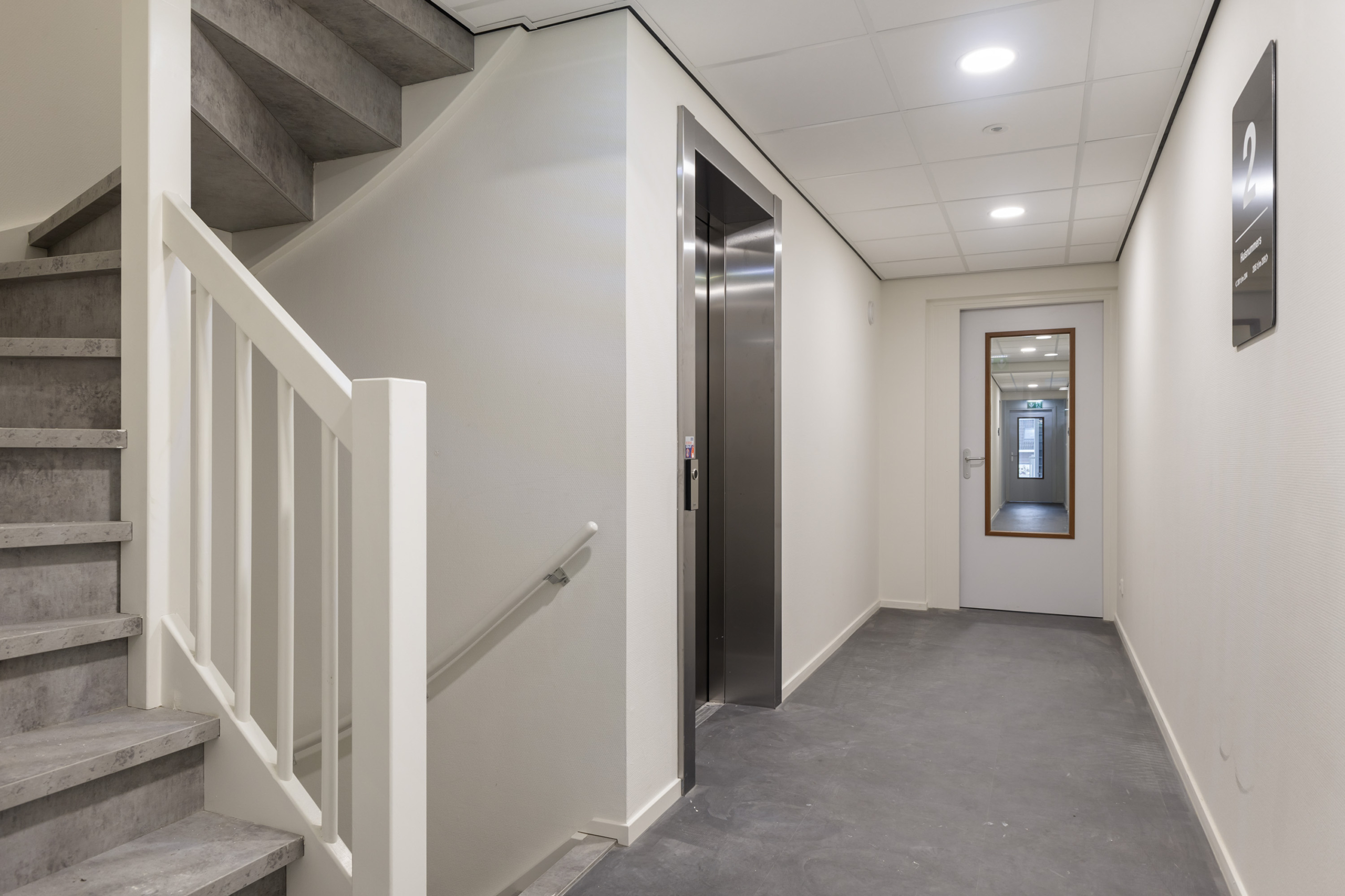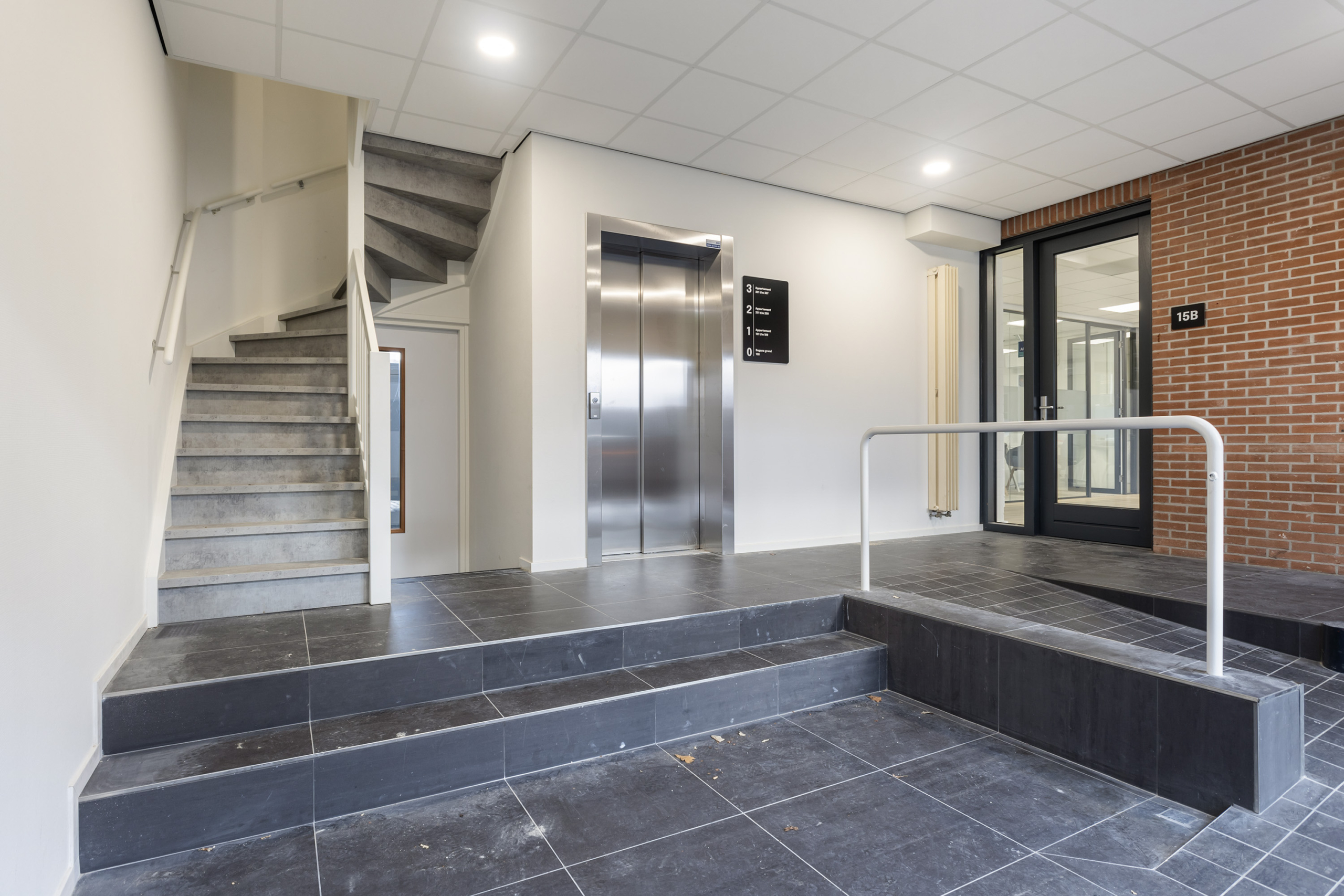begane grond: centrale hal met brievenbussen en bellentableau, afgesloten deur naar de liften, het trappenhuis en ruime gemeenschappelijke fietsenberging.