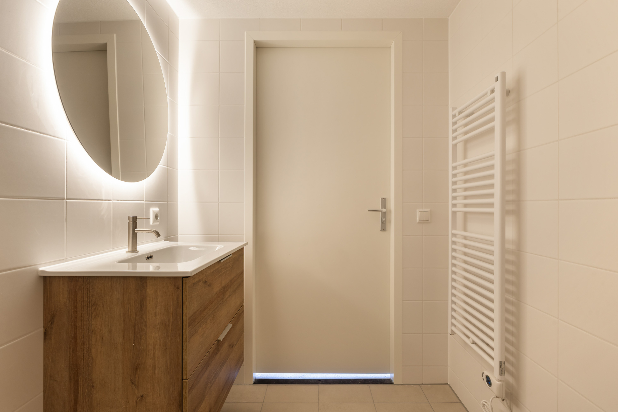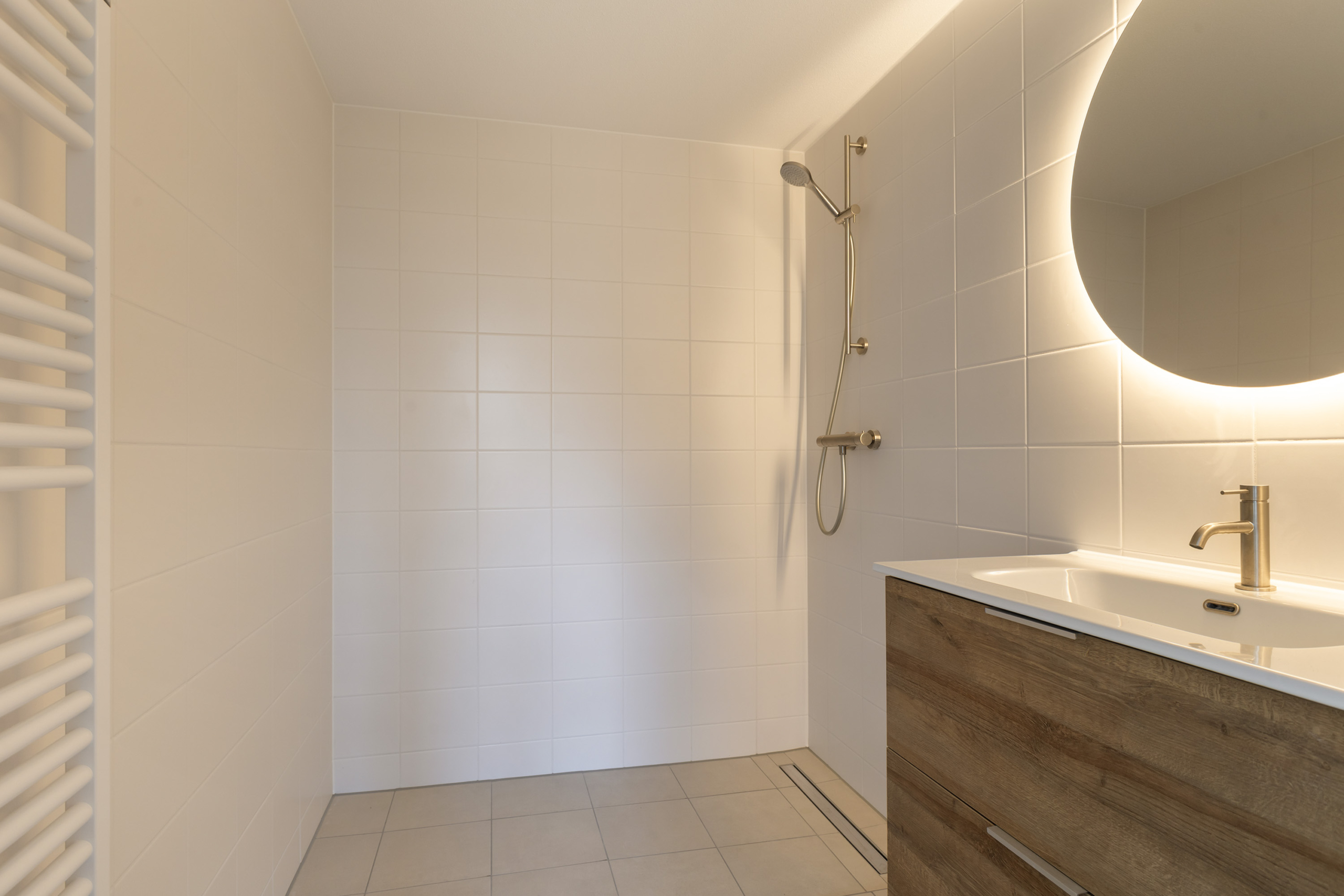 De slaapkamer ligt direct naast de moderne badkamer, terwijl het toilet separaat is geplaatst voor extra comfort.