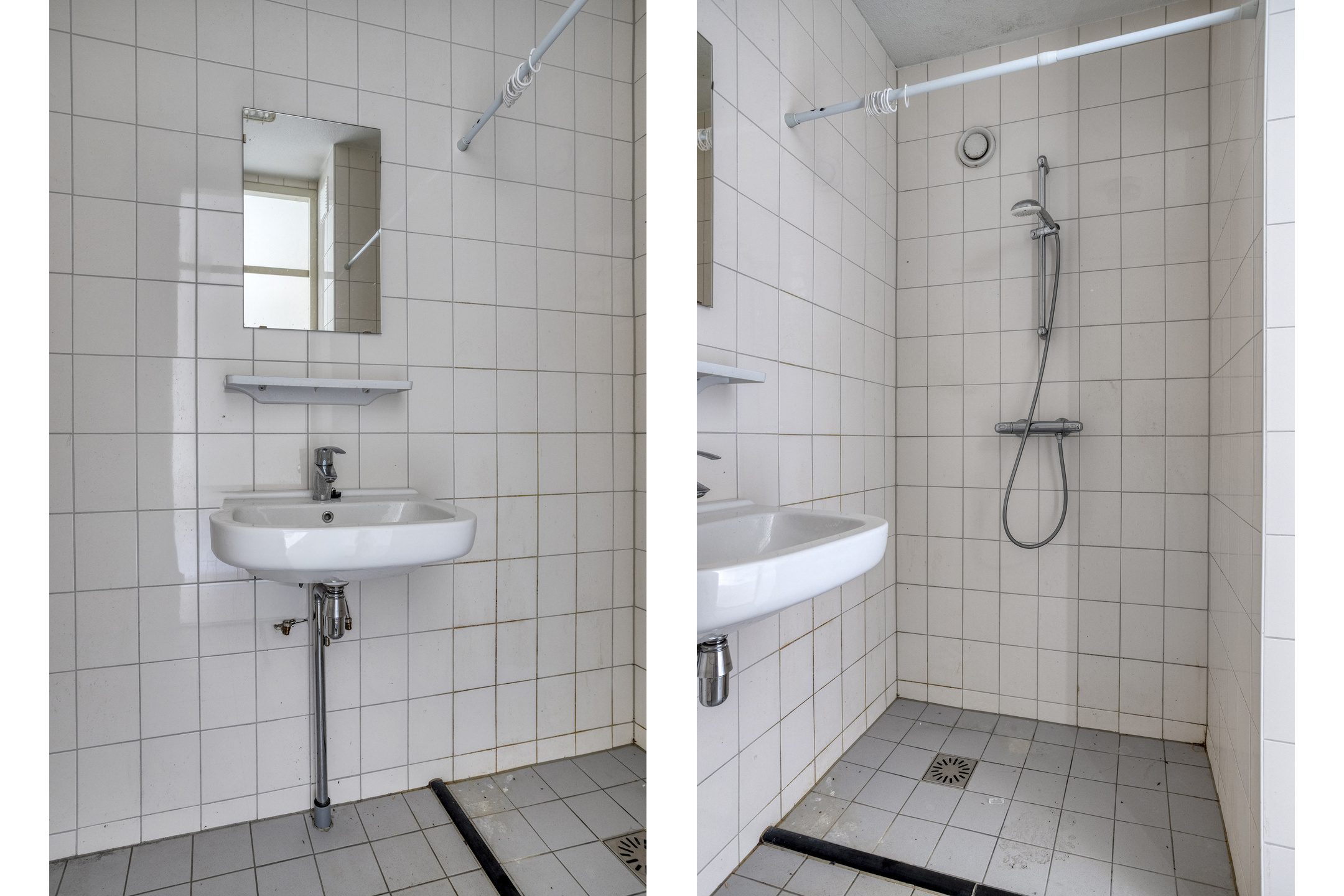 De badkamer beschikt over een douche, wastafel en aansluitingen voor de wasapparatuur.