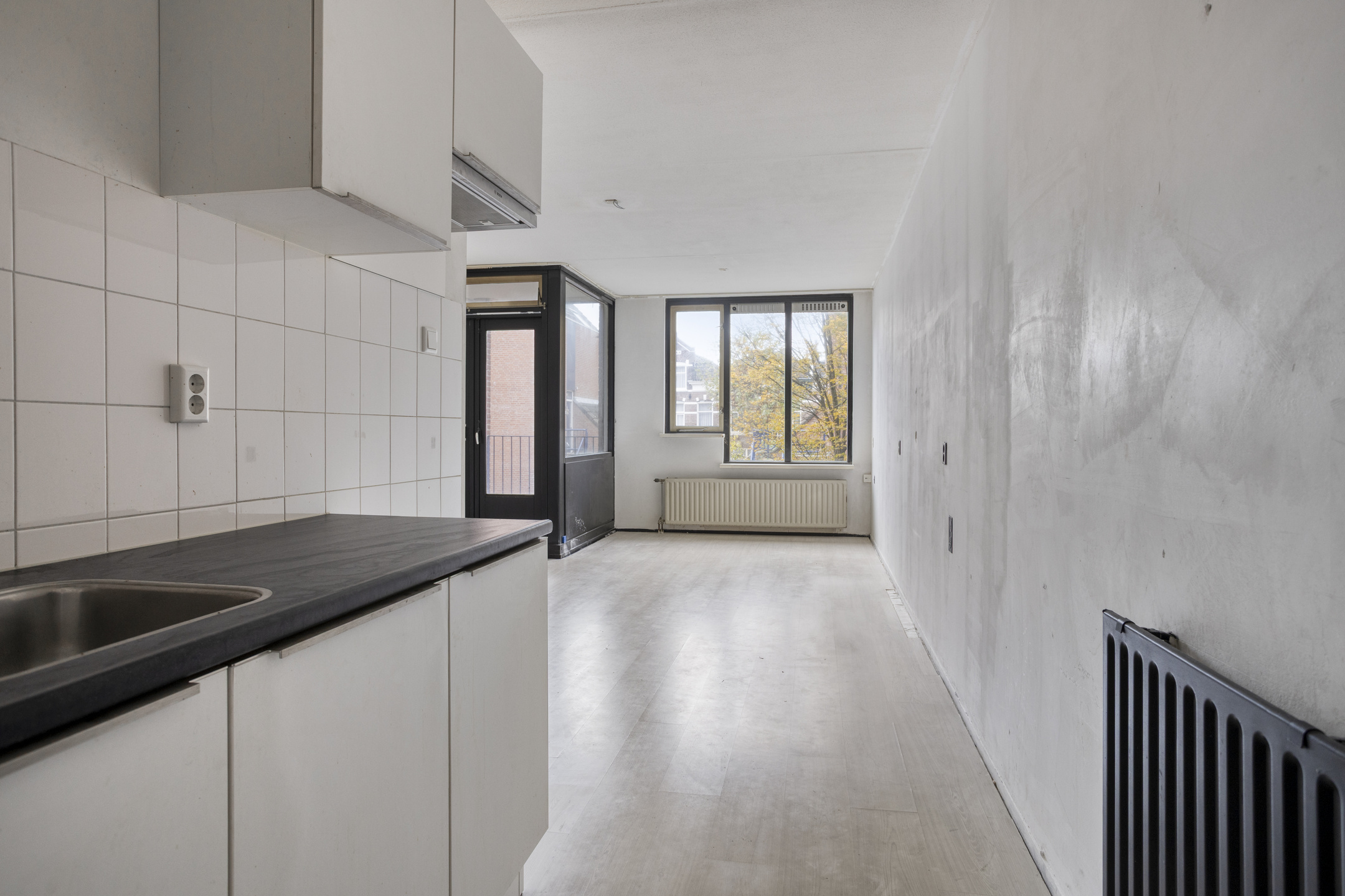 Appartement (eerste verdieping): Entree, gang met toegang tot alle vertrekken. De woonkamer is ruim en licht. Vanaf het balkon heb je uitzicht over het binnenhofje en de straat aan de voorzijde. De open keuken beschikt over een eenvoudig keukenblok met gootsteen en boiler.