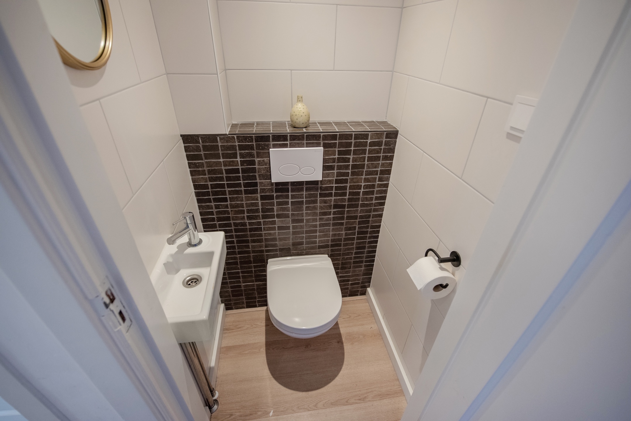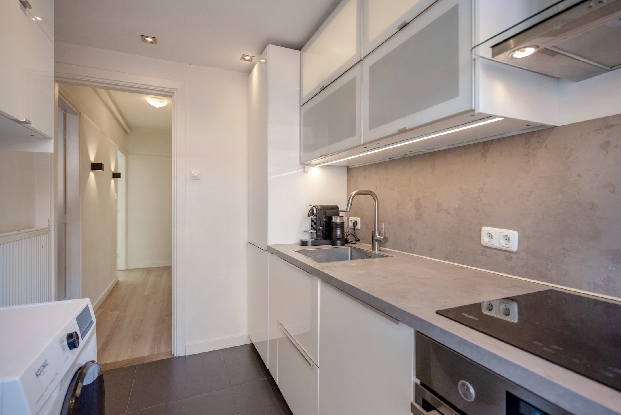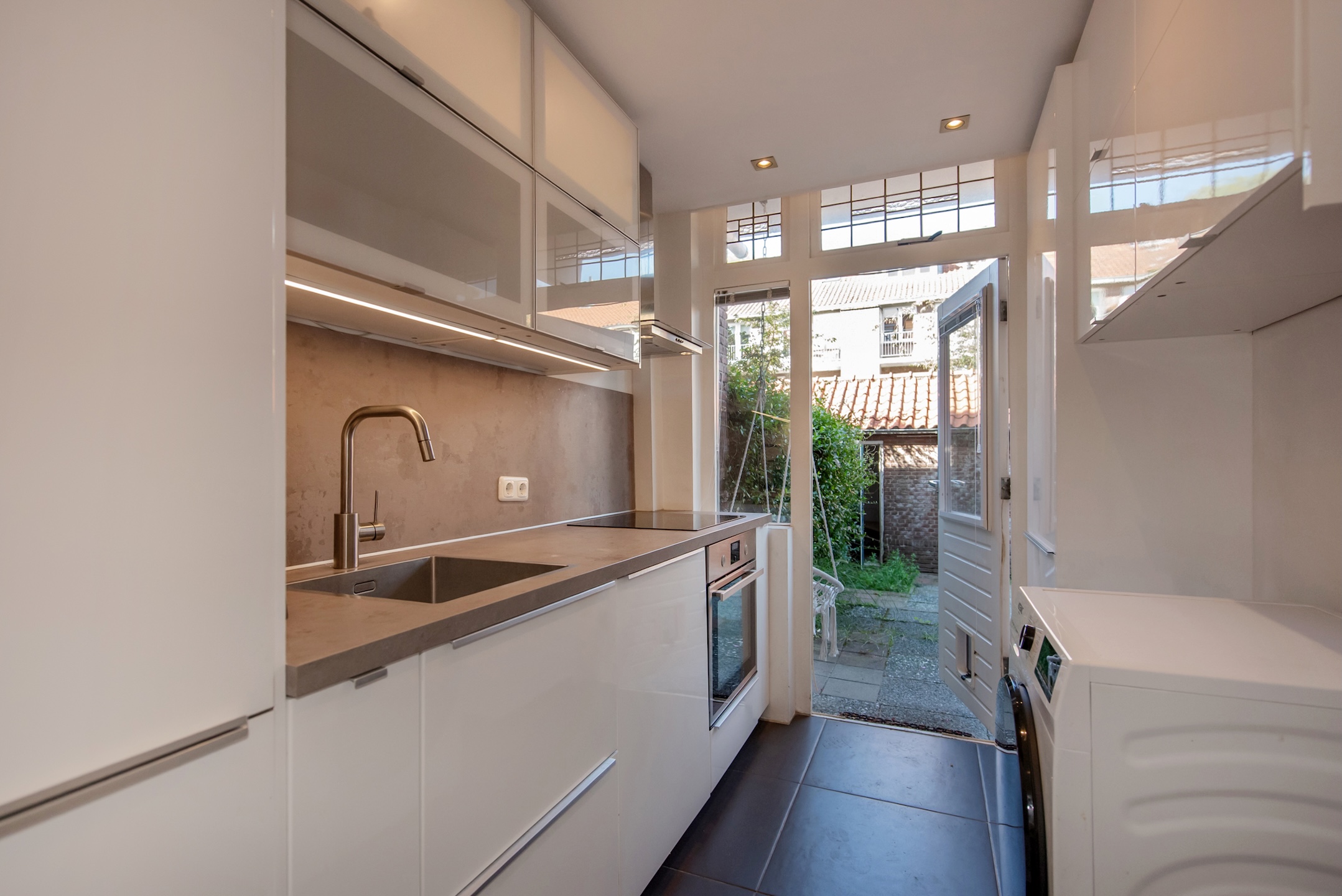 Moderne keuken: De keuken is modern ingericht met een hoogglans witte afwerking en voorzien van inbouwapparatuur, een aansluiting voor de wasmachine en een afgesloten ruimte voor de CV-combiketel.