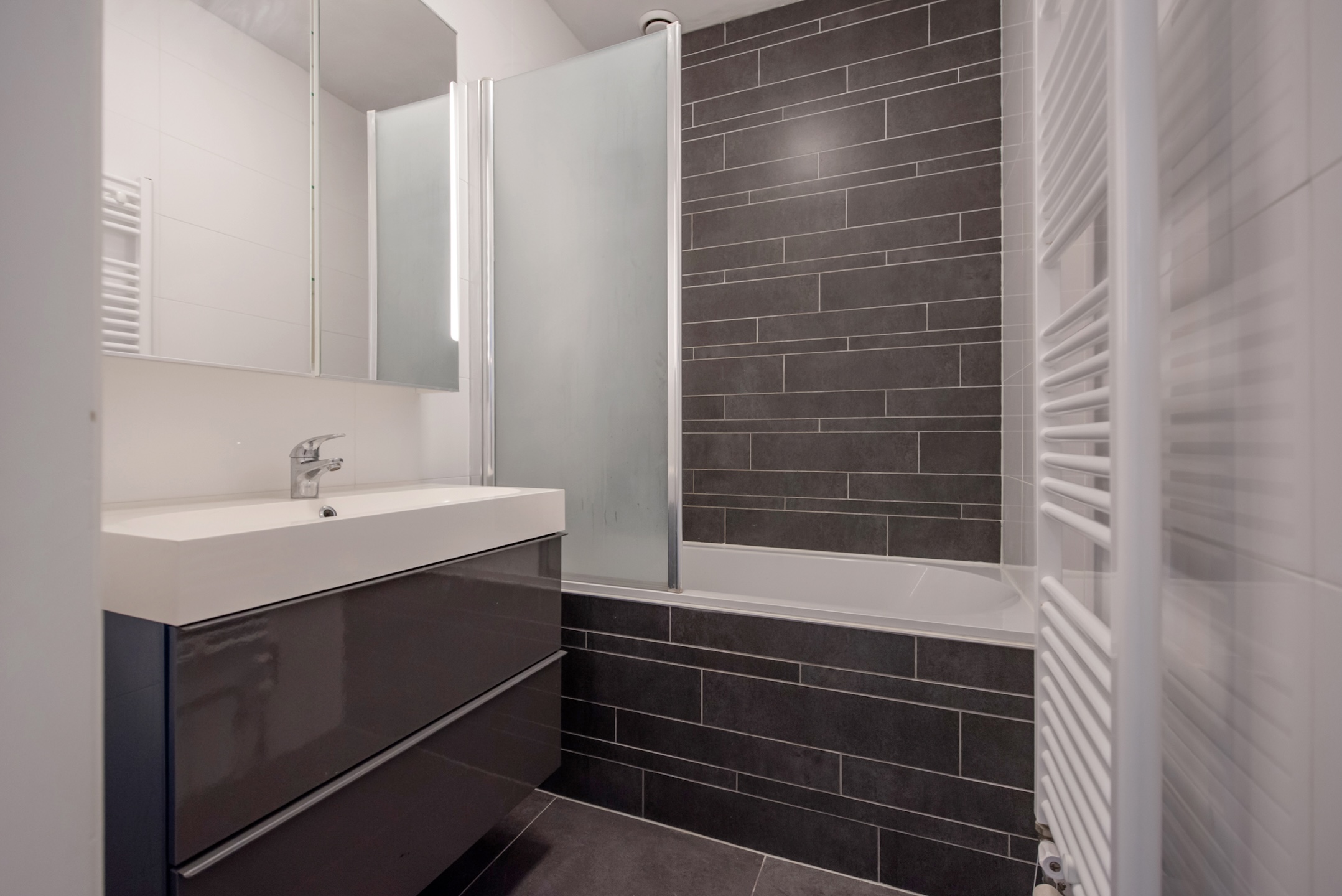 Moderne badkamer: De strak afgewerkte badkamer beschikt over een wastafelmeubel, een comfortabel ligbad met douchescherm en modern sanitair.