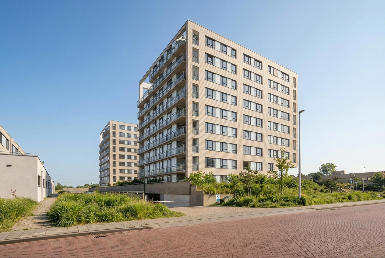 This modern three-room corner apartment is located on the 7th floor of the popular “Santfort” apartment complex, adjacent to the dunes and built in 2021. The high-quality finishes reflect contemporary standards of luxury and sustainability. The spacious, light-filled living room, the luxurious kitchen with an island and ceramic countertop, the plastered ceilings with dimmable recessed spotlights, and the balcony together form the heart of the home. Additionally, it features two comfortable bedrooms with custom-made wardrobes, a luxurious bathroom with a freestanding bathtub, a separate toilet, and a technical room with connections for a washing machine and dryer. In every room, you’ll enjoy comfortable underfloor heating that can be set independently per room. Extra comforts include your own storage room, a covered parking space, and a communal bicycle storage area in the basement.