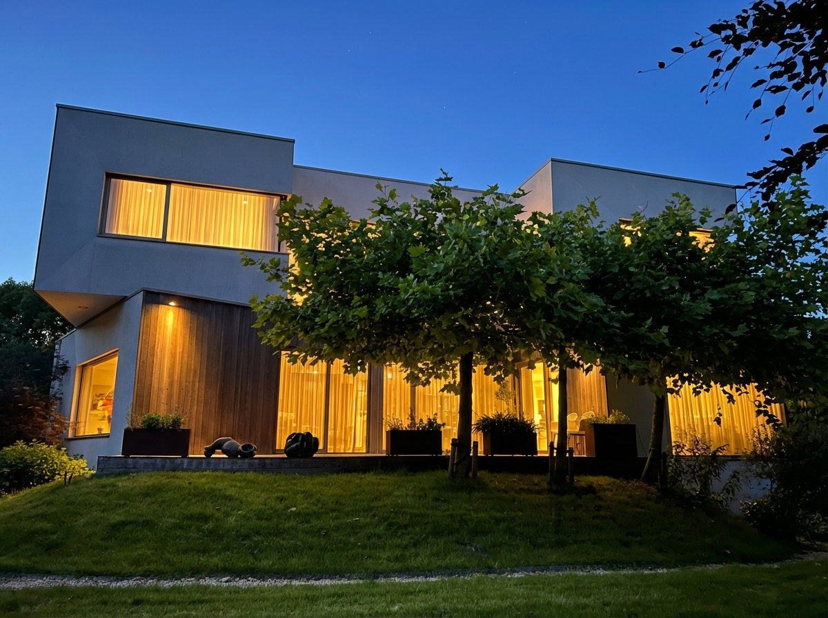 Het volledig benut souterrain biedt twee extra slaapkamers, ideaal voor gasten, tieners of een au-pair. Hier bevindt zich ook de derde badkamer met inloopdouche en wastafel, een separaat toilet en de technische ruimte met de hoogwaardige Nibe warmtepomp, waterontharder en installaties voor warm water en ventilatie. Vanuit het souterrain is er directe toegang tot de ruime inpandige garage met plaats voor drie auto’s en een laadpaal.