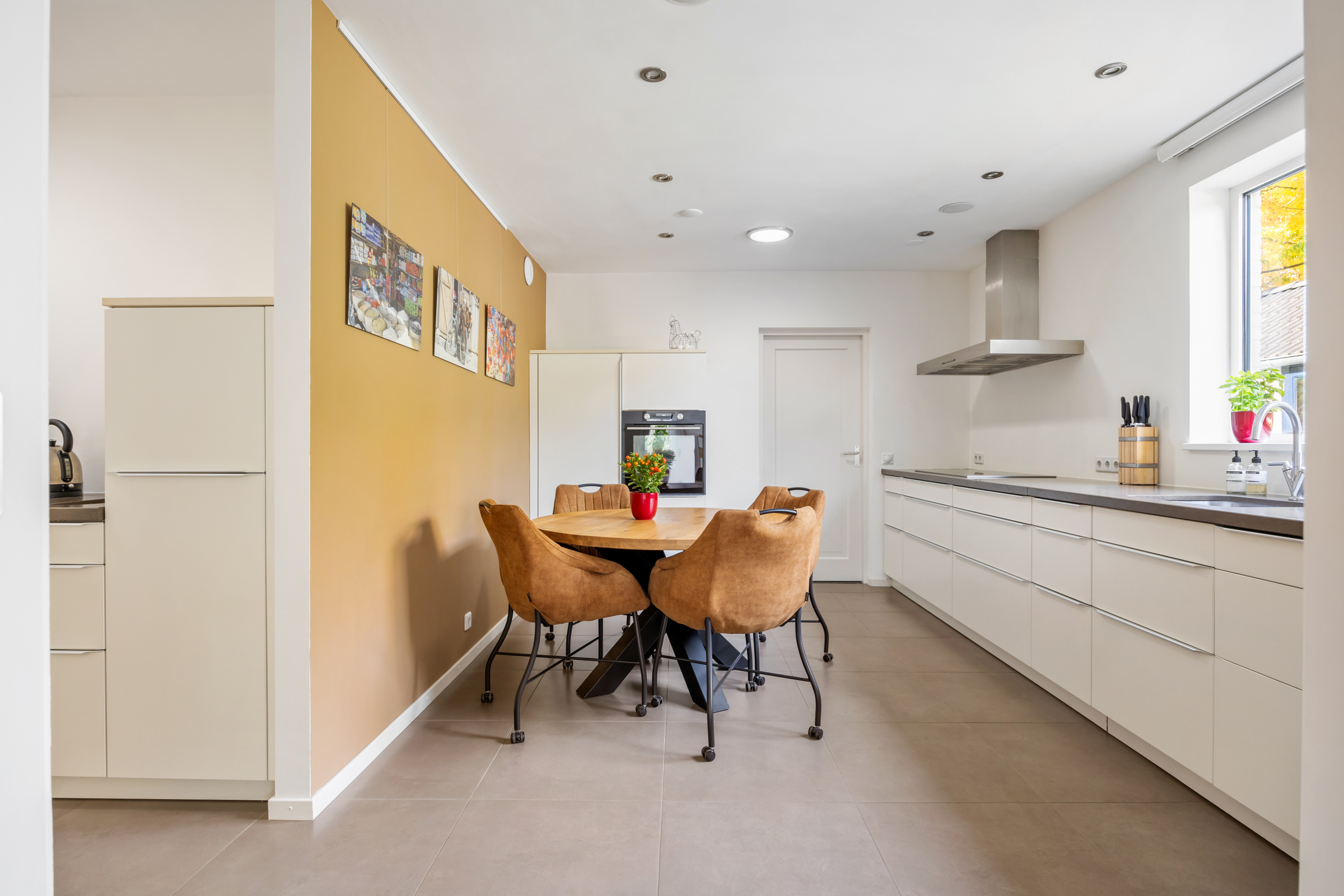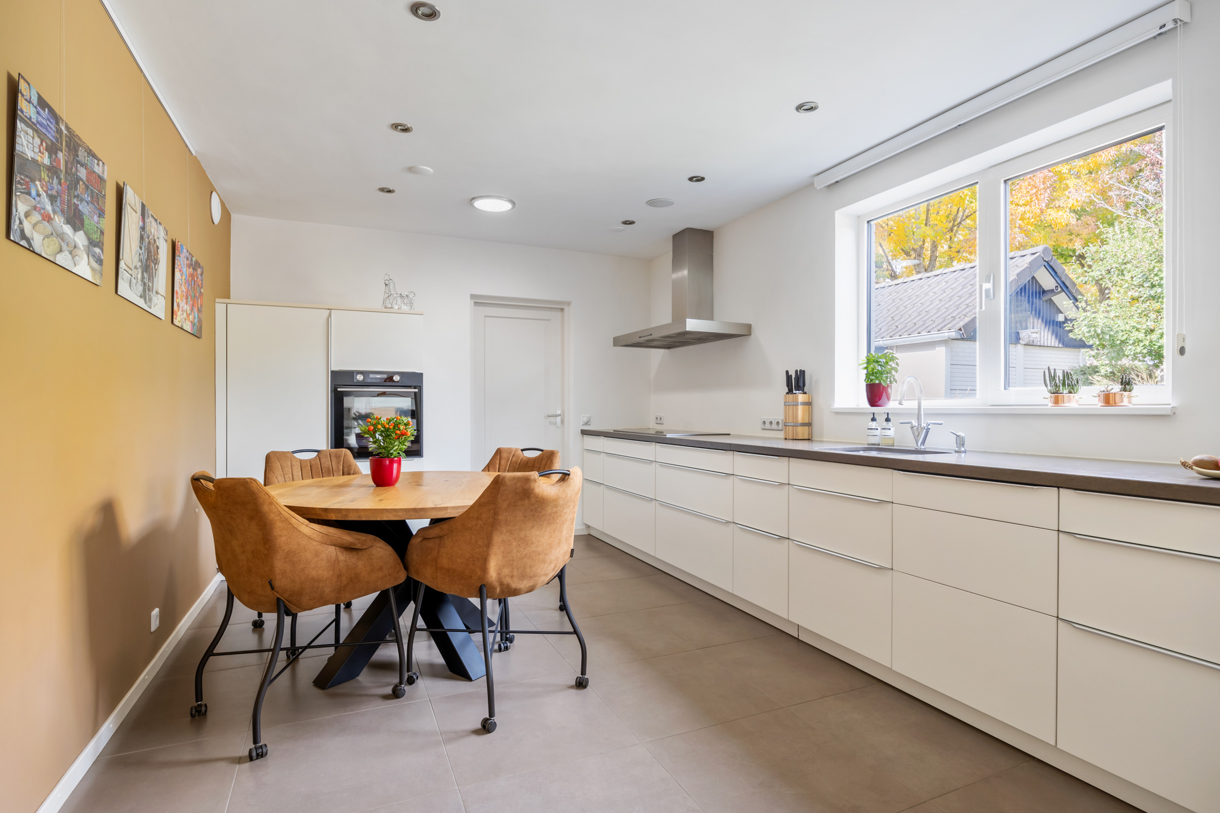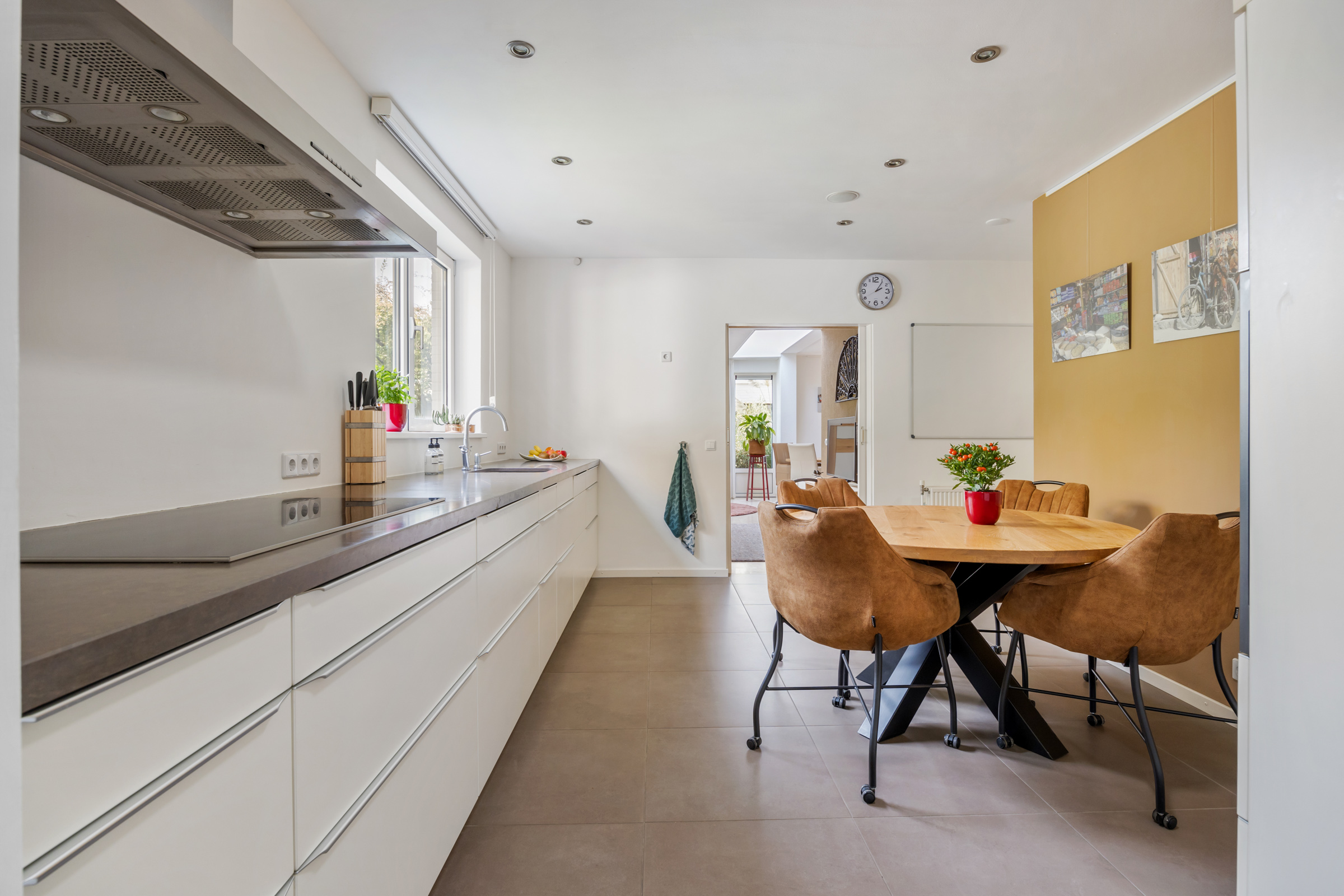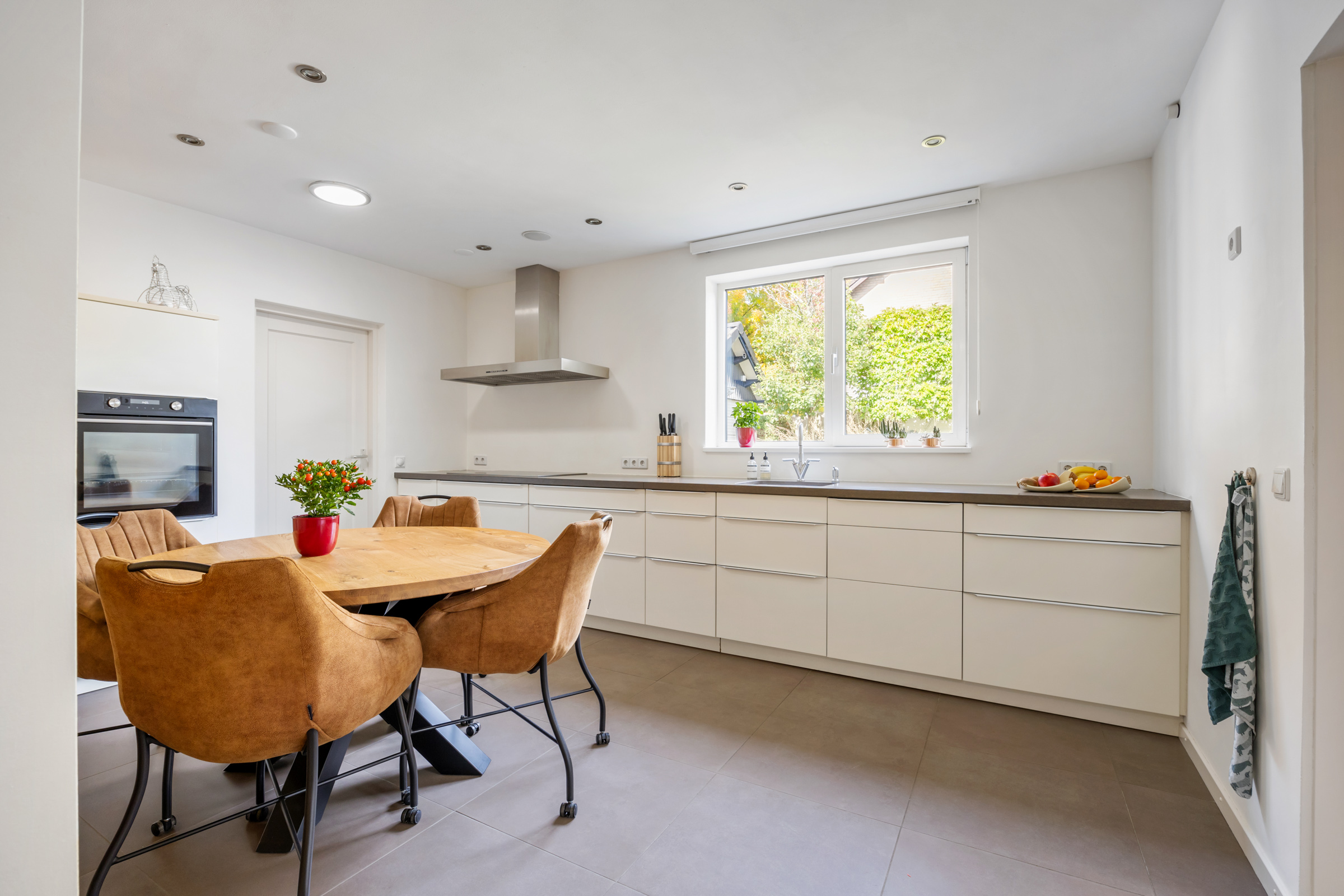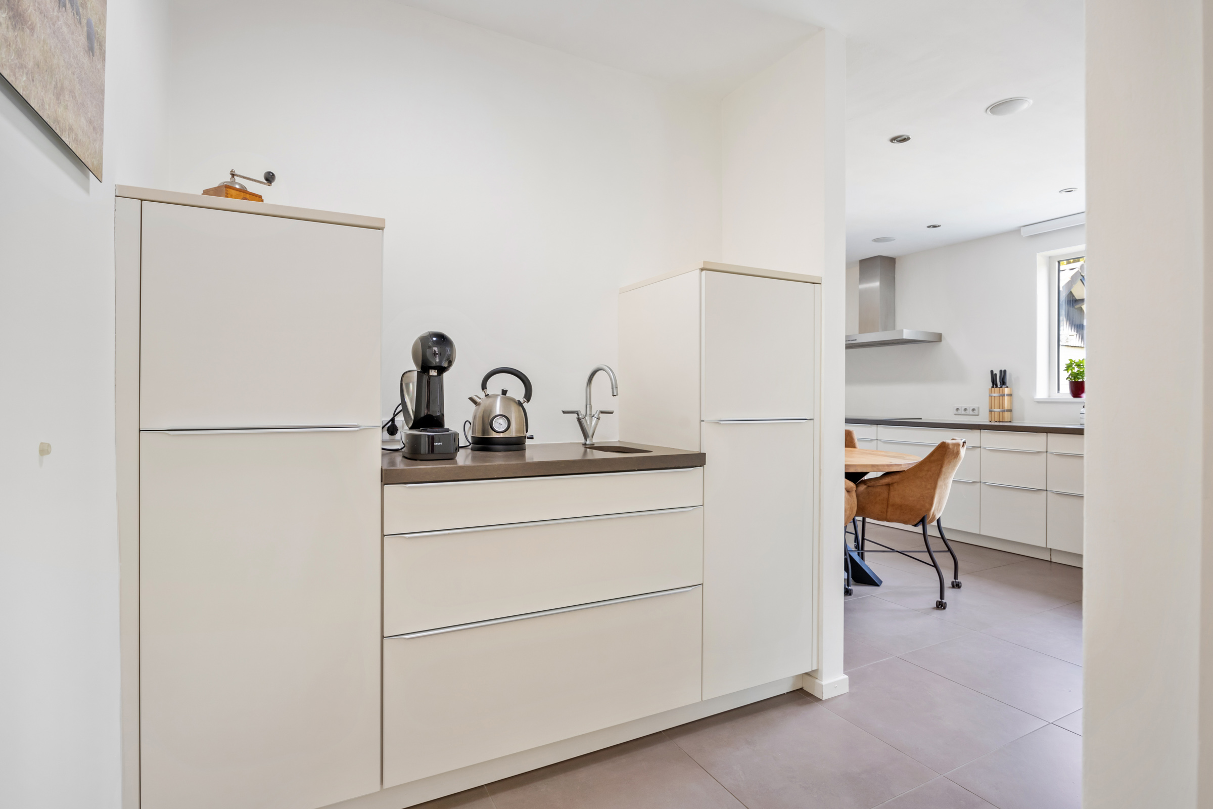 Aansluitend aan de woonkamer bevindt zich de woonkeuken, deze is voorzien van een recht aanrechtblad en verschillende ingebouwde apparatuur waaronder; een inductiekookplaat, afzuigkap, oven, vaatwasmachine en koelkast. Zowel de vaatwasmachine, oven en de kookplaat zijn in 2023 vernieuwd. Via een open verbinding vanuit de keuken alsook via een deur vanuit de woonkamer is de ‘coffee-corner’ met aanrechtblad, kleine gootsteen en extra kastruimte toegankelijk, deze maakt onderdeel uit van de keukeninrichting. Er zijn ook nog een praktische bijkeuken met gootsteen en ingebouwde kasten aanwezig alsook een inpandig bereikbare garage.