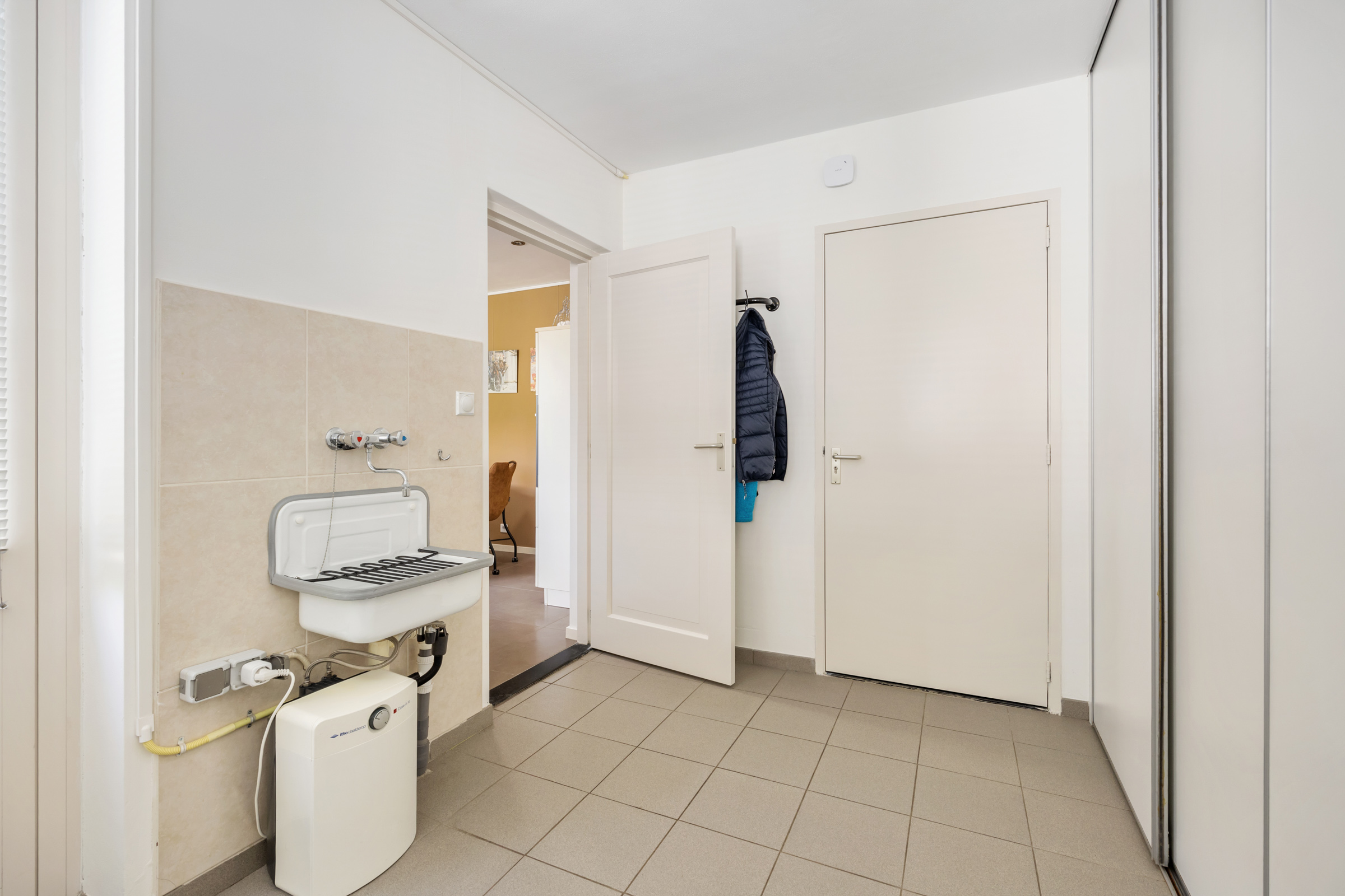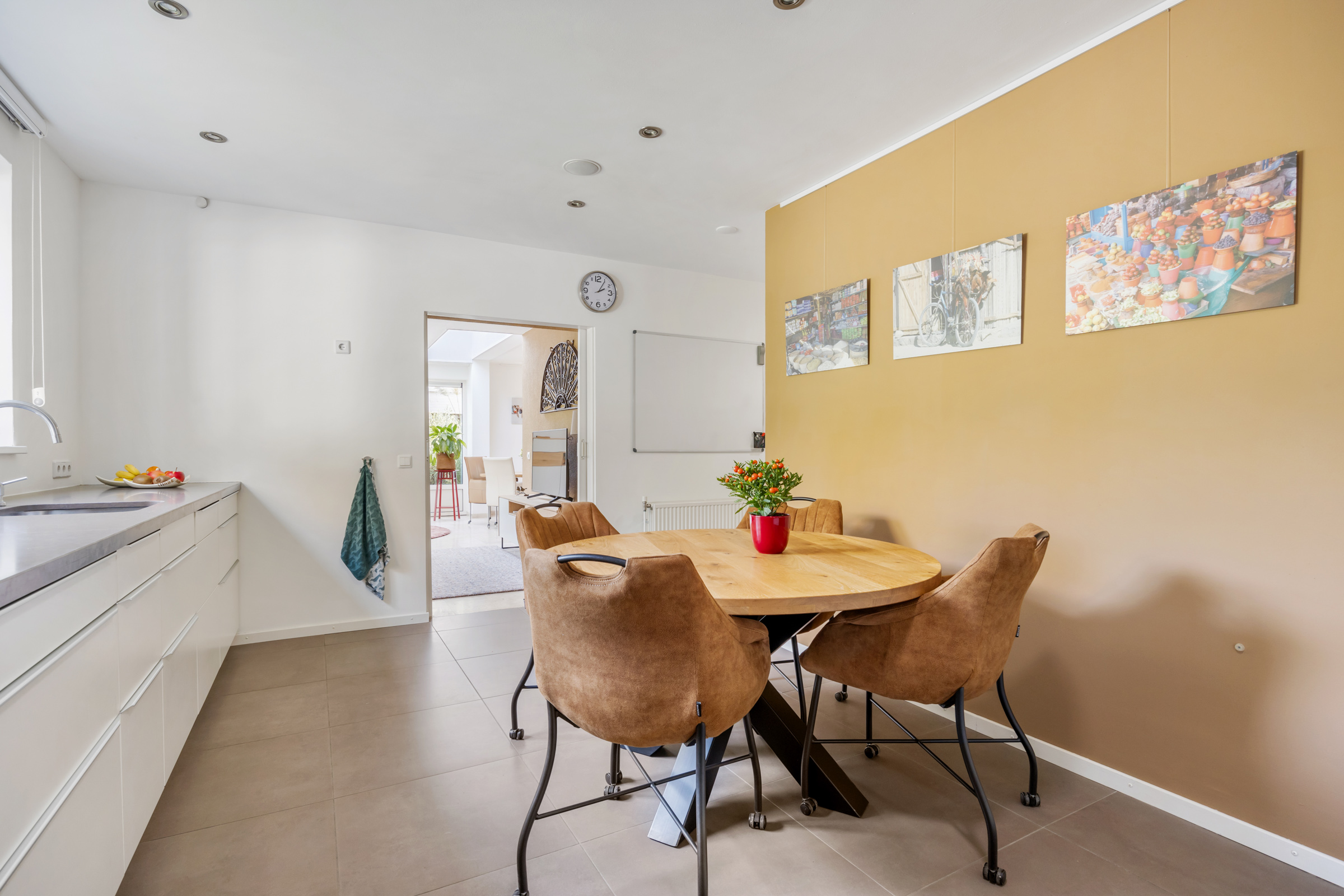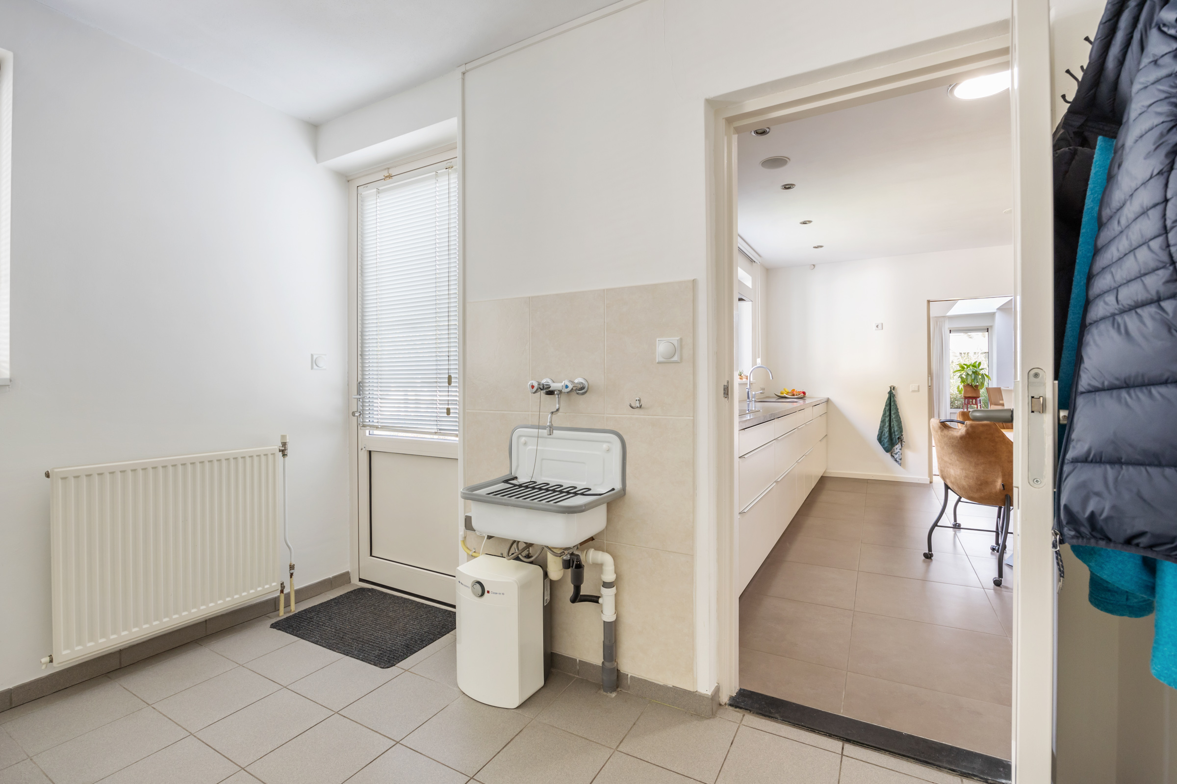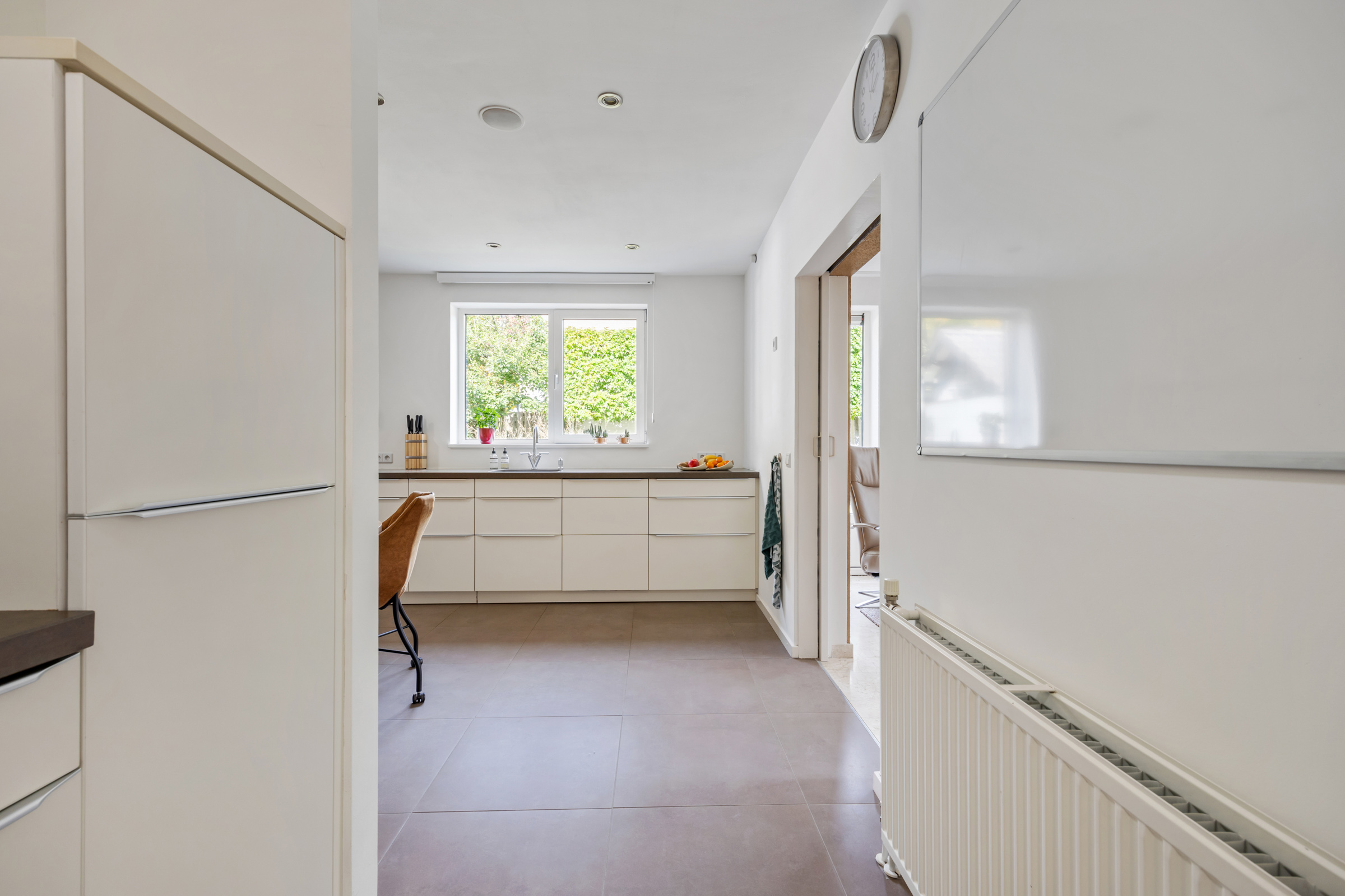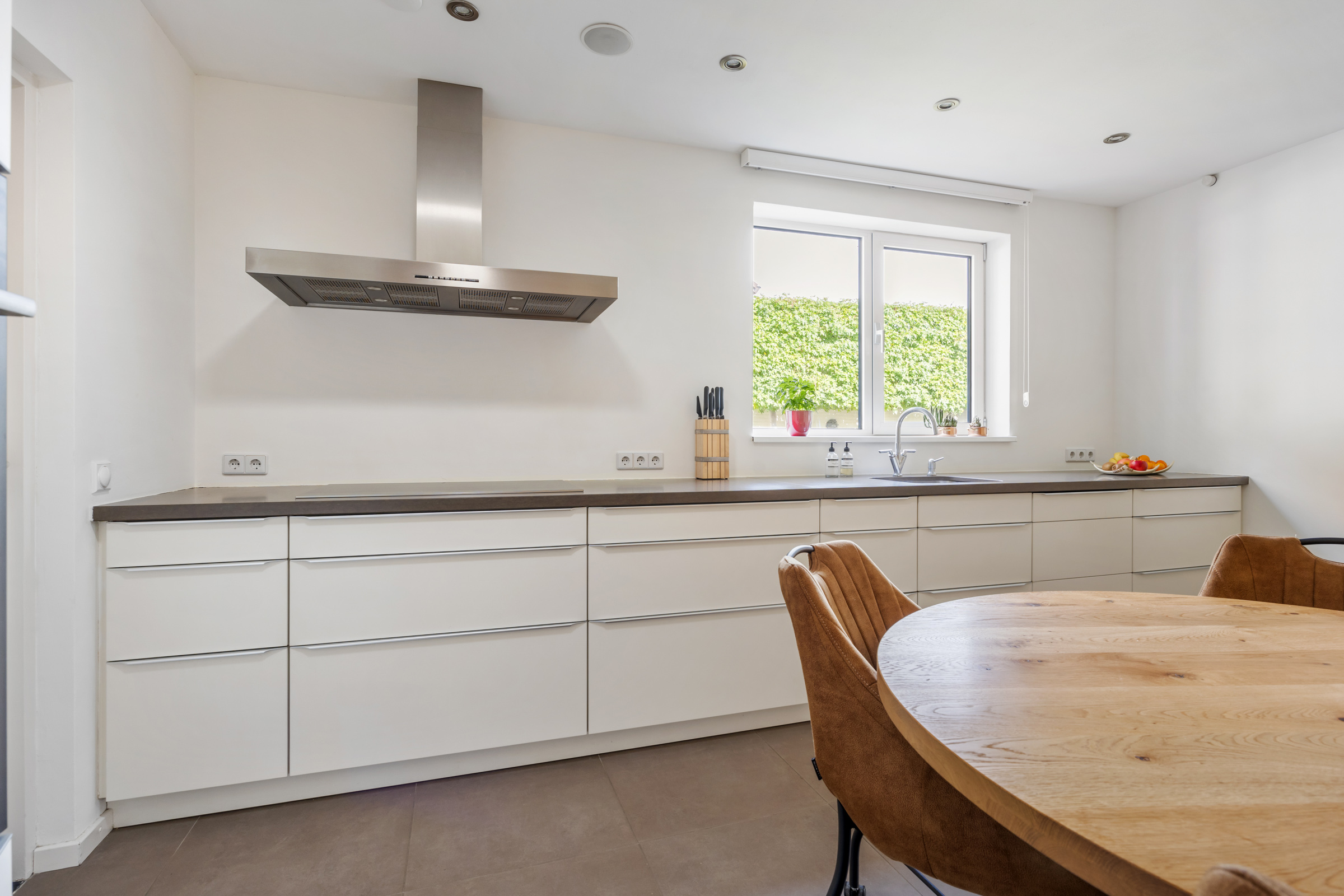 Aansluitend aan de woonkamer bevindt zich de woonkeuken, deze is voorzien van een recht aanrechtblad en verschillende ingebouwde apparatuur waaronder; een inductiekookplaat, afzuigkap, oven, vaatwasmachine en koelkast. Zowel de vaatwasmachine, oven en de kookplaat zijn in 2023 vernieuwd. Via een open verbinding vanuit de keuken alsook via een deur vanuit de woonkamer is de ‘coffee-corner’ met aanrechtblad, kleine gootsteen en extra kastruimte toegankelijk, deze maakt onderdeel uit van de keukeninrichting. Er zijn ook nog een praktische bijkeuken met gootsteen en ingebouwde kasten aanwezig alsook een inpandig bereikbare garage.