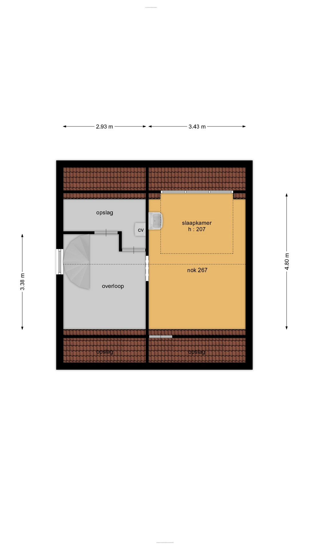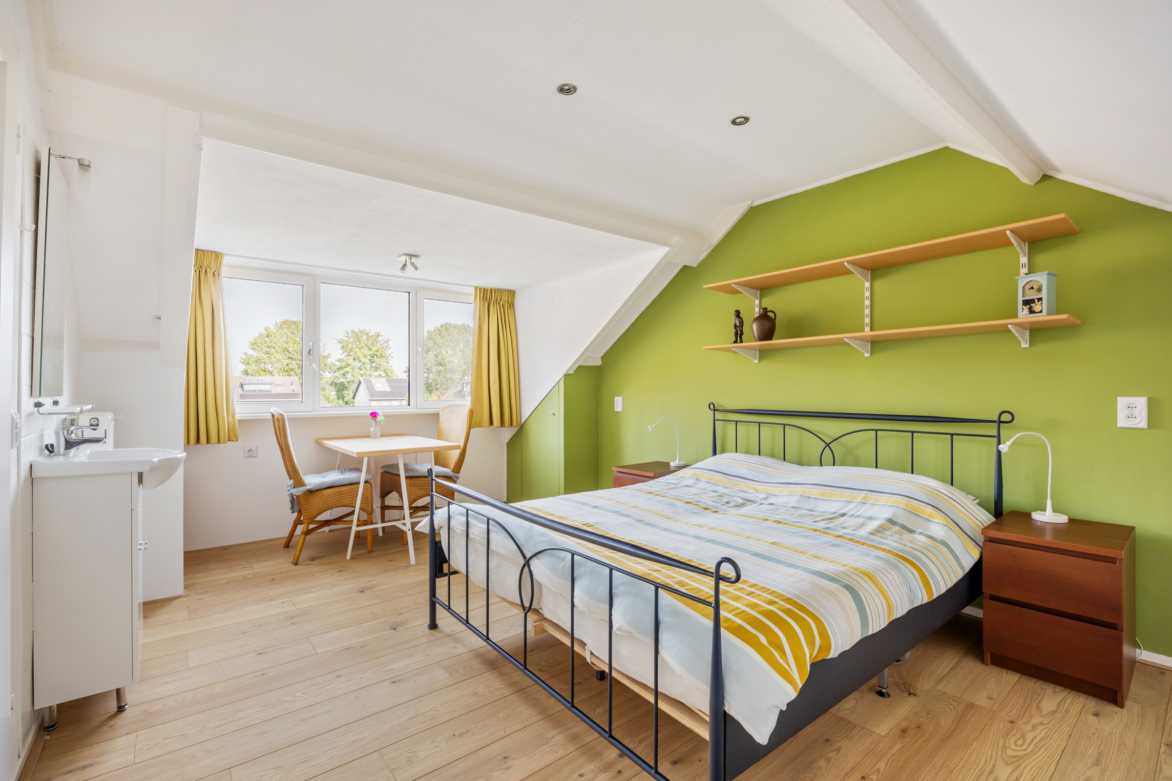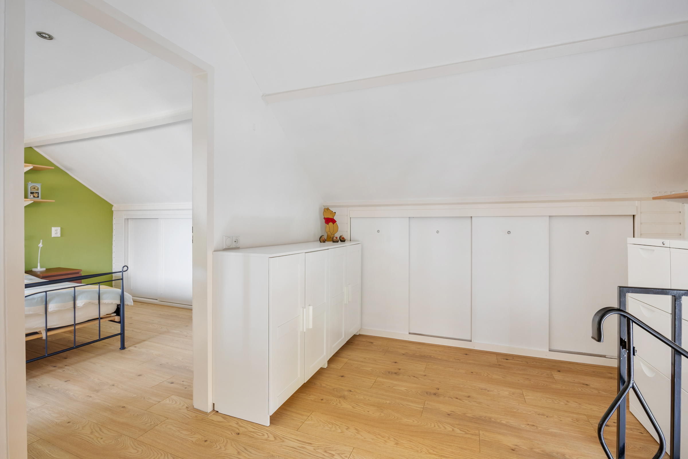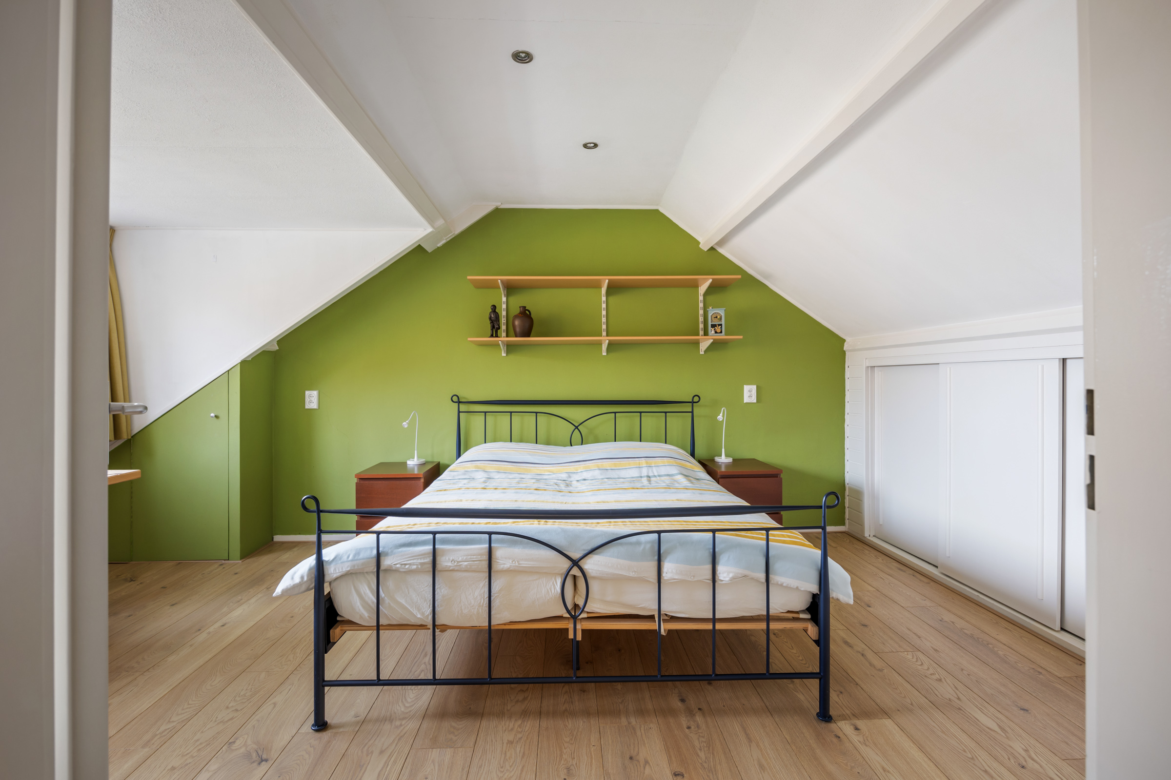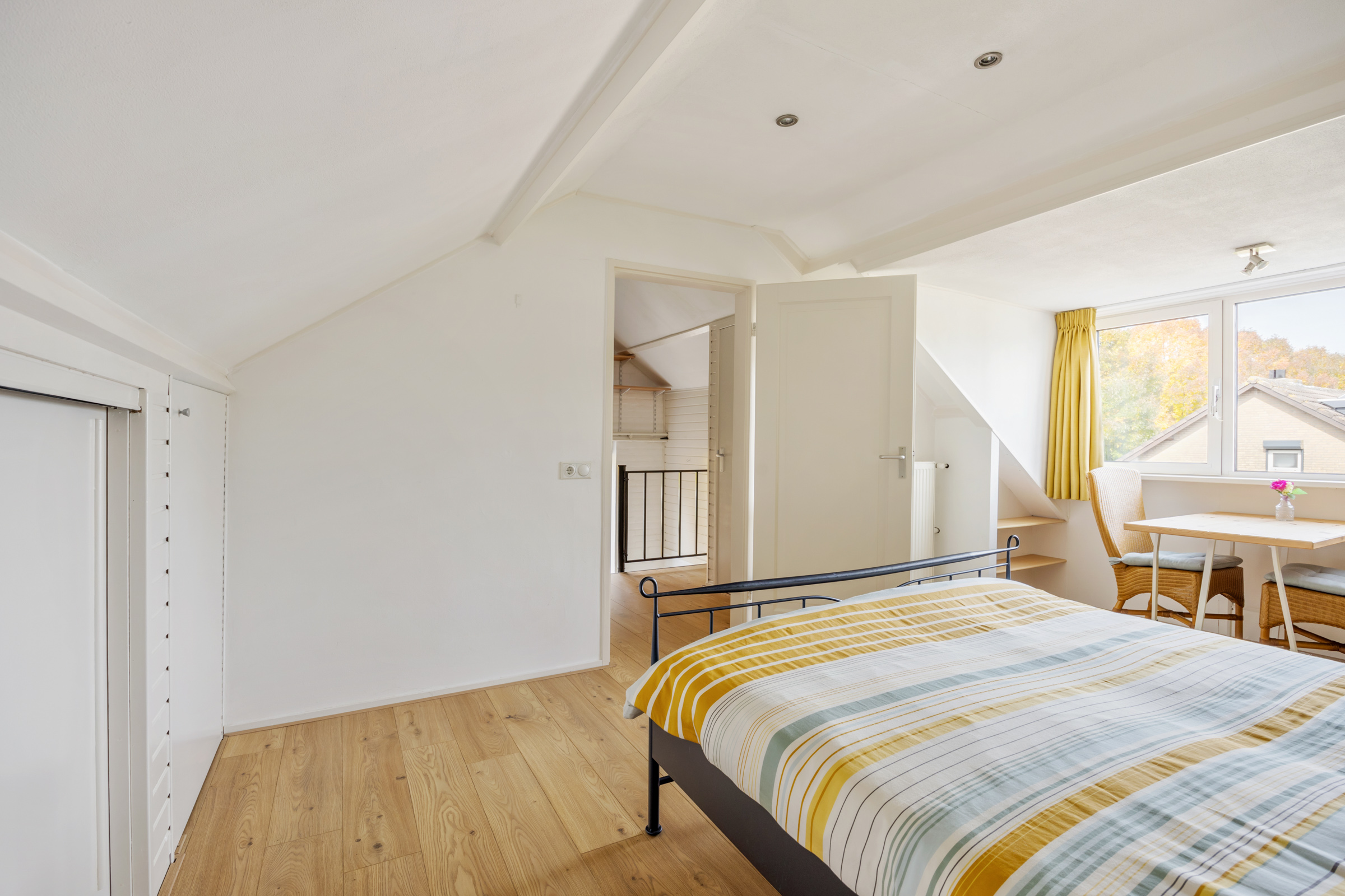 Overloop met toegang tot een berging en een ruime zolderslaapkamer ca. 13 m2 voorzien van een dakkapel en bergruimte achter de knieschotten.