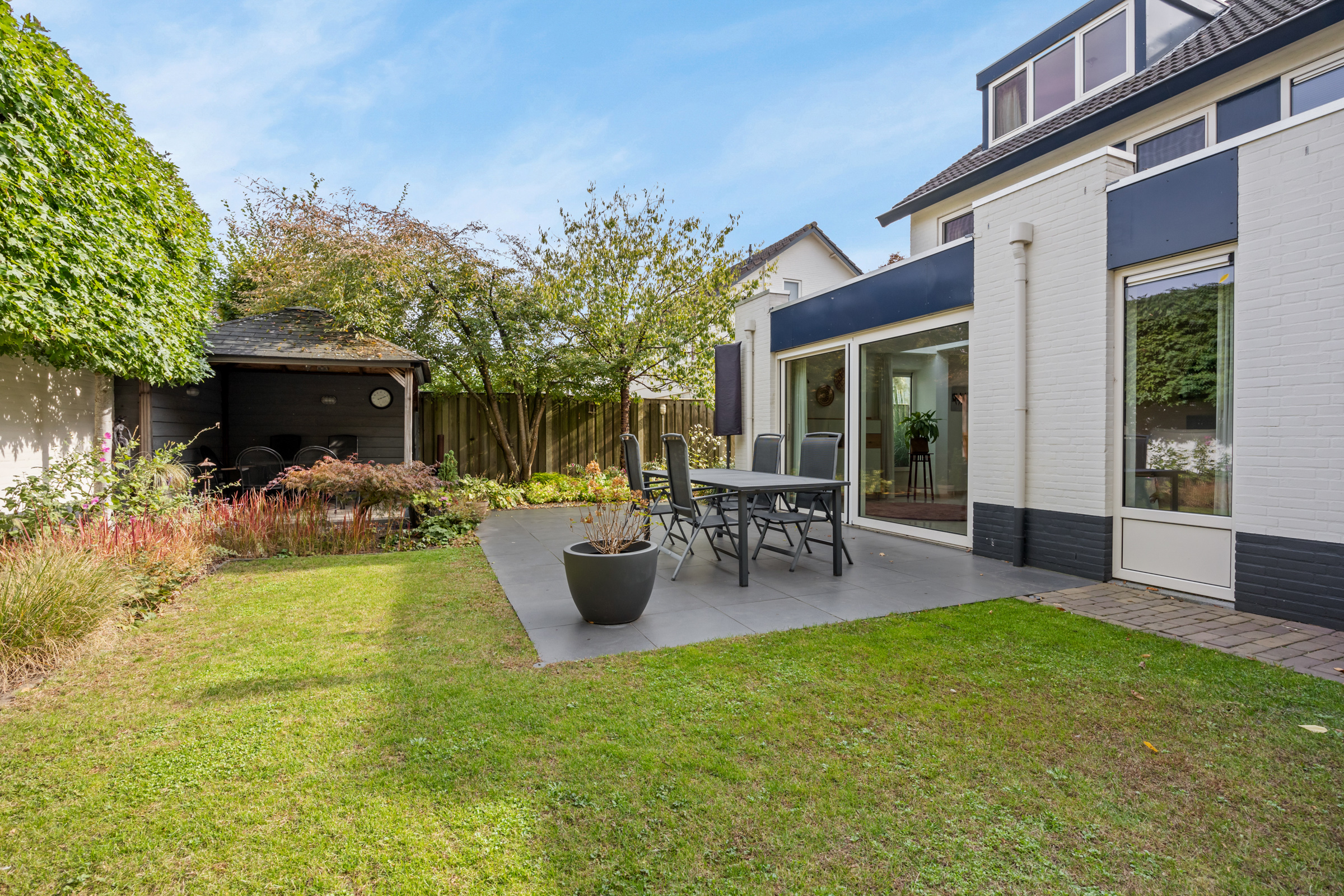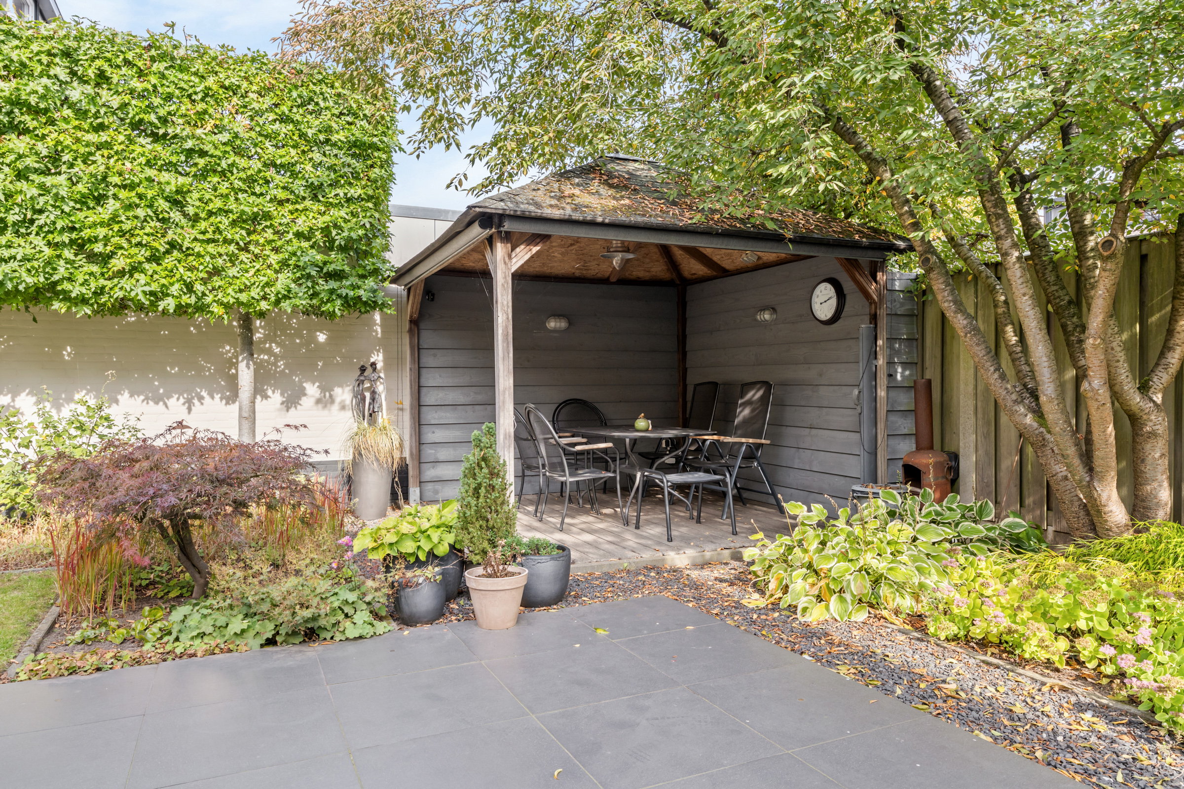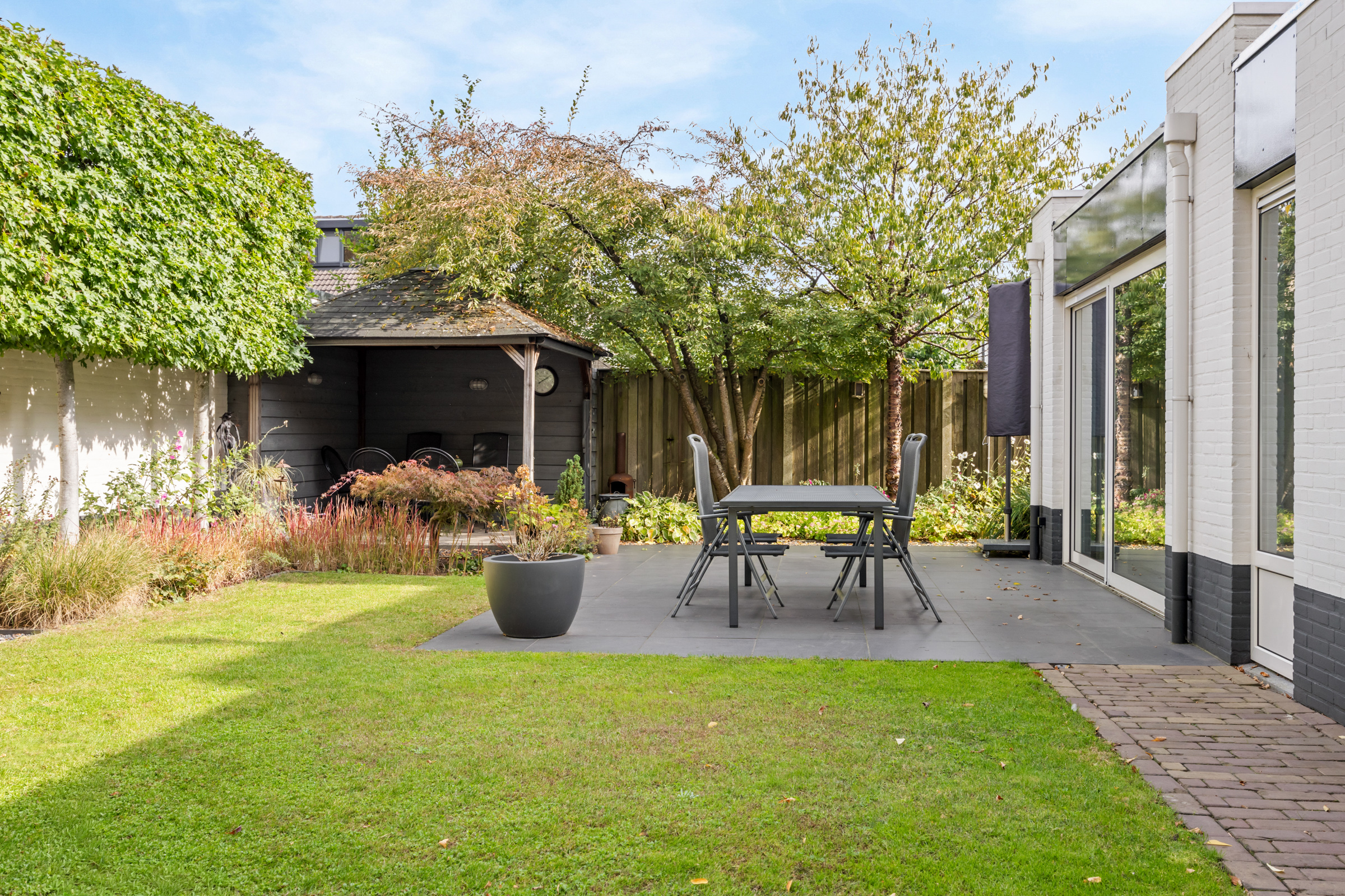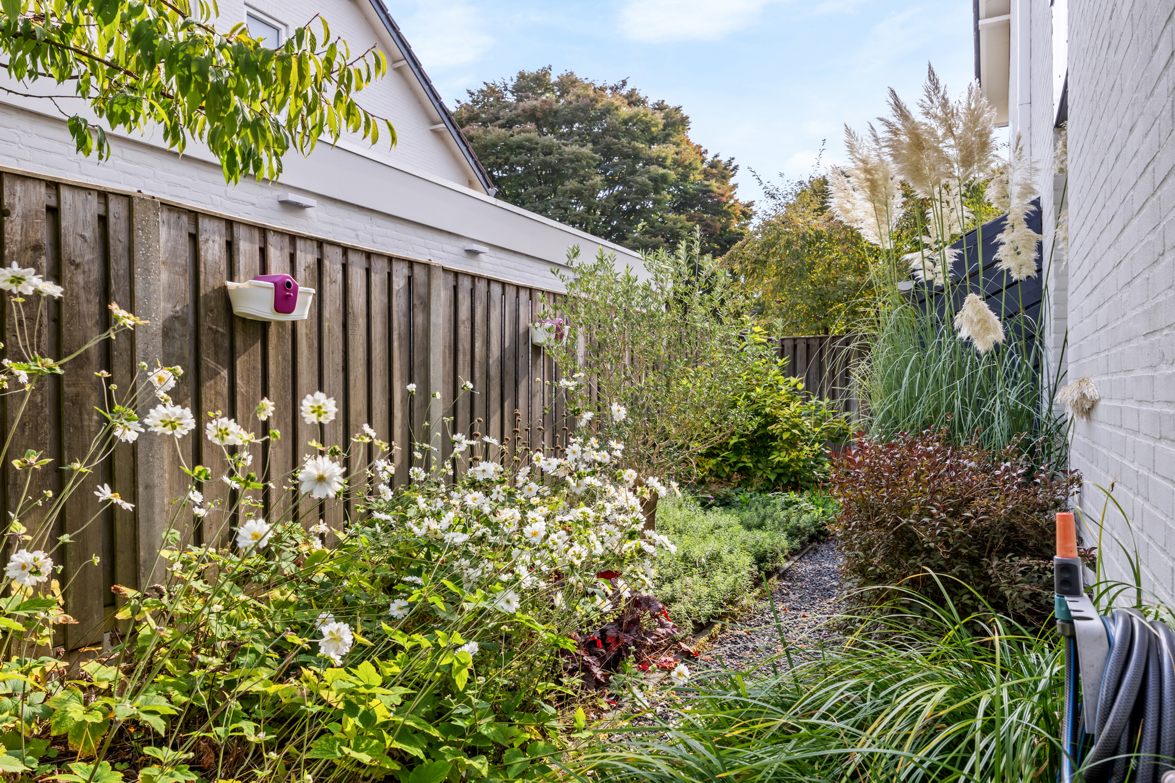De woning beschikt over een fraai aangelegde tuin met meerdere terrassen, overkapping en een gazon. De tuin is ook voorzien van diverse beplanting en biedt veel privacy. Daarnaast is er een handige berging voor het opbergen van bijvoorbeeld tuingereedschap.