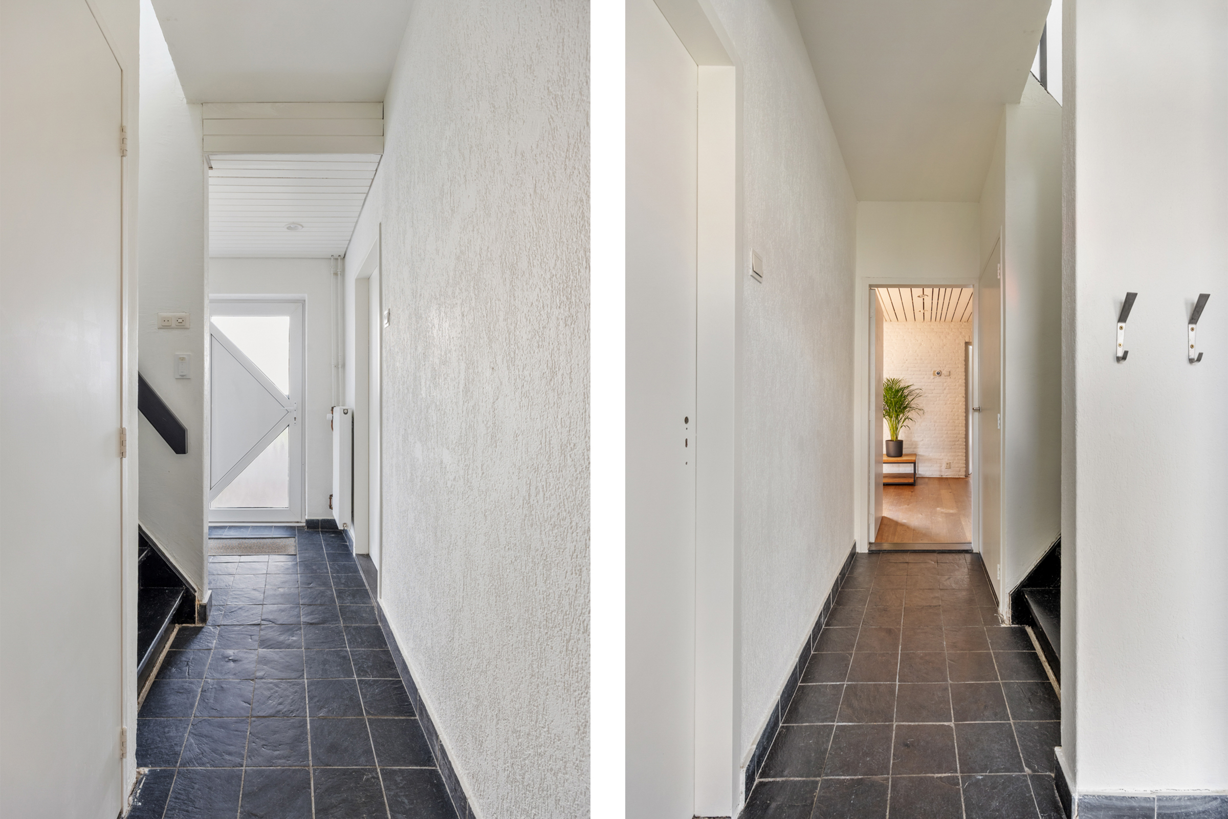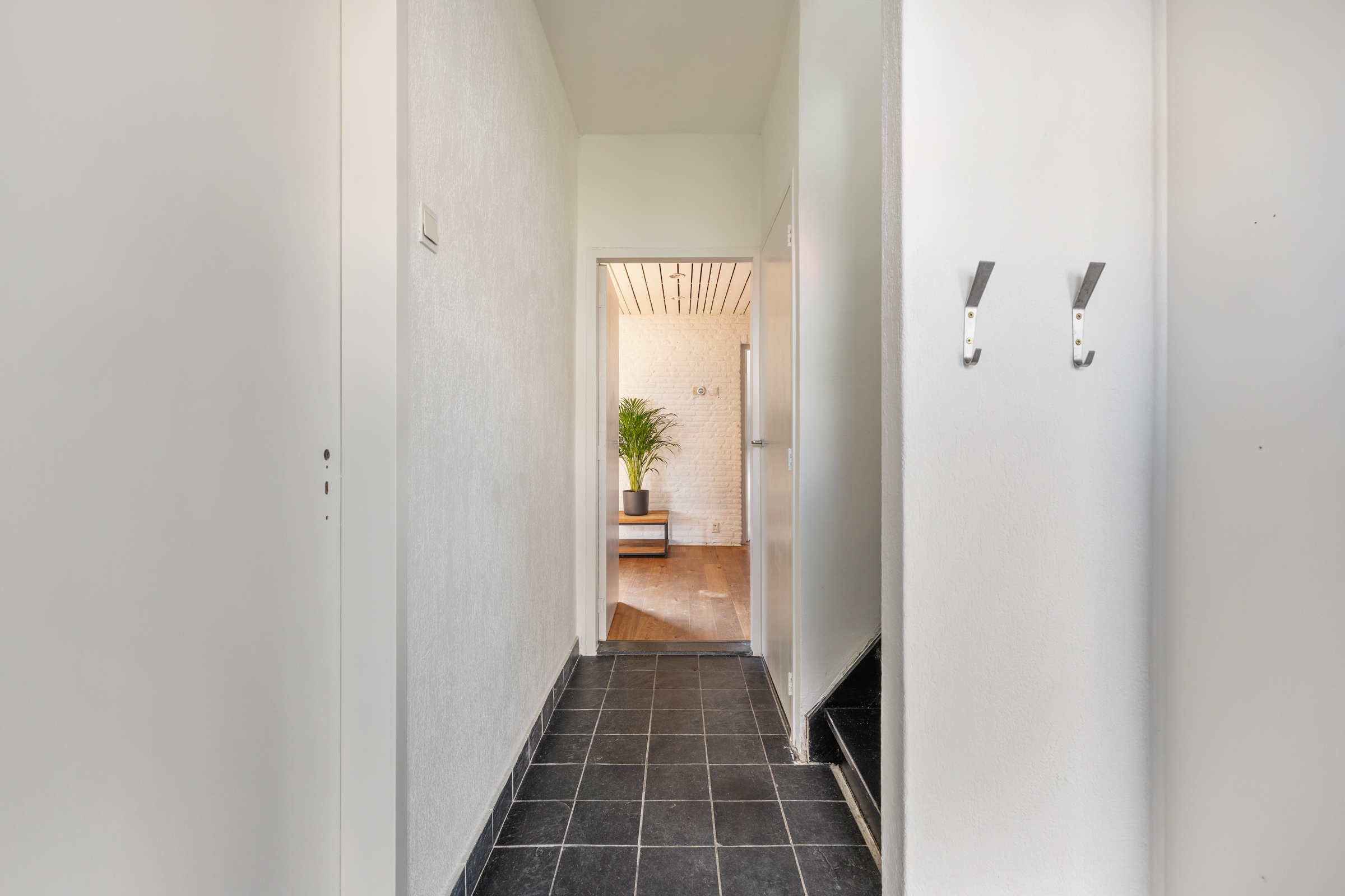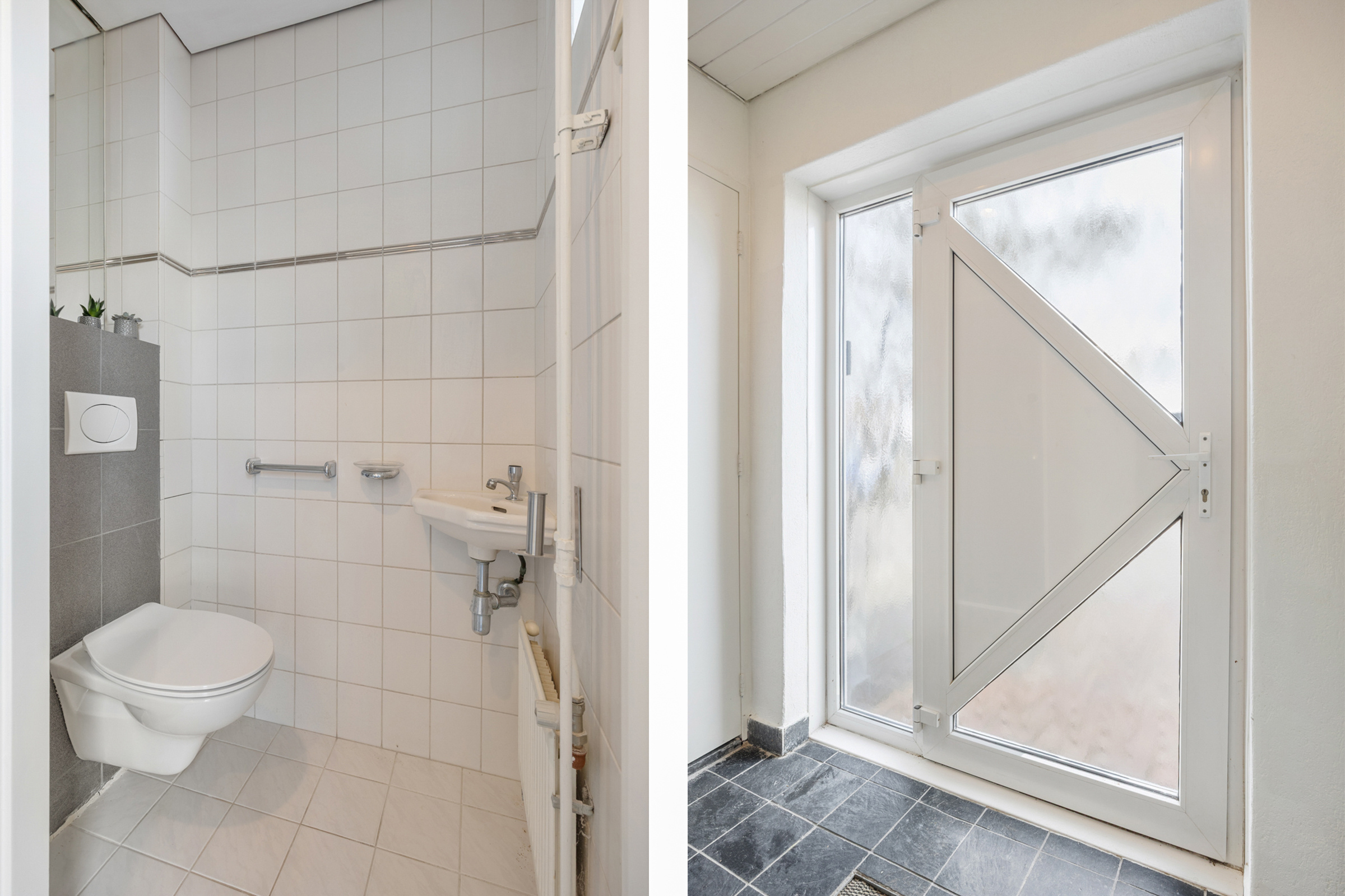 Entree met betegelde vloer en meterkast (8 groepen), verdiepte kelderkast en betegeld toilet met vrijhangend closet en fonteintje.