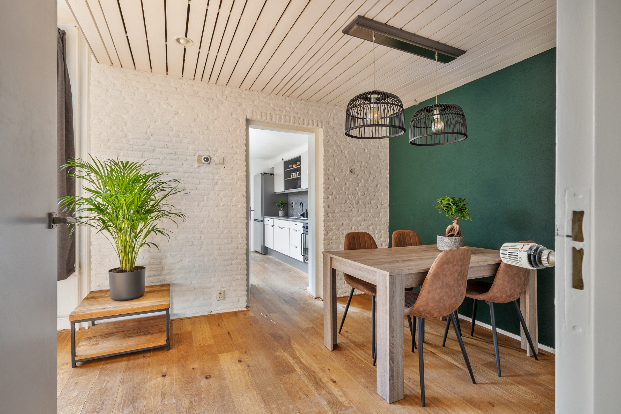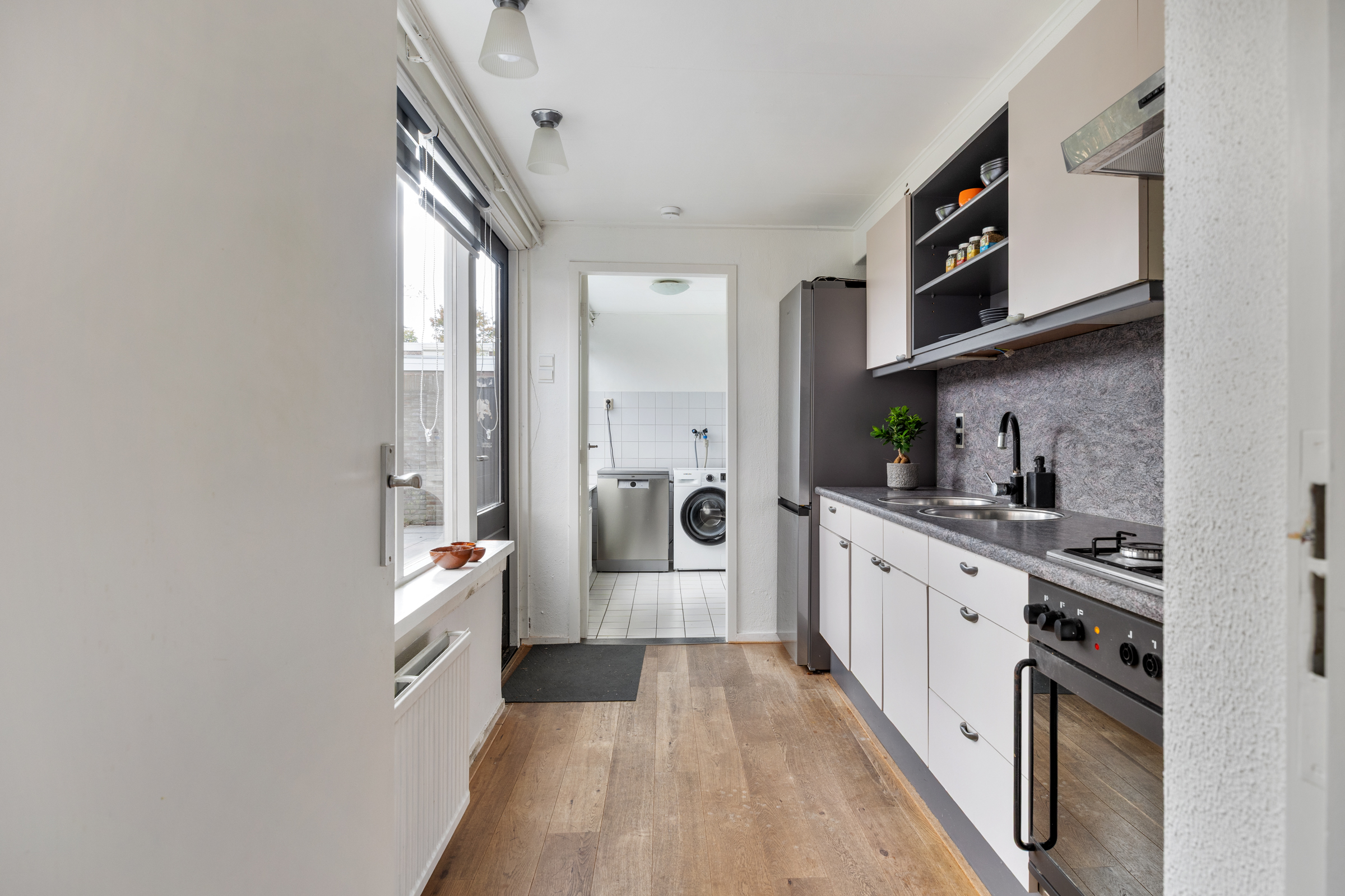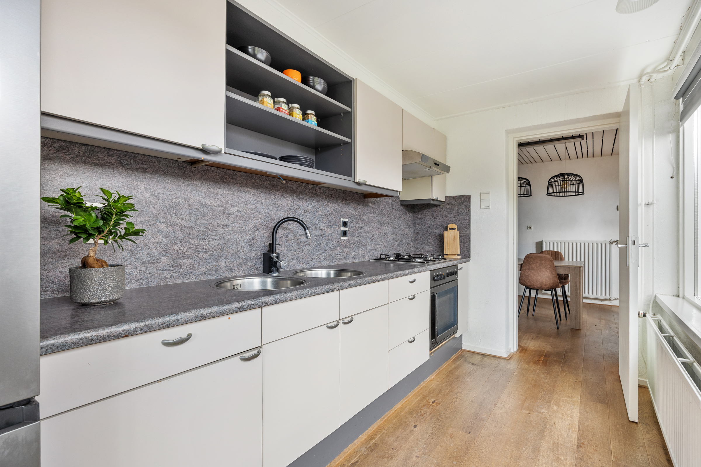 De keuken is gelegen in de aanbouw aan de achterzijde, deze biedt middels een loopdeur toegang tot de achtertuin en is voorzien van eiken houten vloer en een inbouwkeuken met elektrische oven, vernieuwde kookplaat (2024), afzuigkap en dubbele spoelbak. De kozijnen ter plaatse van de keuken zijn recent volledig vernieuwd.