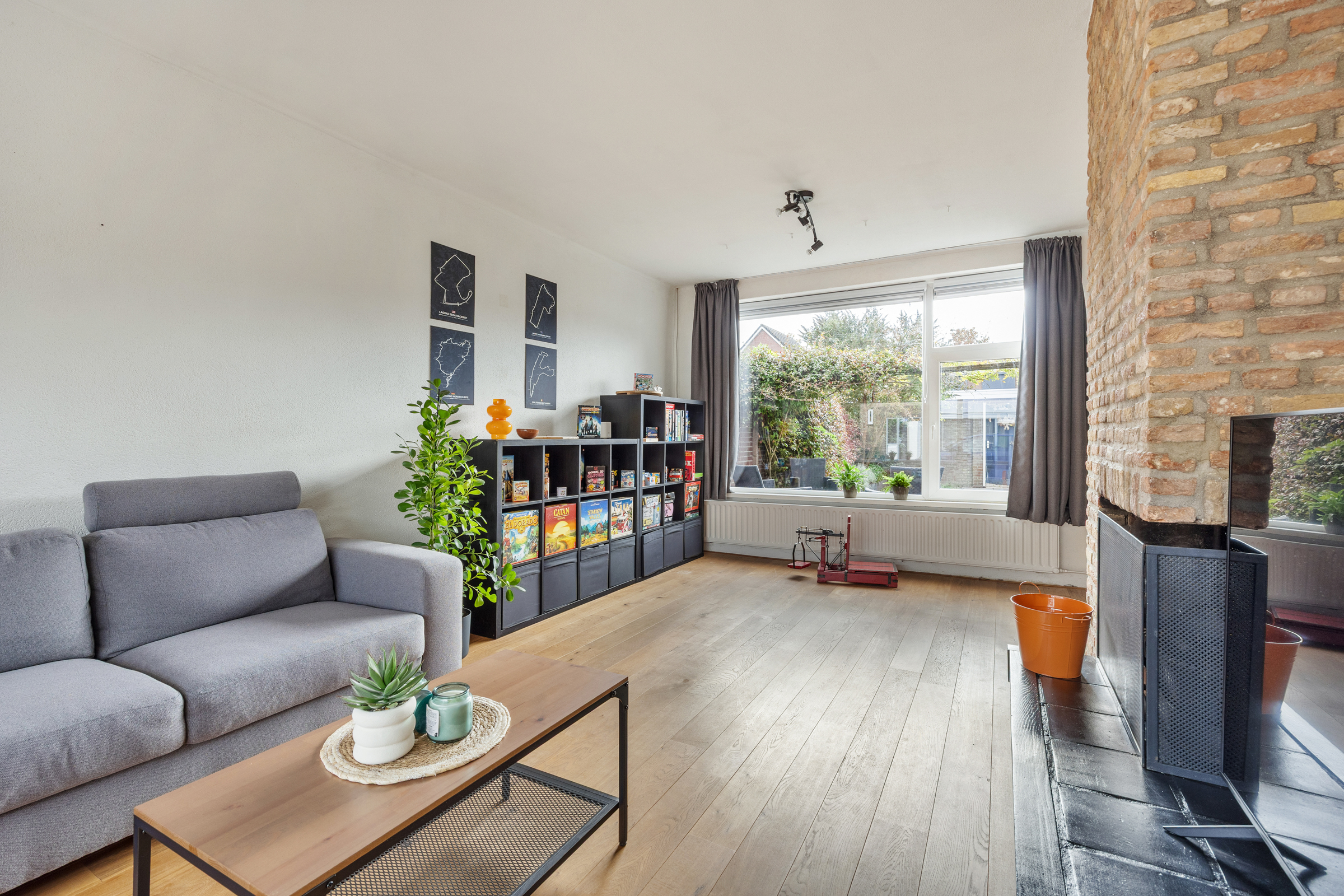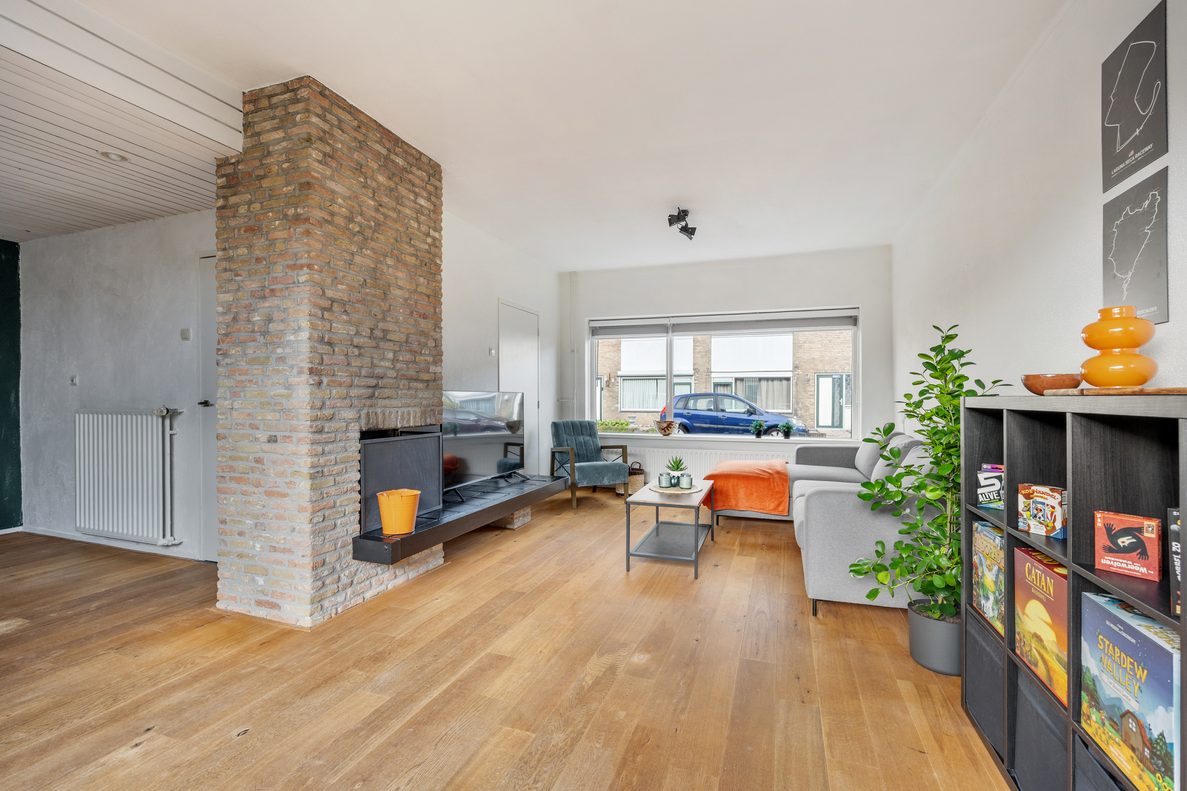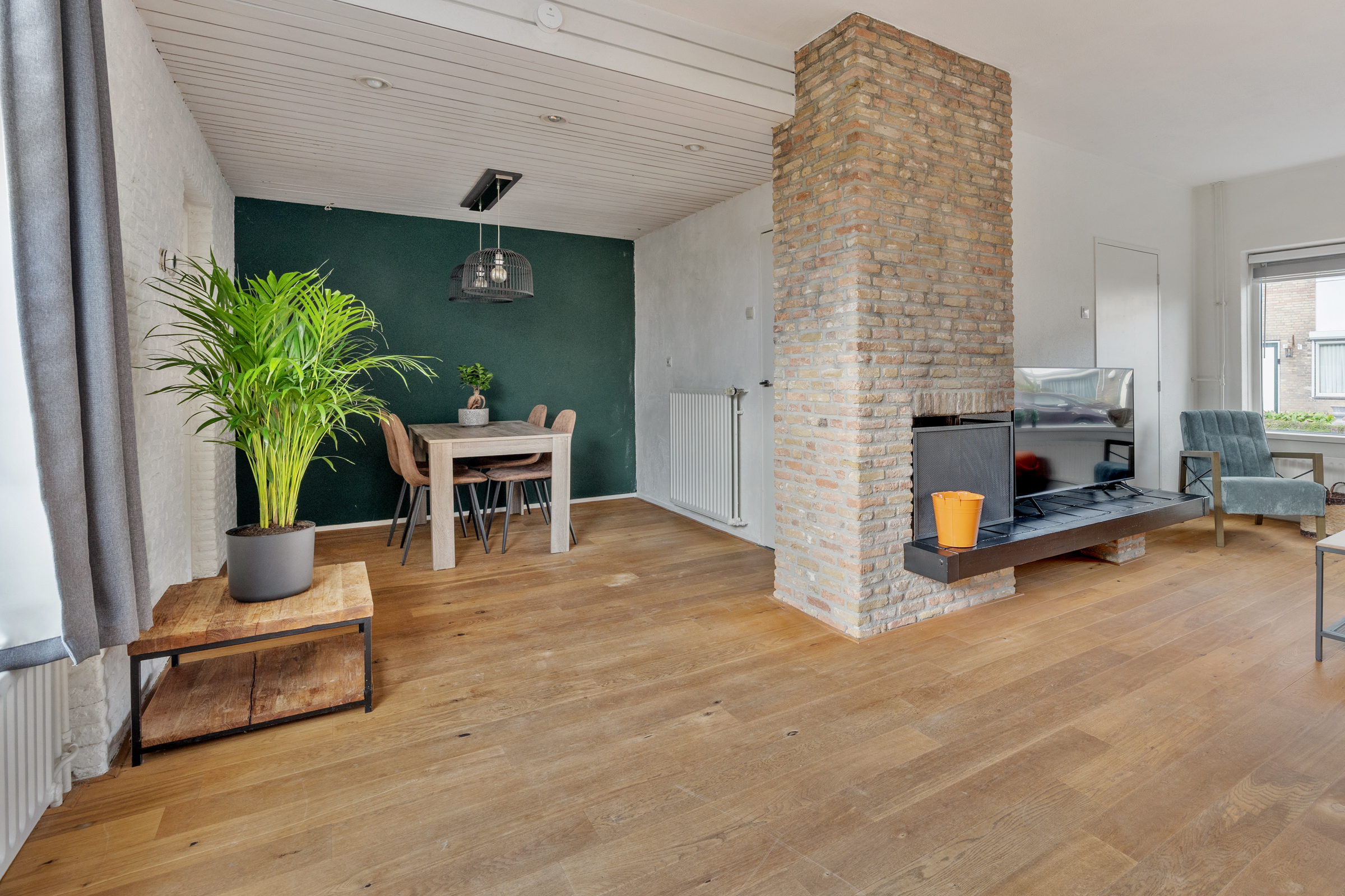 Woongedeelte met royale L-vormige woonkamer (34 m²) met spachtelputz wandafwerking, eiken houten vloer en een open haard. De woonkamer biedt ruim plaats aan een zithoek en grote eettafel bijvoorbeeld.