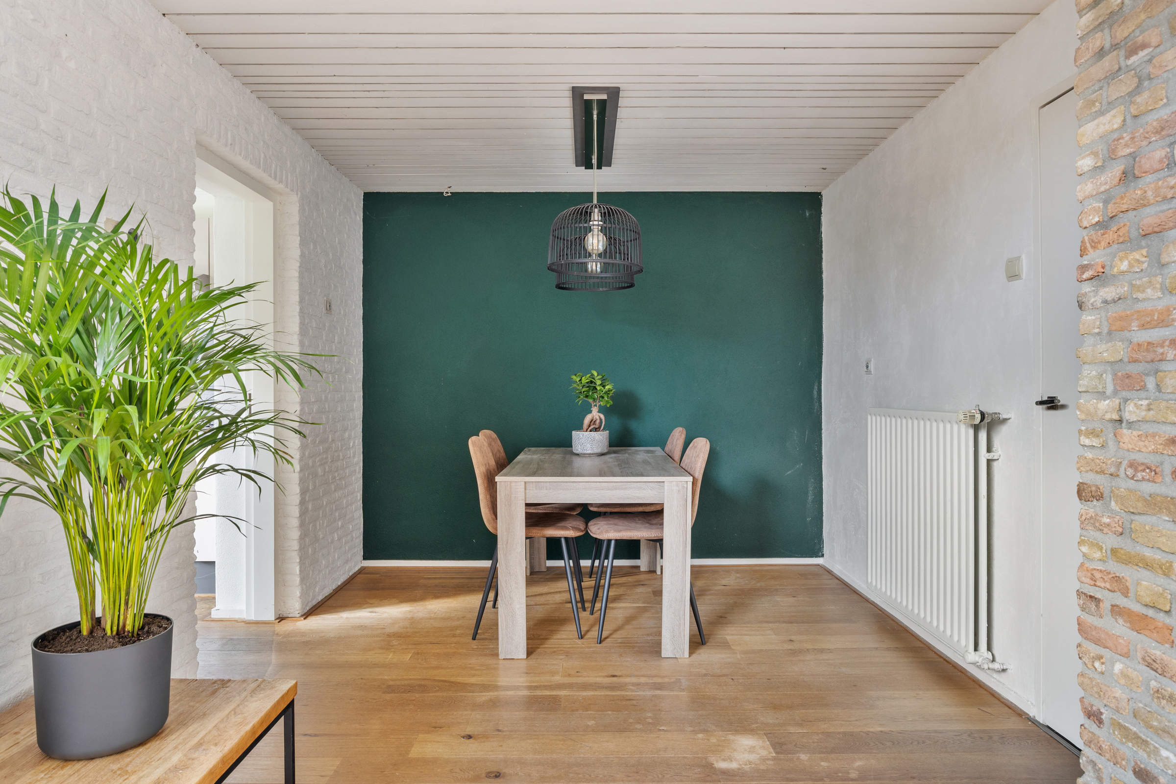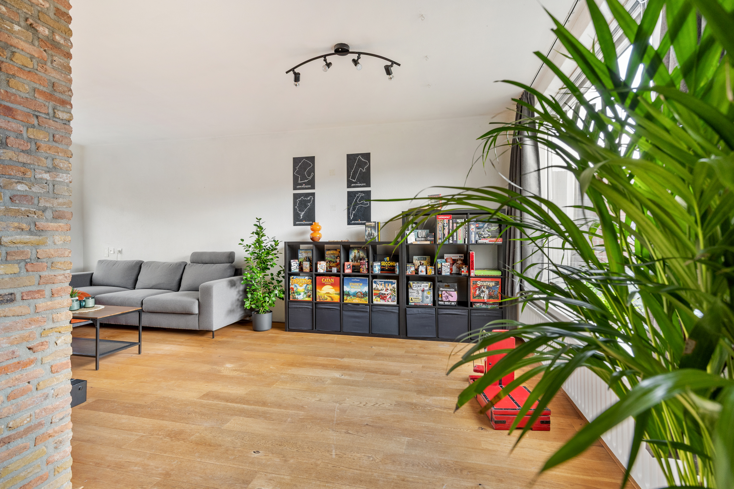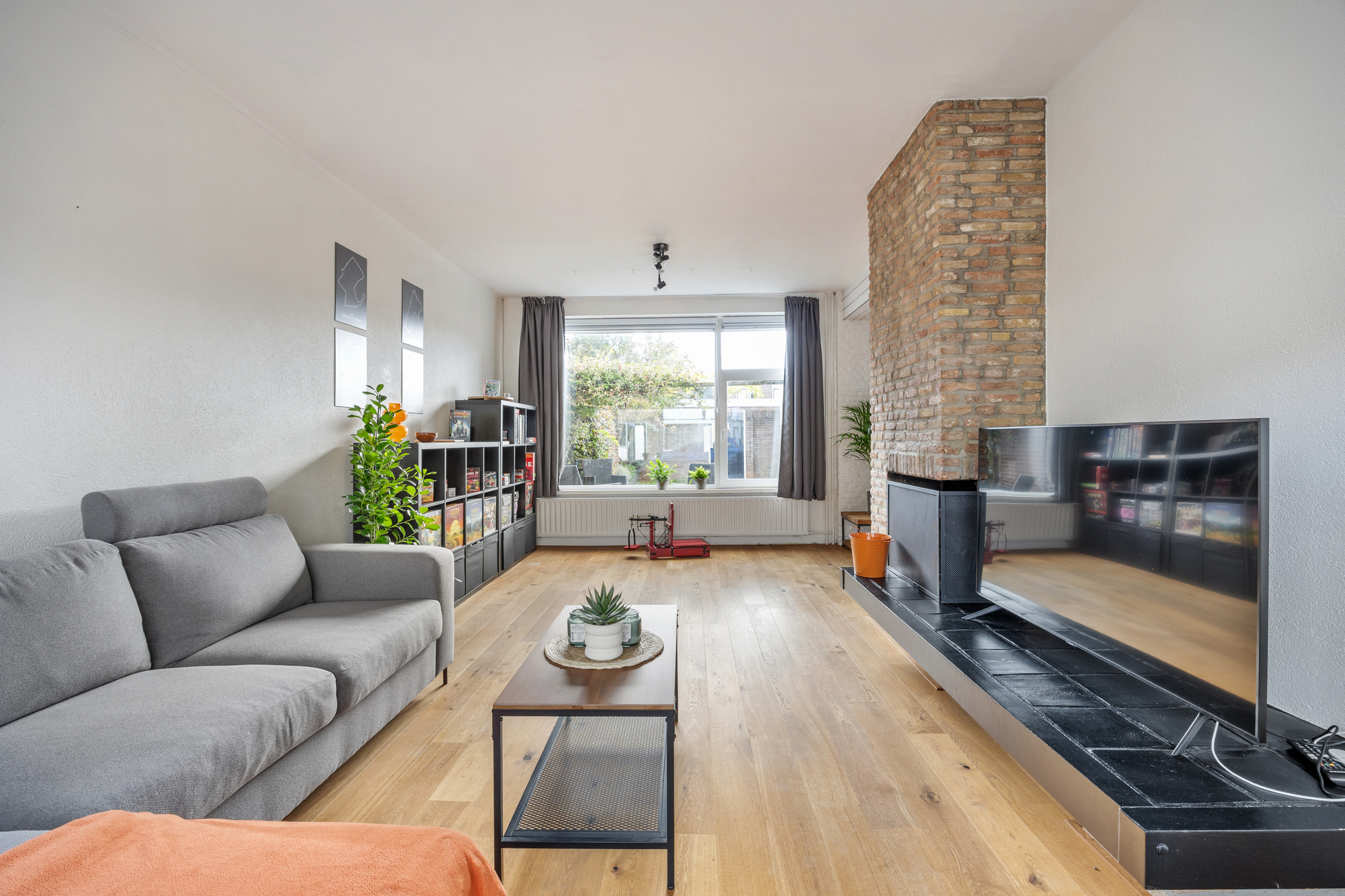Woongedeelte met royale L-vormige woonkamer (34 m²) met spachtelputz wandafwerking, eiken houten vloer en een open haard. De woonkamer biedt ruim plaats aan een zithoek en grote eettafel bijvoorbeeld.