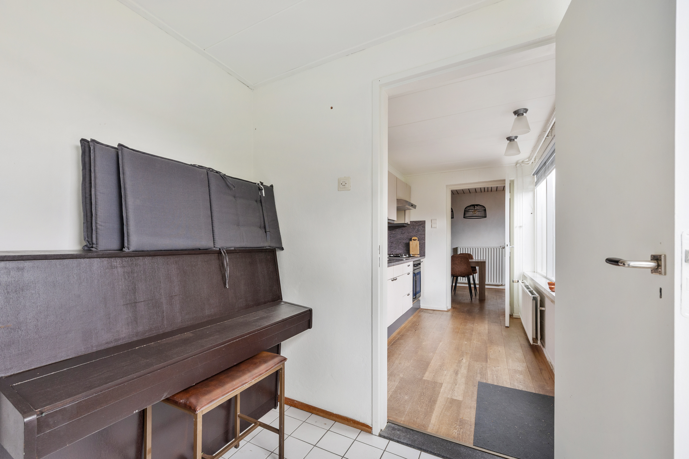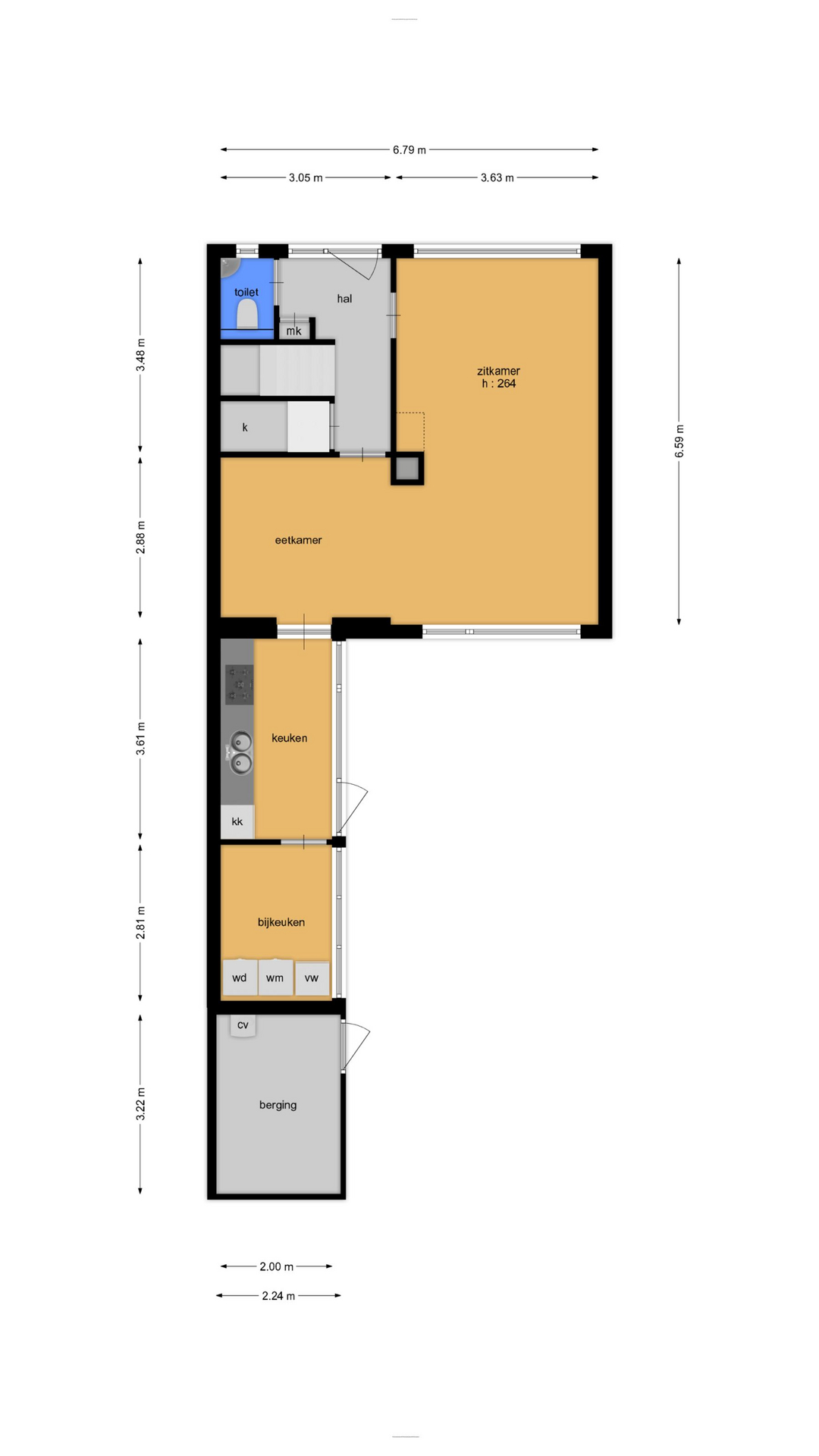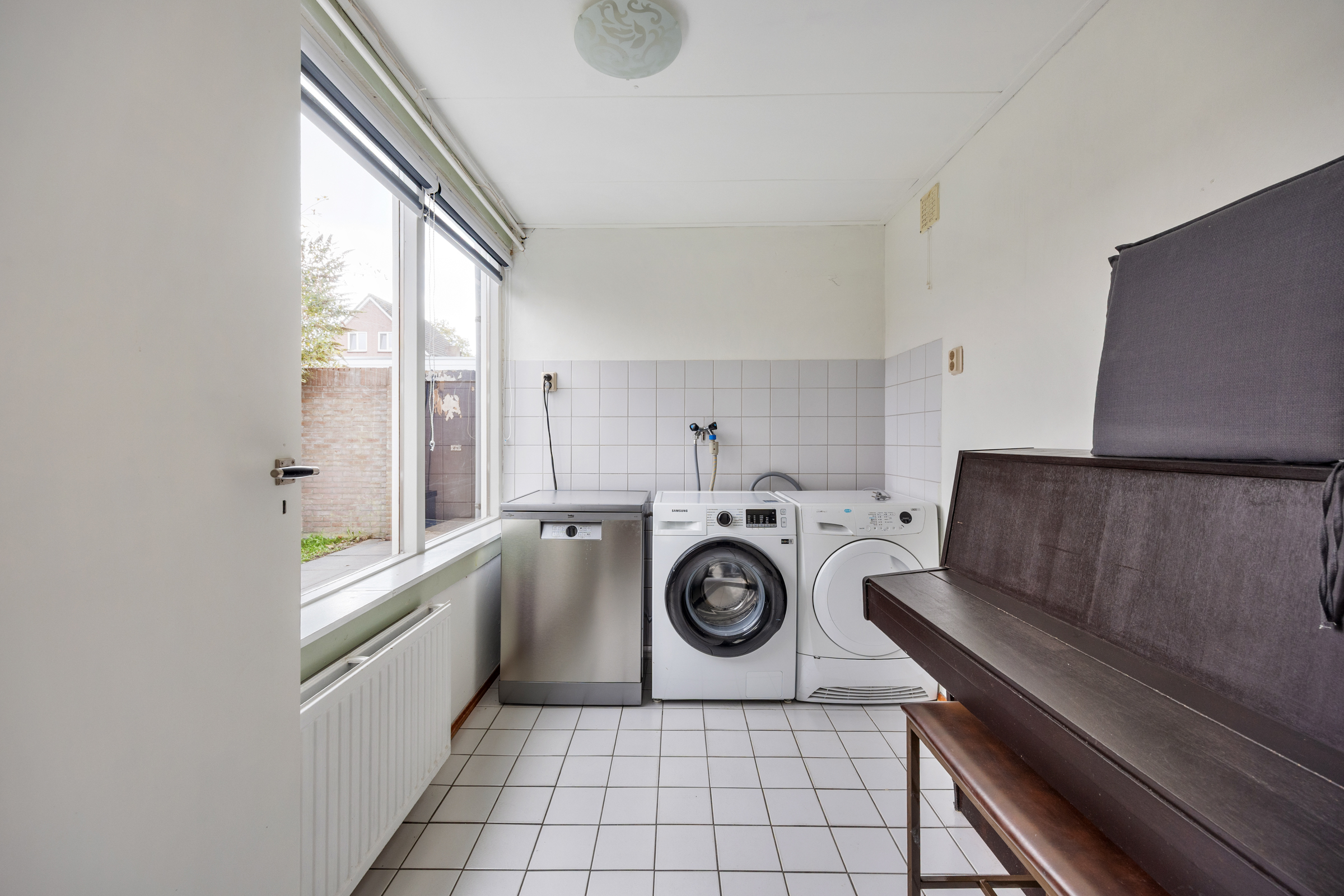 Bijkeuken (2,22 x 2,65 m): gedeeltelijk betegeld, met aansluitpunten voor huishoudelijke apparatuur.