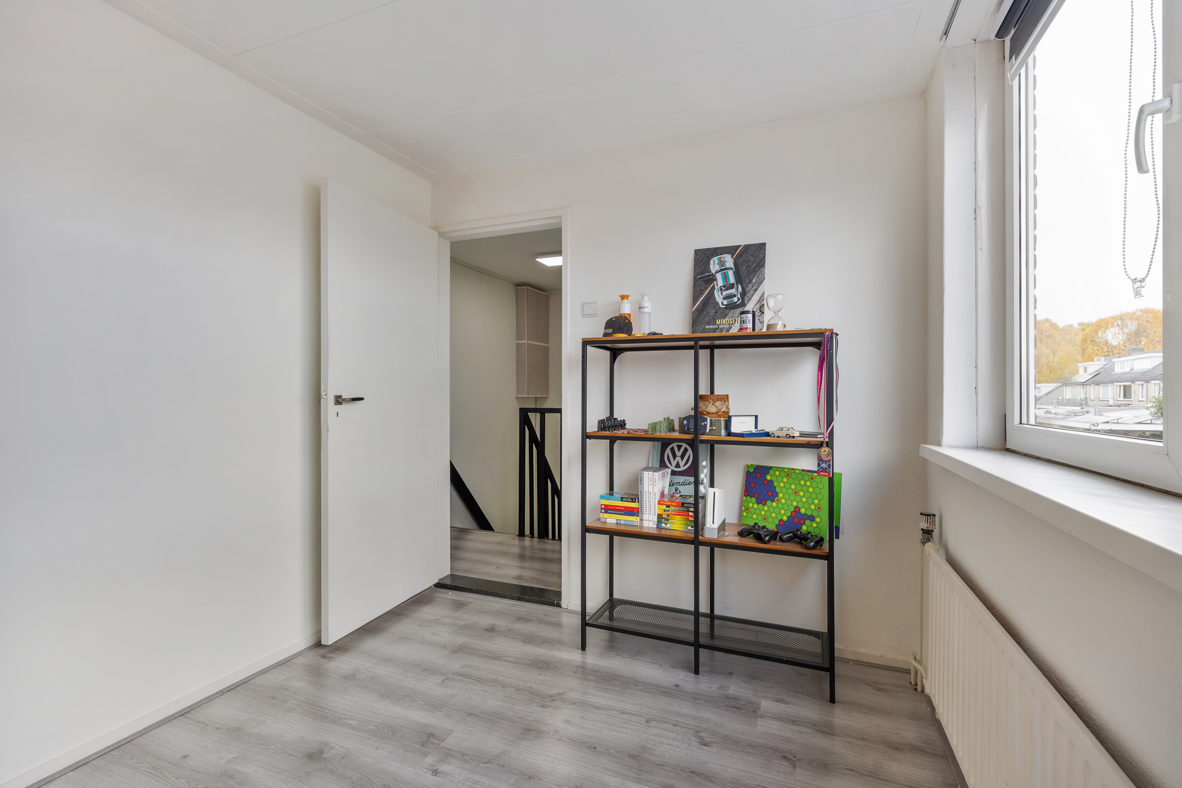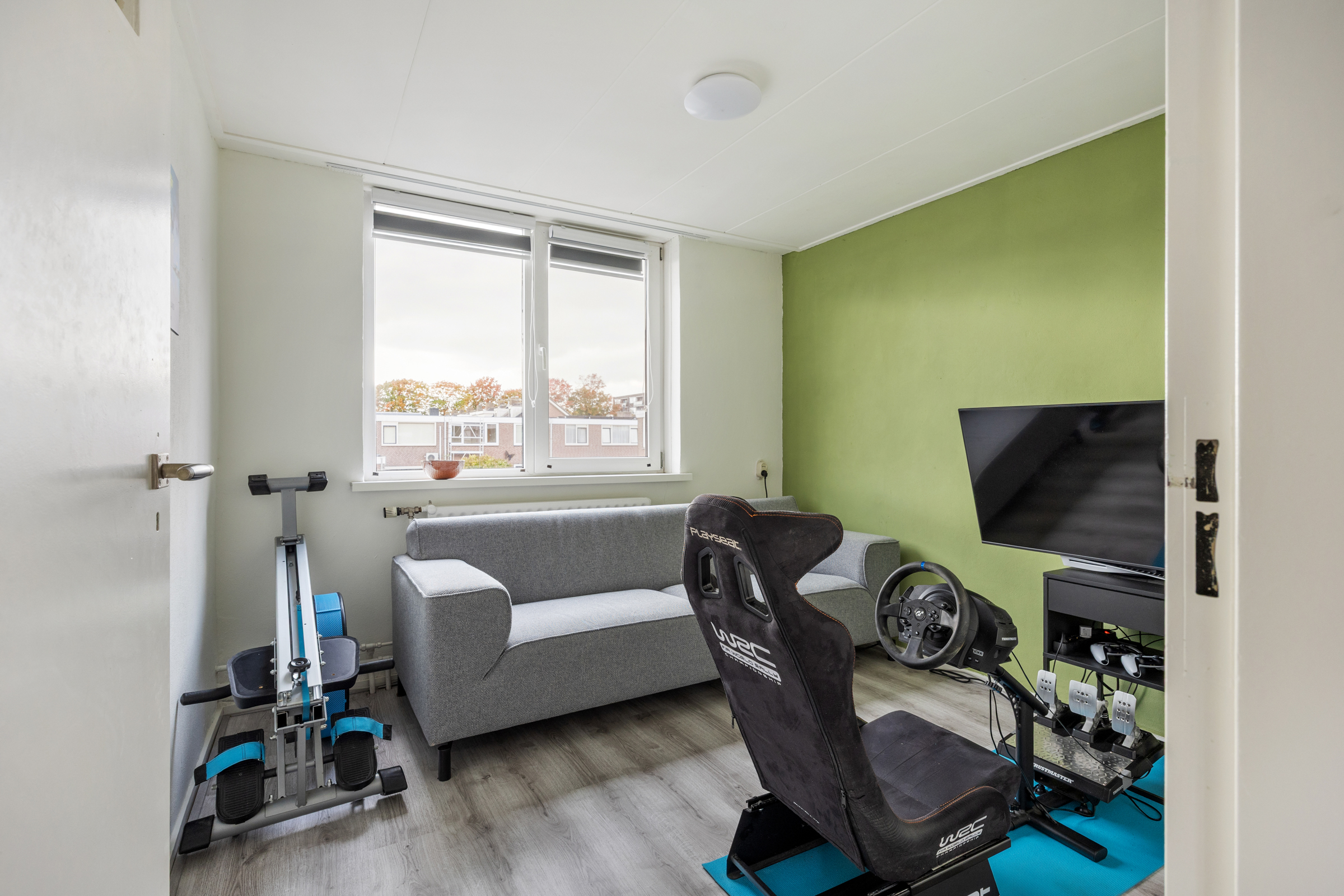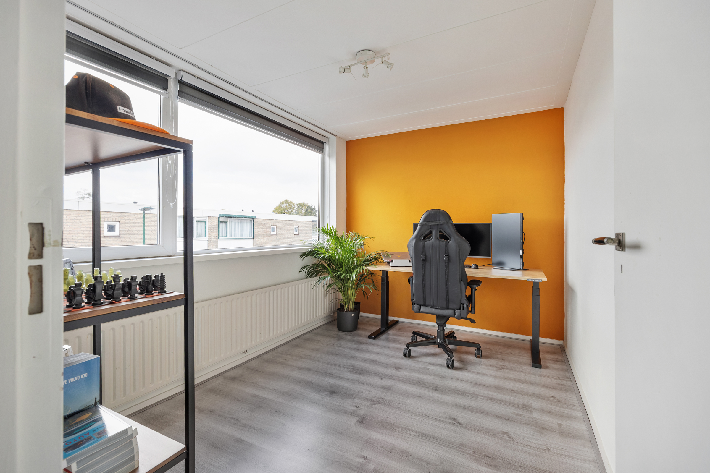 Slaapkamer 3 (3,63 x 2,51 m): voorzijde, kunststof kozijn, structuurverf en zacht board plafond.
