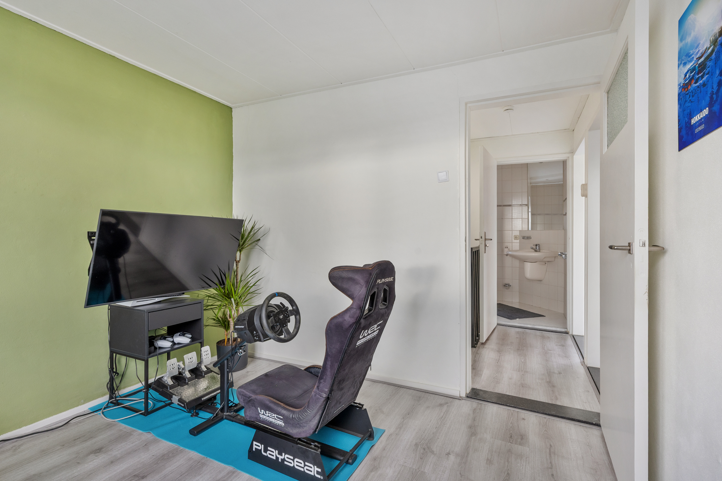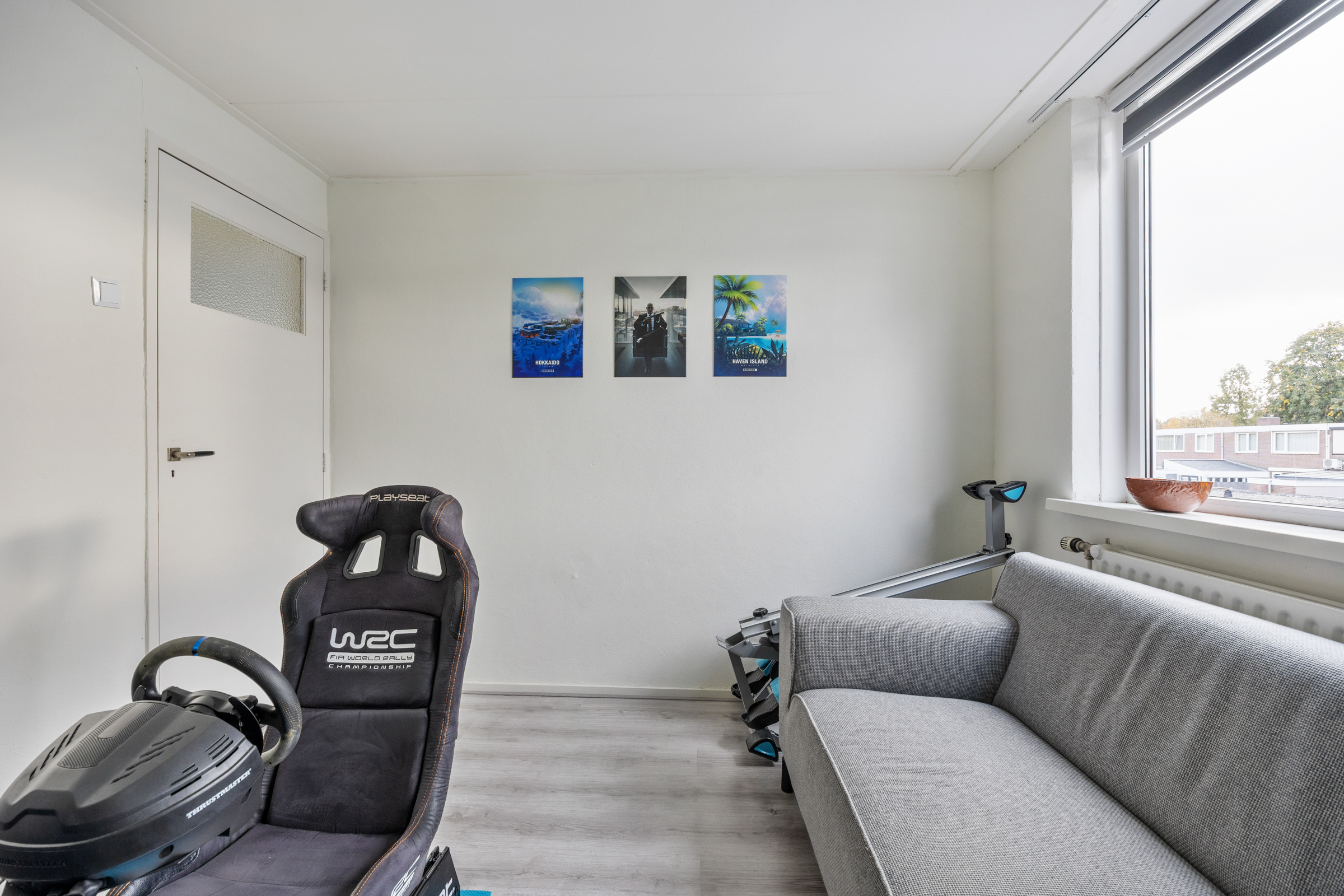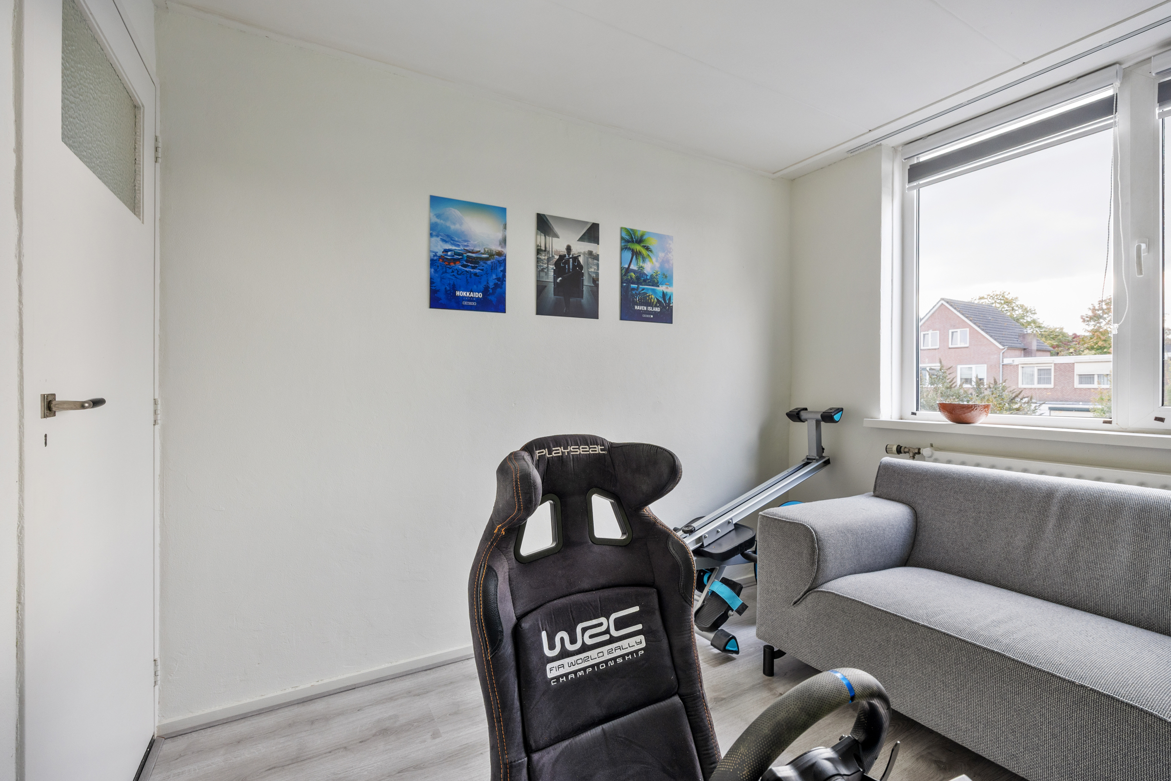 Slaapkamer 3 (3,63 x 2,51 m): voorzijde, kunststof kozijn, structuurverf en zacht board plafond.