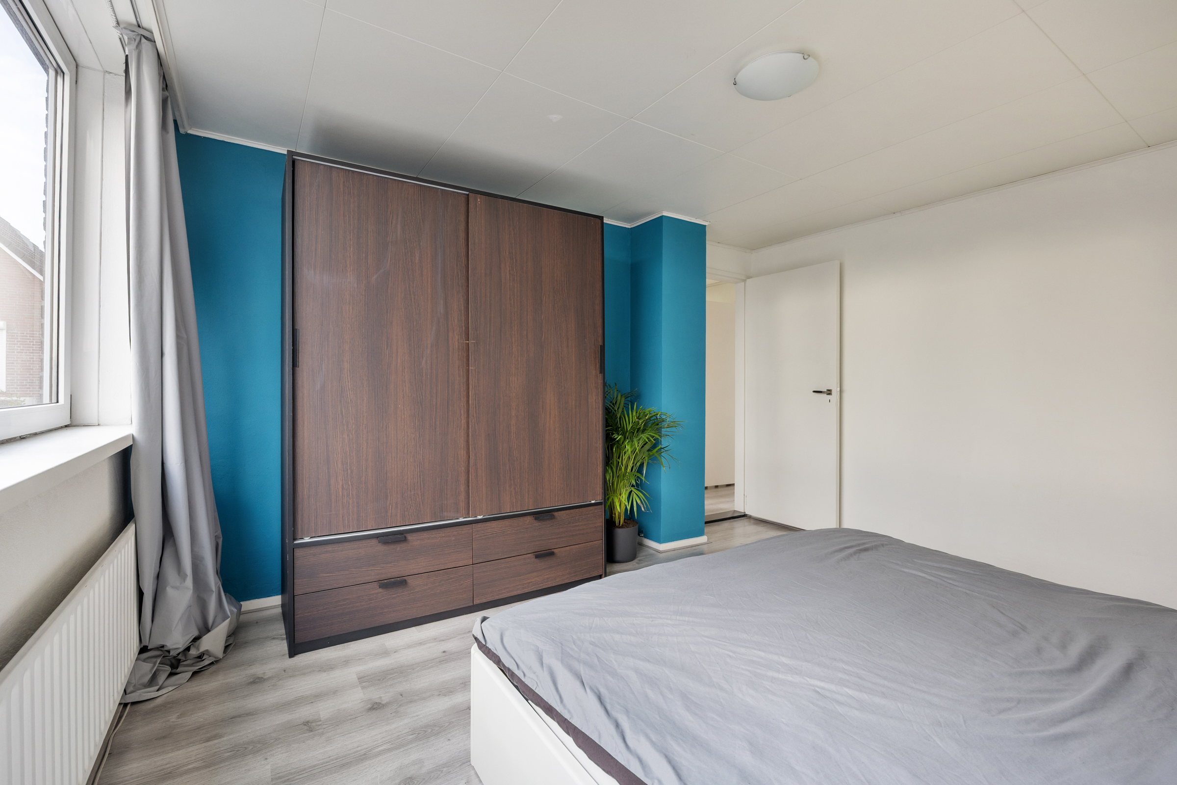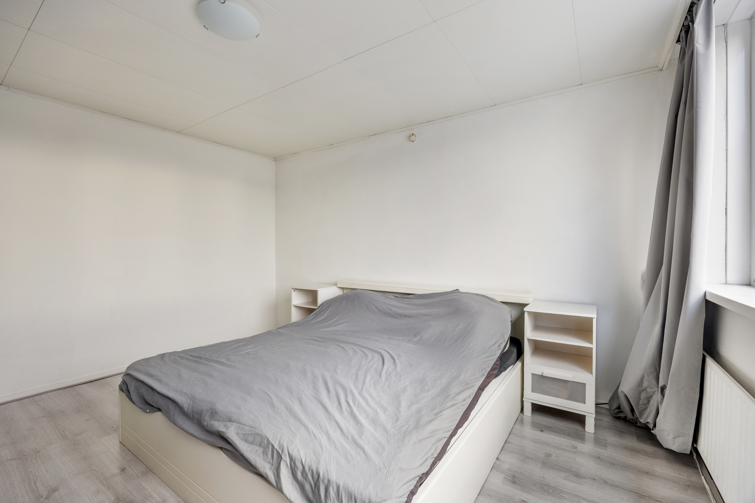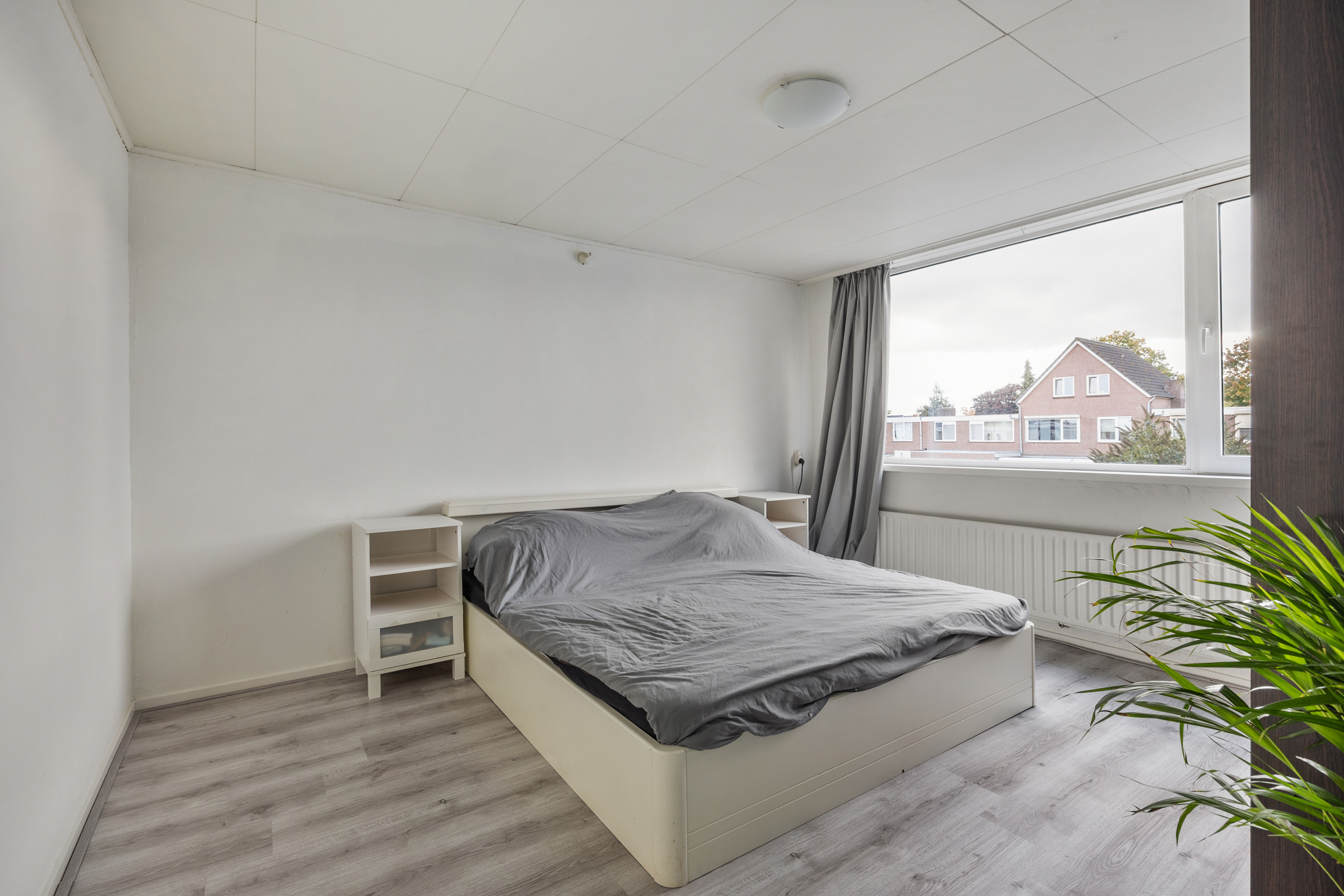 Slaapkamer 2 (3,63 x 4,04 m): achterzijde, kunststof kozijn, structuurverf en verlaagd plafond.