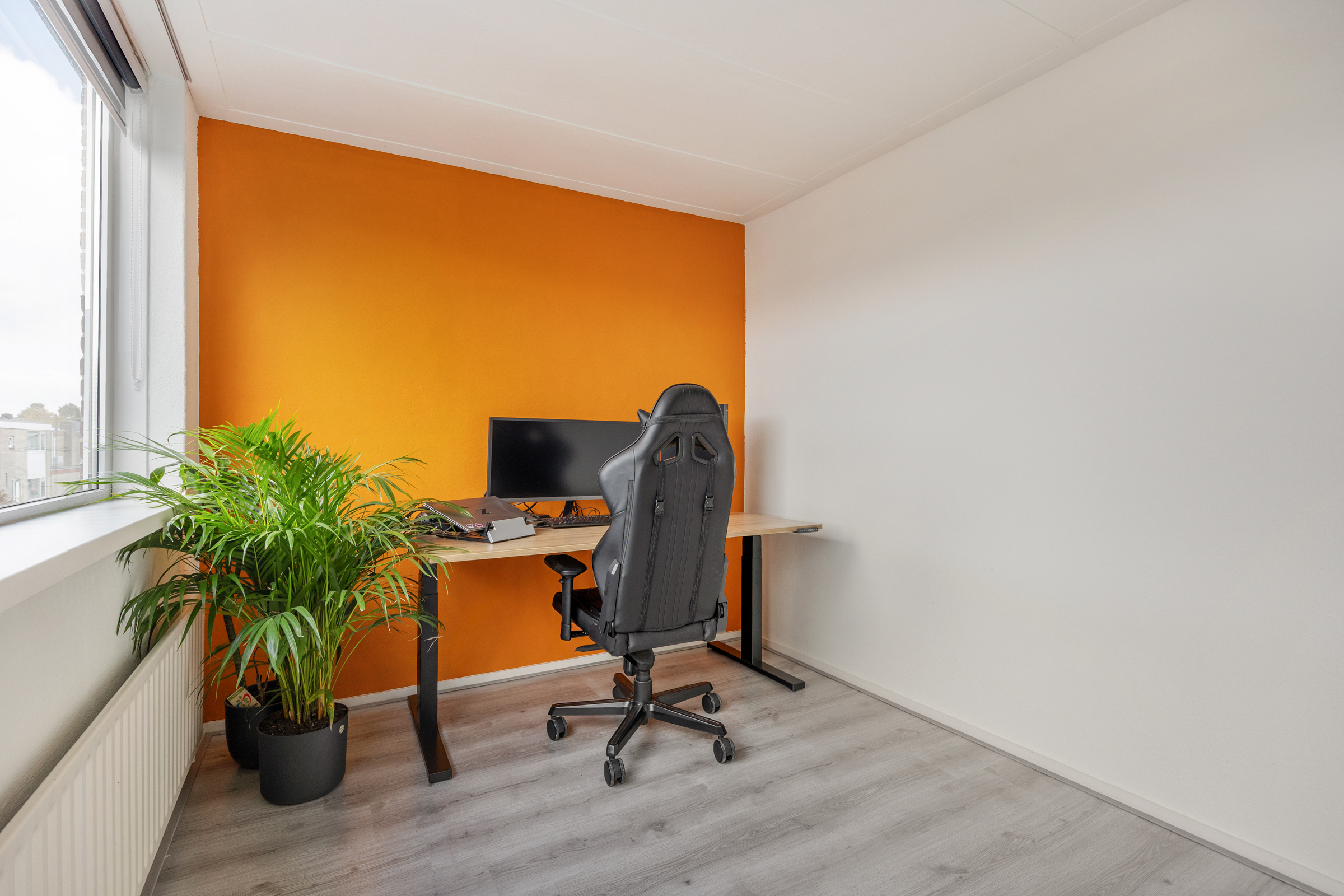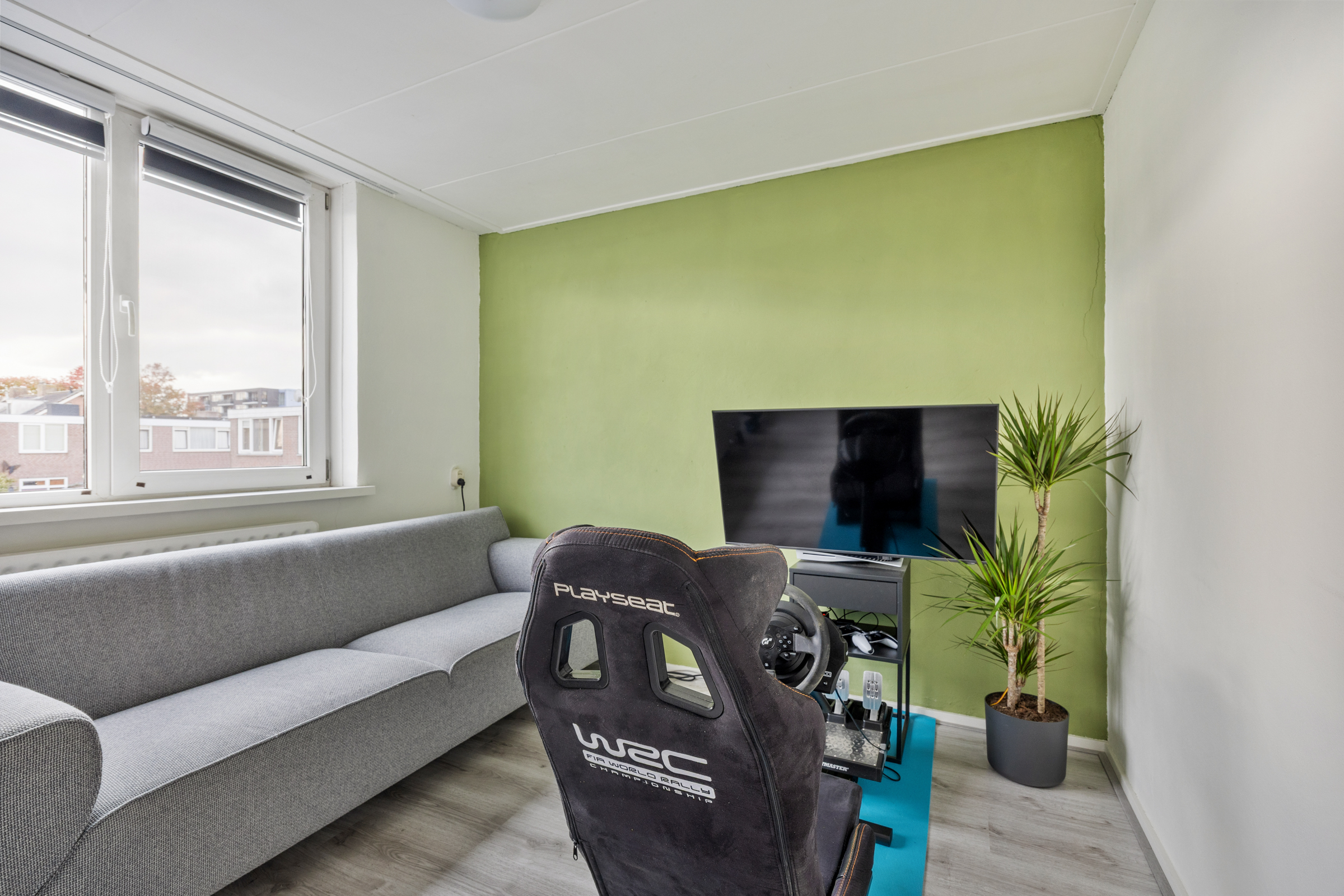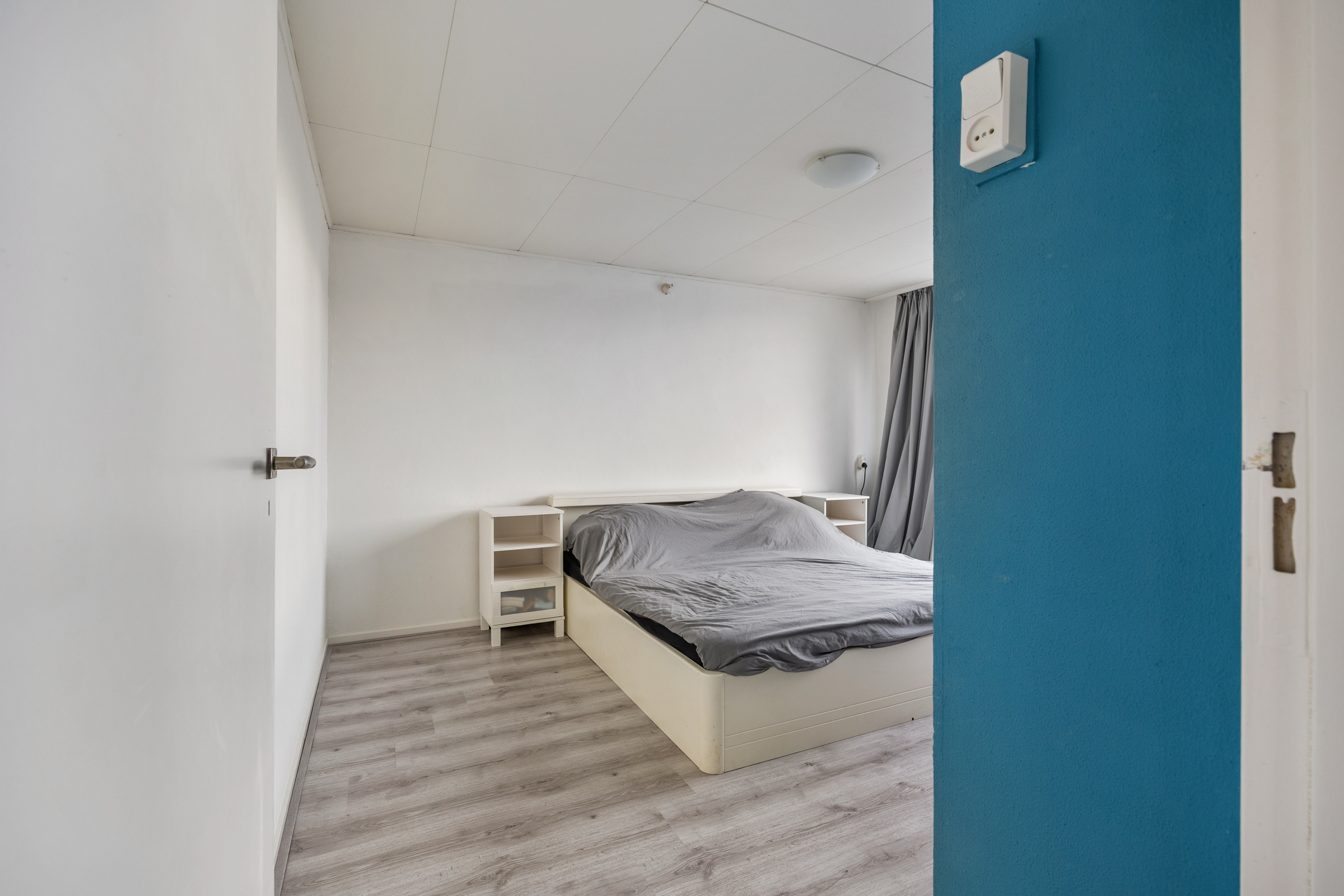 Slaapkamer 2 (3,63 x 4,04 m): achterzijde, kunststof kozijn, structuurverf en verlaagd plafond.
