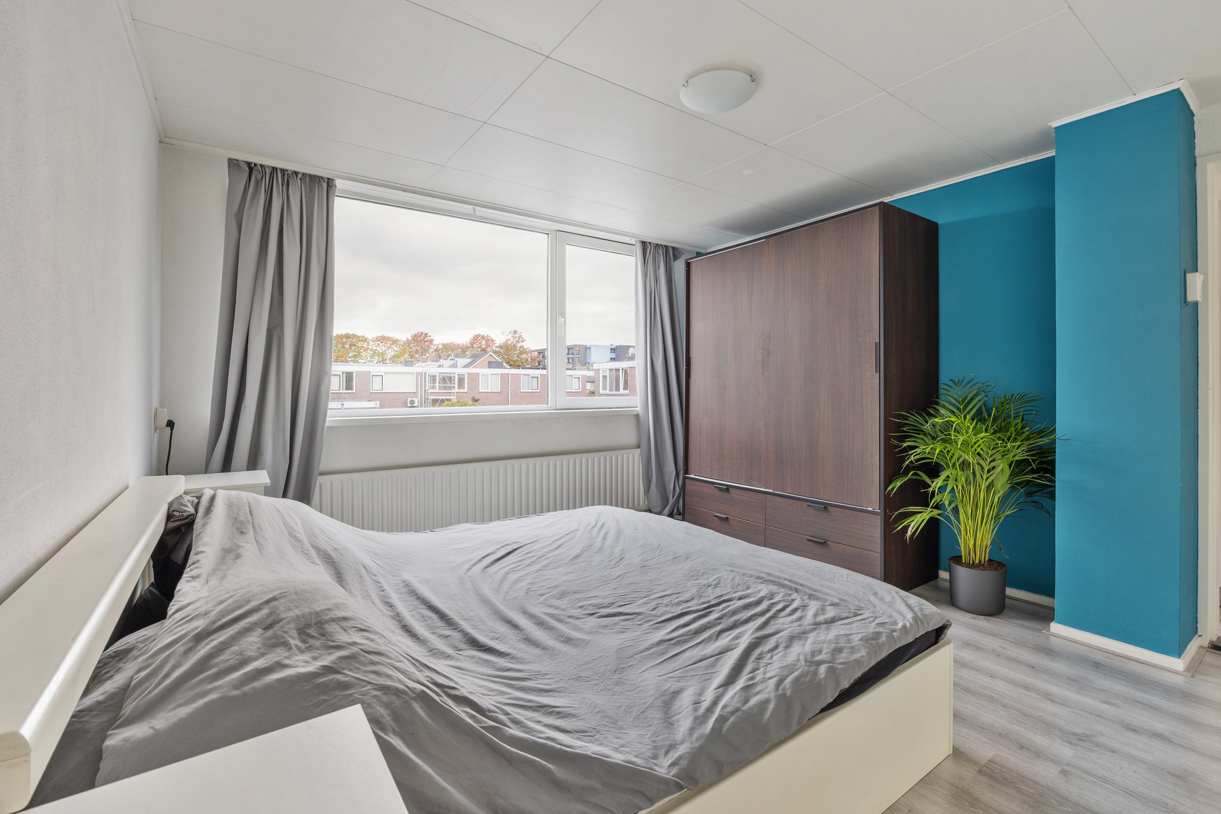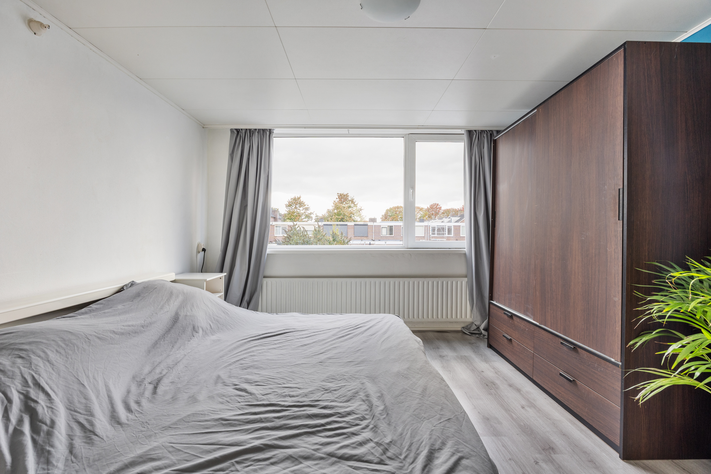 Slaapkamer 1 (3,06 x 3,02 m): achterzijde, kunststof kozijnen, structuurverf en verlaagd plafond.