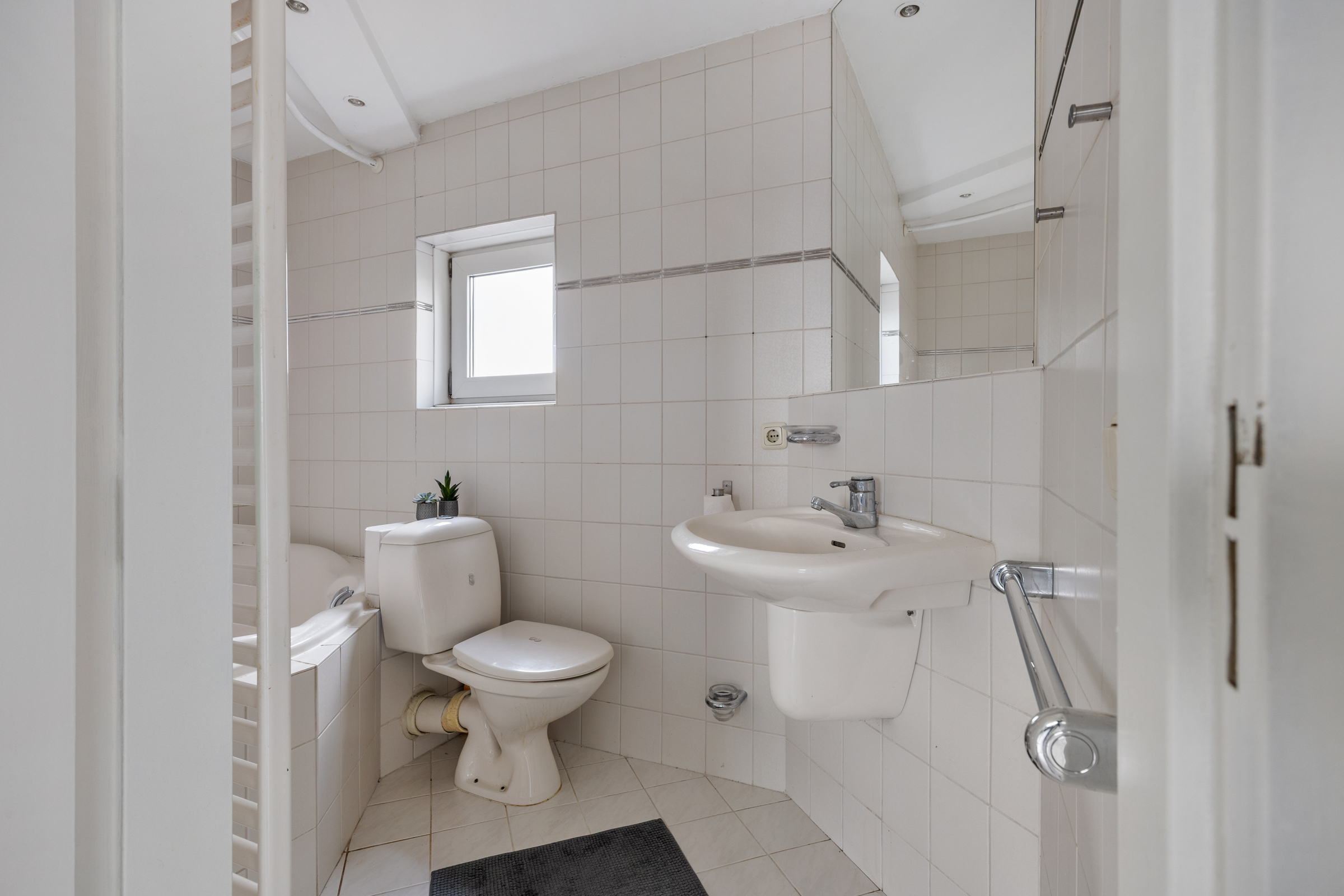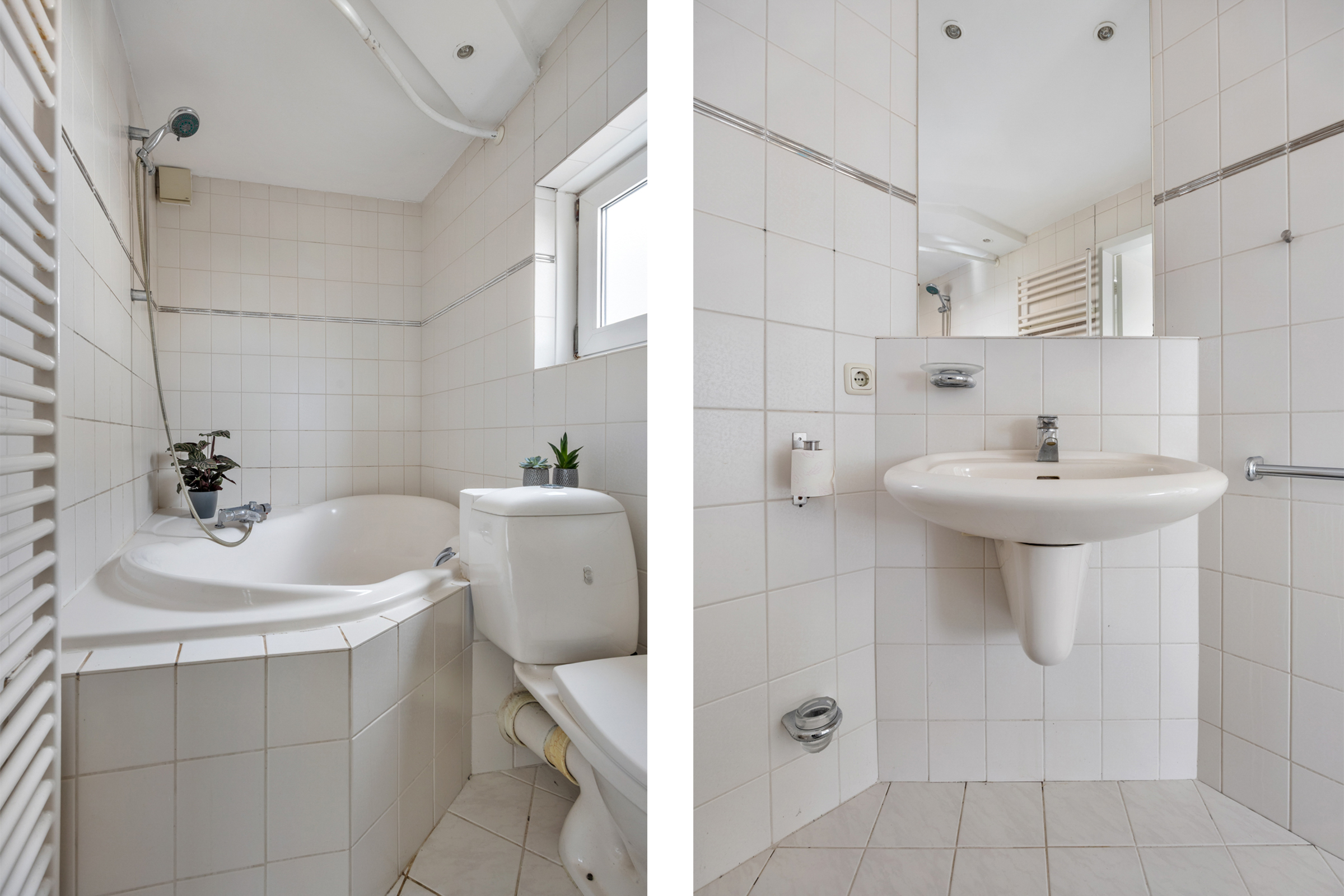 Badkamer: geheel betegeld en voorzien van een ligbad, toilet, wastafel, radiator en elektrische ventilatie.