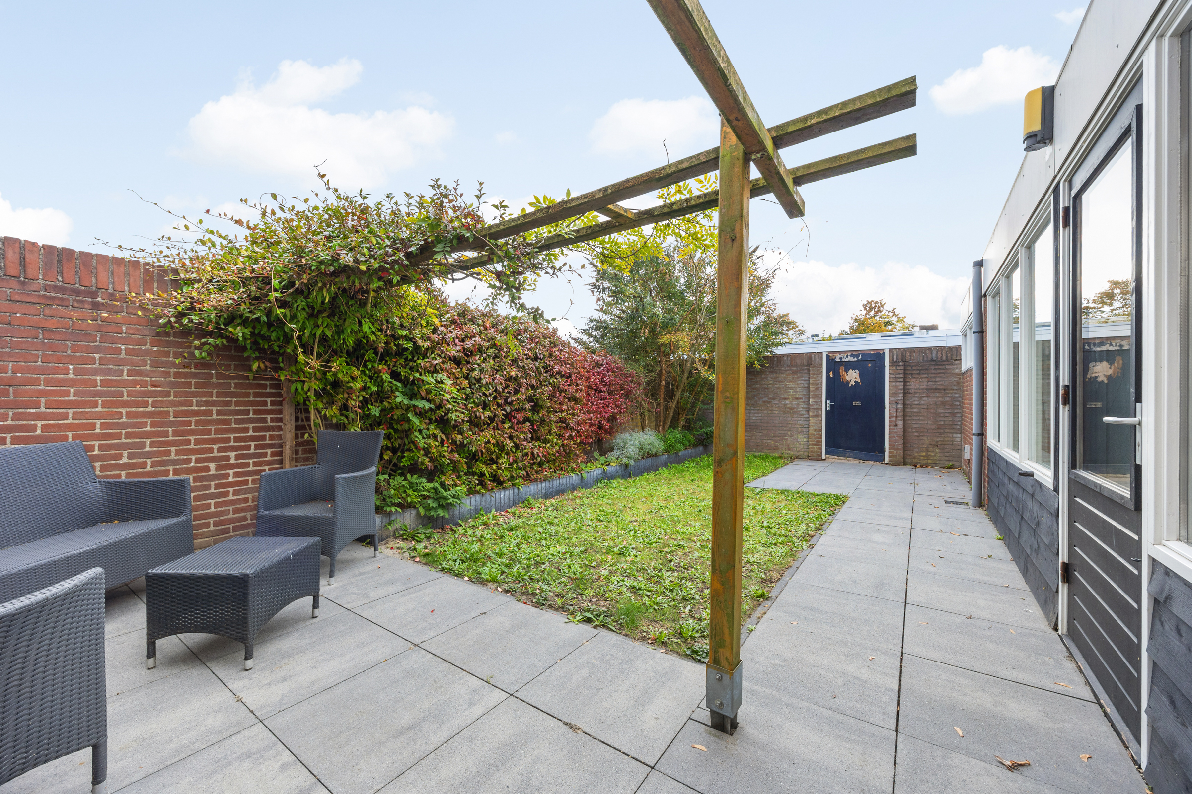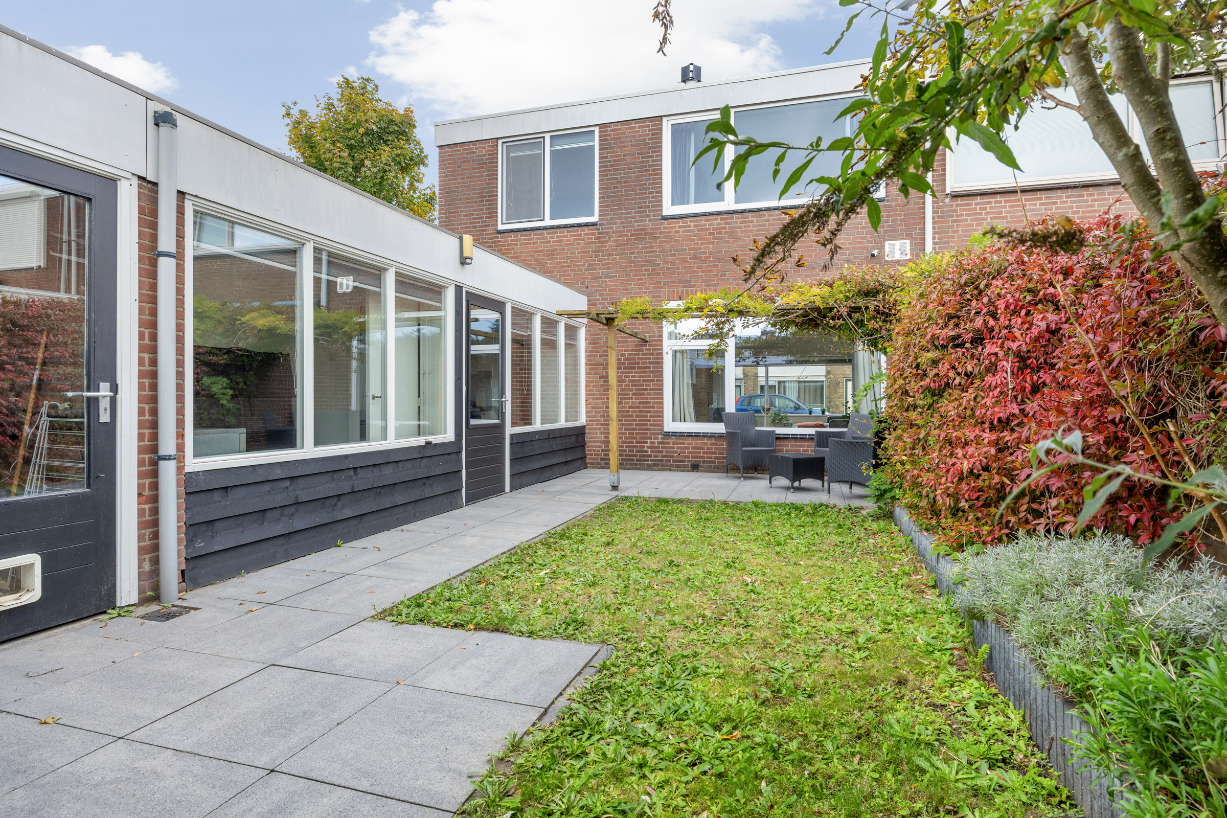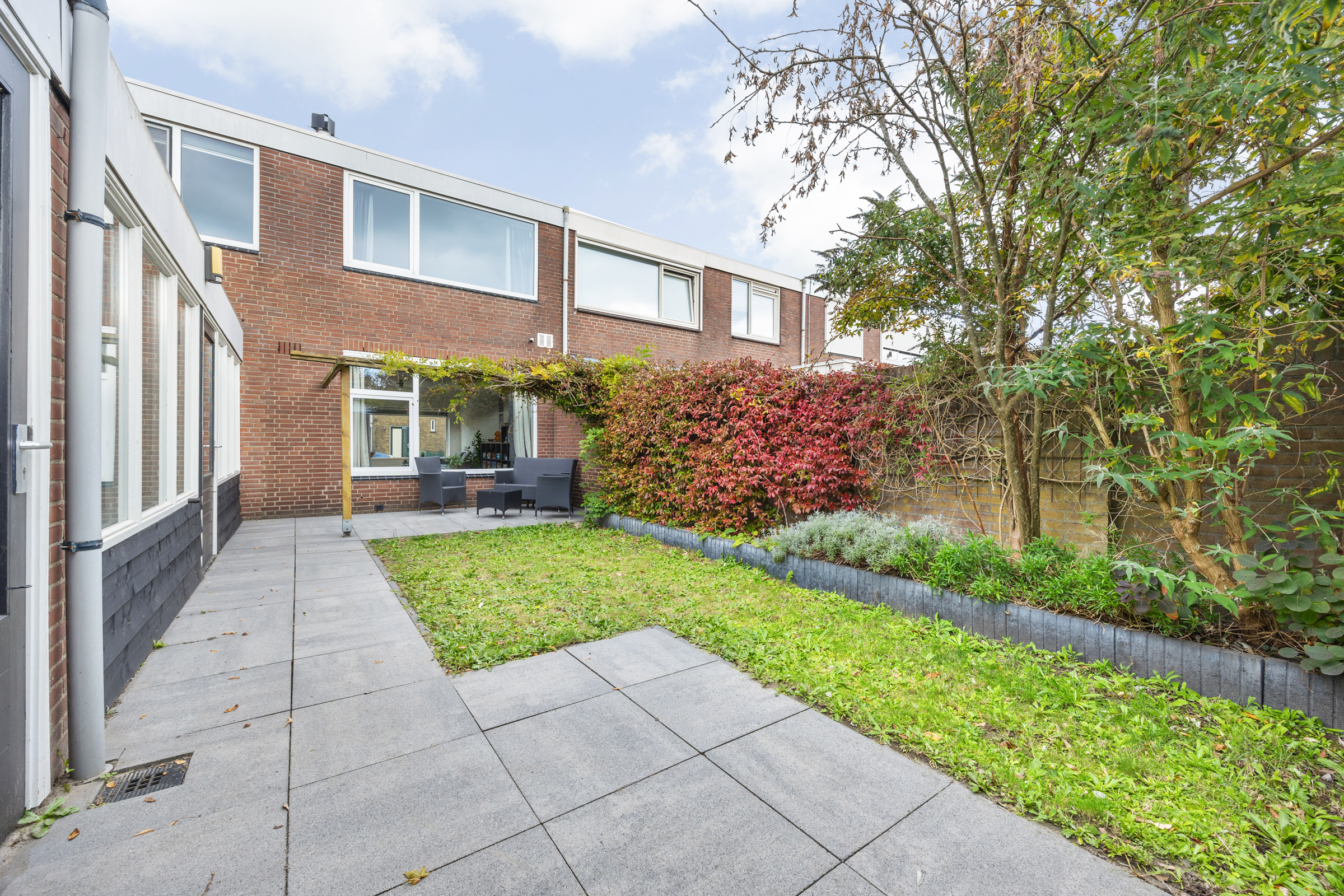 Tuin: verzorgd aangelegd op het zuiden, met terras, gazon, borders en een poort naar de achterom.