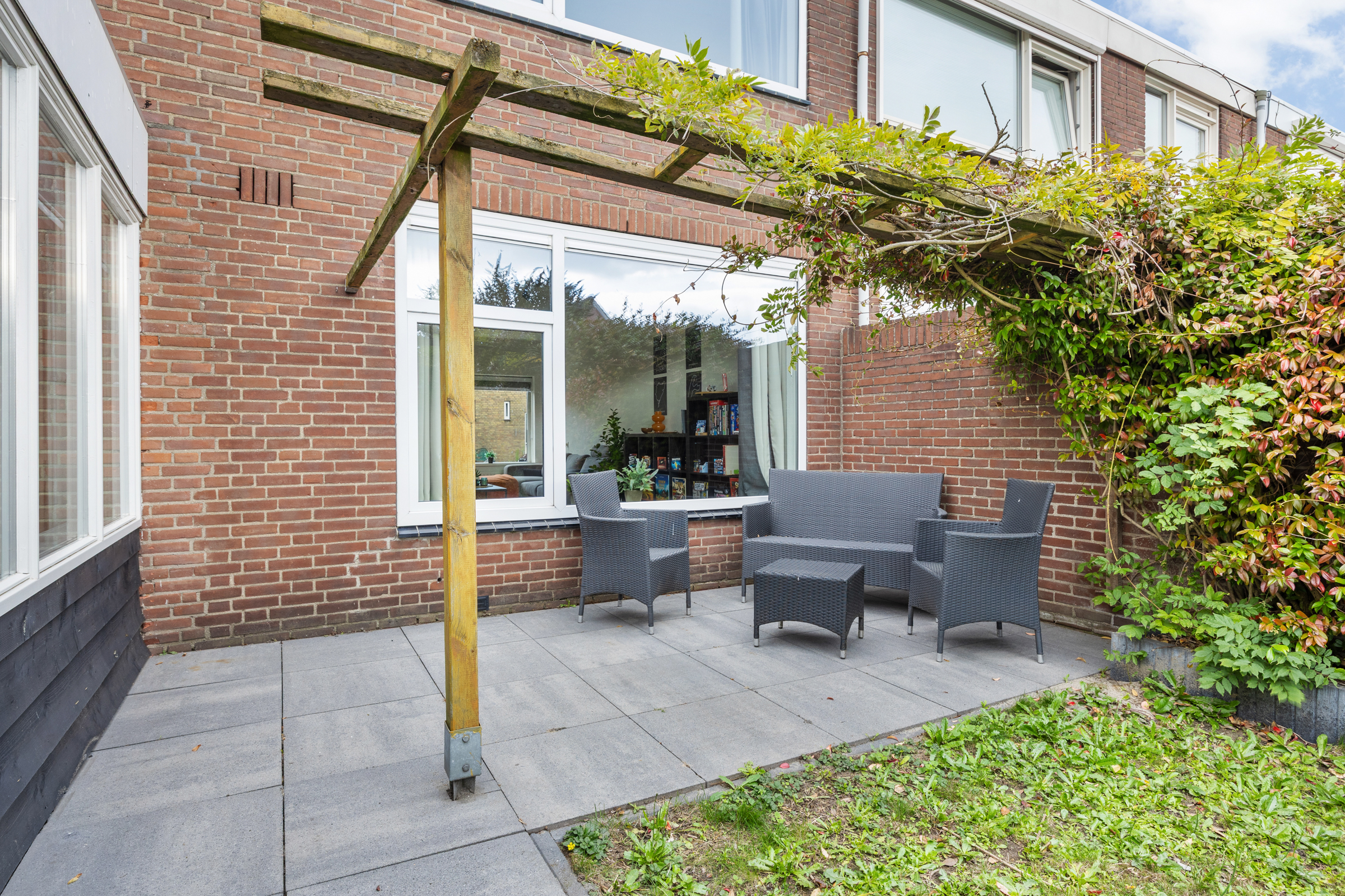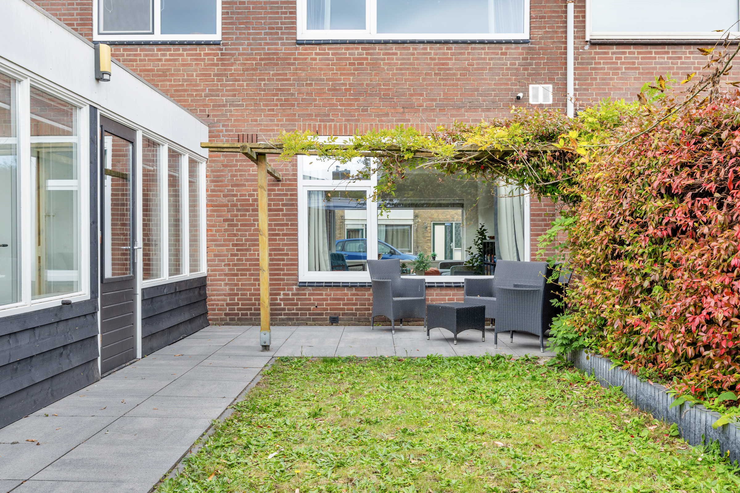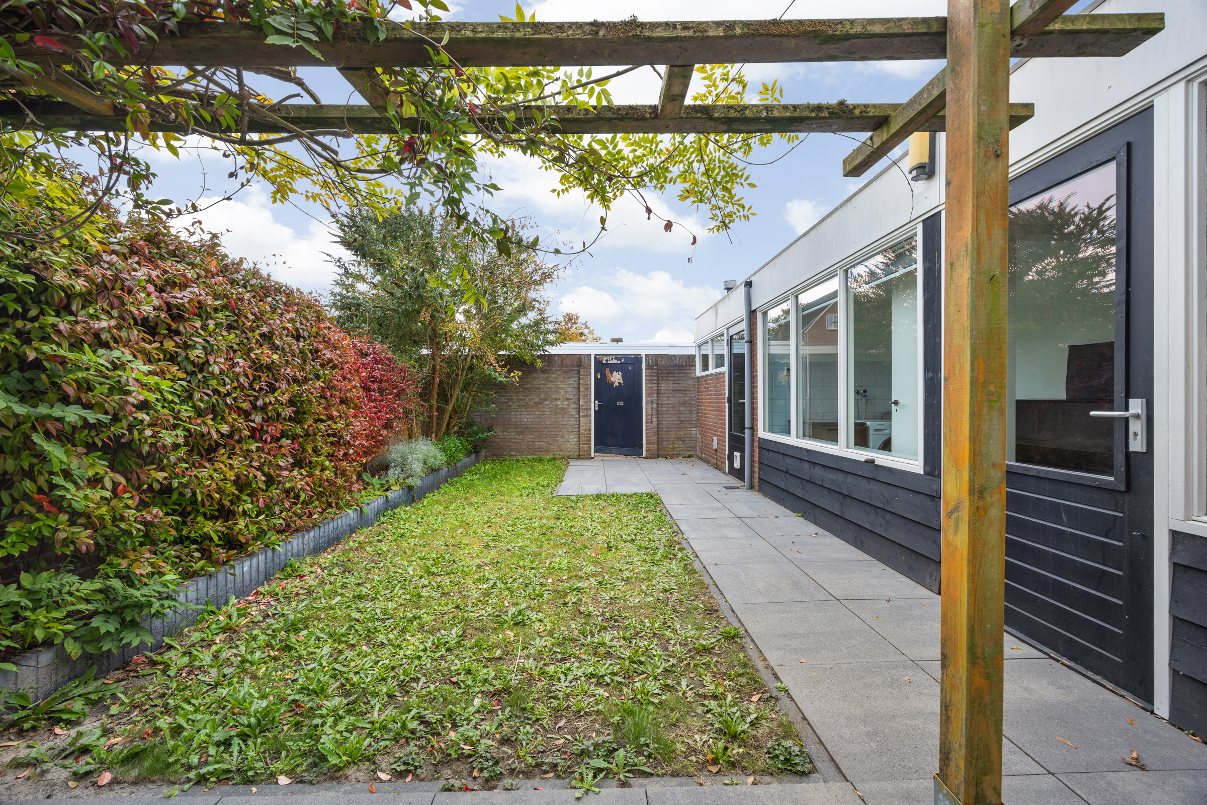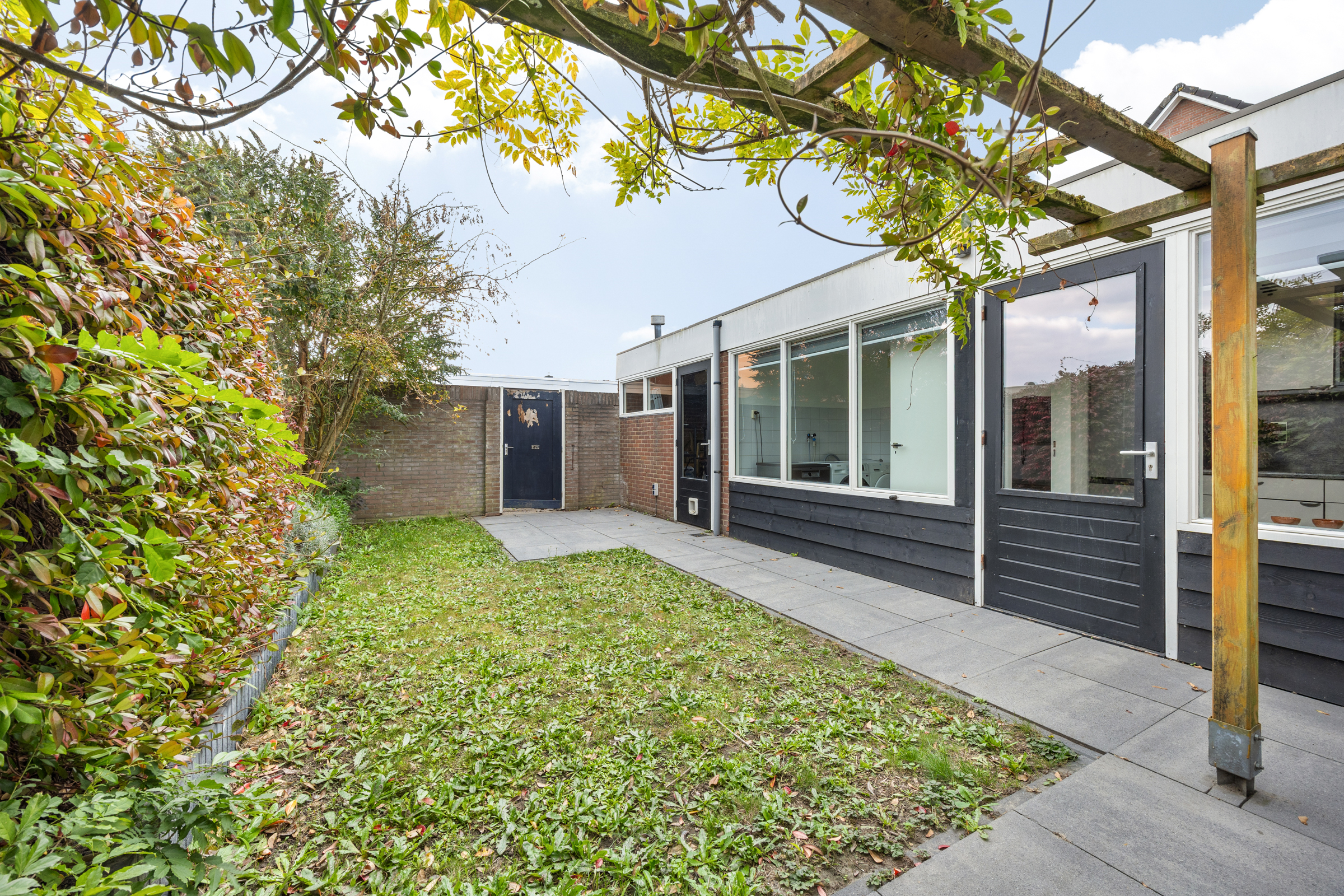 Tuin: verzorgd aangelegd op het zuiden, met terras, gazon, borders en een poort naar de achterom.