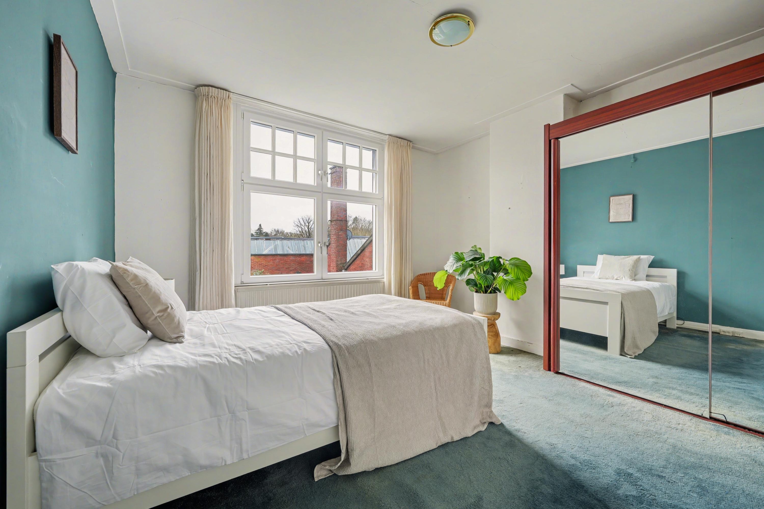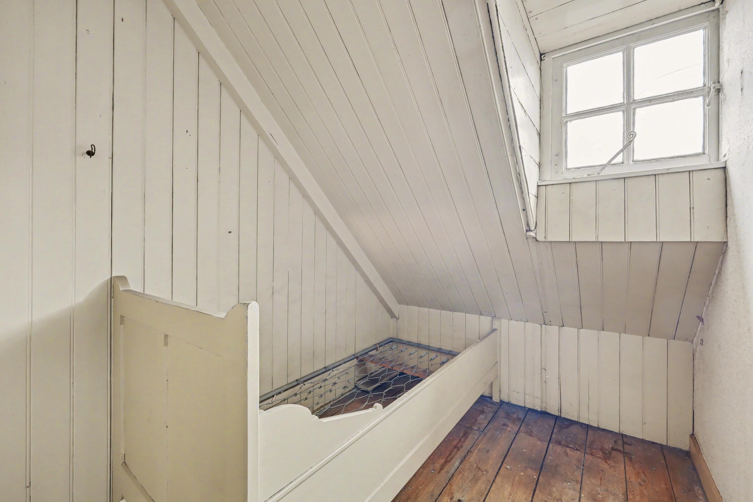 oorspronkelijke dienstbodekamer met dakkapel, een vast (klein) bed en vaste kast , grote zolderberging met klein dakraam. Hier is de samengestelde kap in zicht en deze ruimte biedt verschillende gebruiksmogelijkheden, zoals een extra slaap- of hobbykamer.