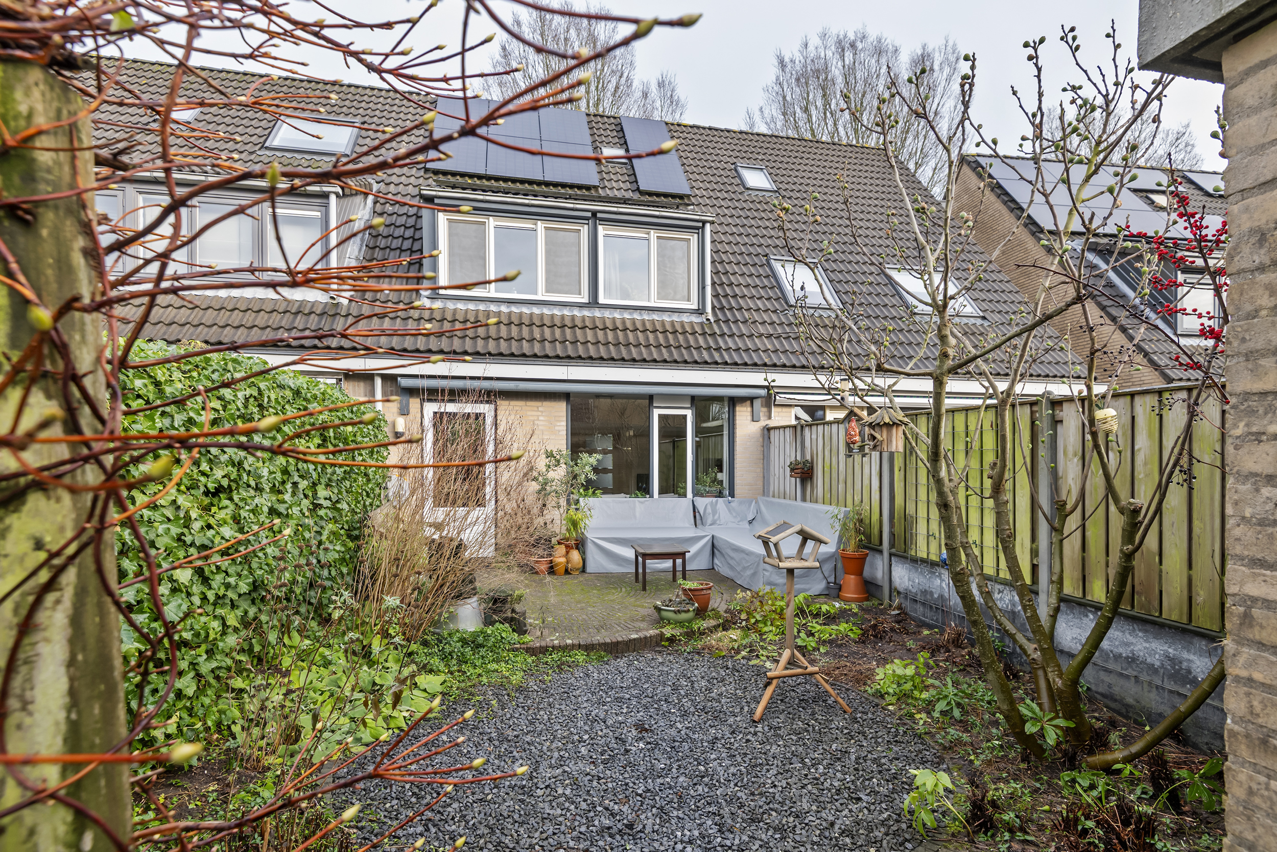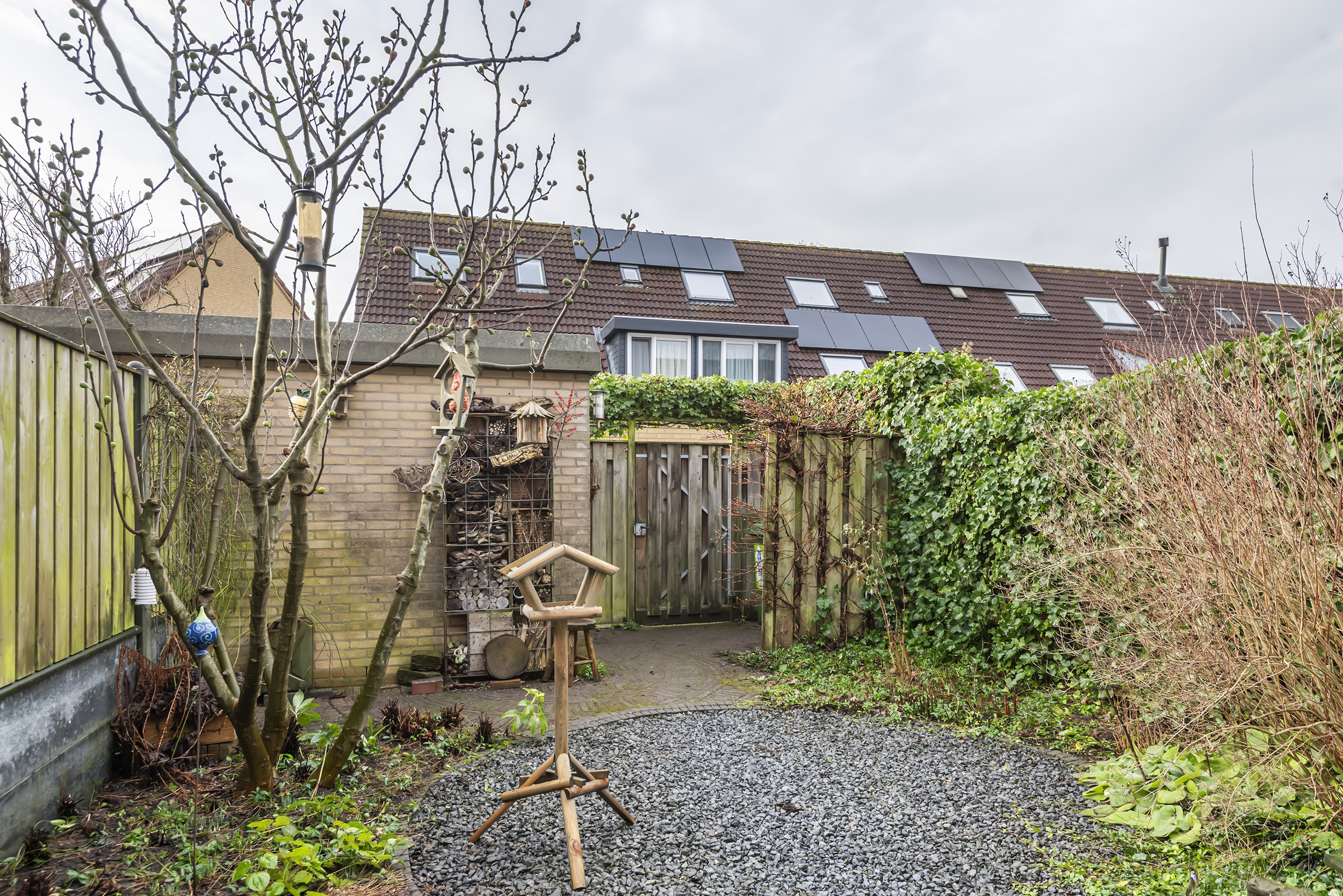 De verzorgde achtertuin is gunstig gelegen op het westen, waardoor je tot in de avond van de zon kunt genieten. Over de volledige breedte van de woning is een elektrisch uitvalscherm geplaatst, ideaal om op warme dagen schaduw en comfort te creëren. Achterin de tuin staat een praktische berging met een groendak, wat bijdraagt aan duurzaamheid. De tuin is bereikbaar via een achterom en er is zelfs een egelhuis aanwezig als groen en natuurvriendelijk detail. Direct achter de woning ligt een speeltuin, ideaal voor gezinnen met kinderen.