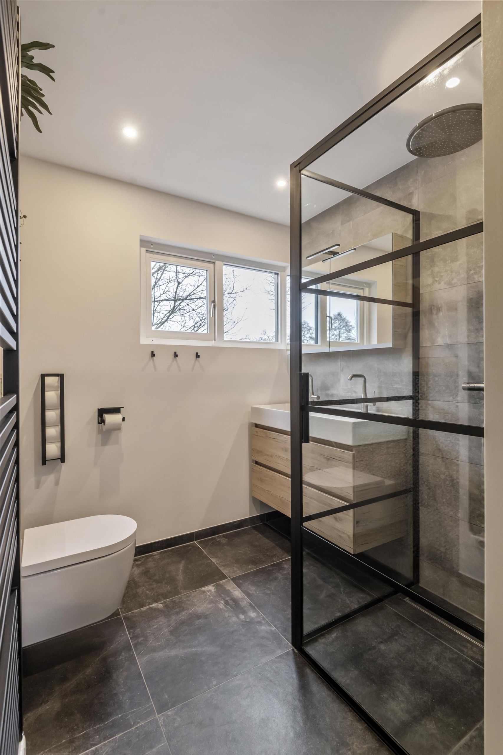 Op de eerste verdieping bevinden zich drie volwaardige slaapkamers en een luxe, moderne badkamer, die in 2021 volledig is vernieuwd. De badkamer is stijlvol afgewerkt en voorzien van een ruime inloopdouche, toilet, dubbele wastafel, designradiator en modern wastafelmeubel, wat zorgt voor een comfortabele en eigentijdse uitstraling.