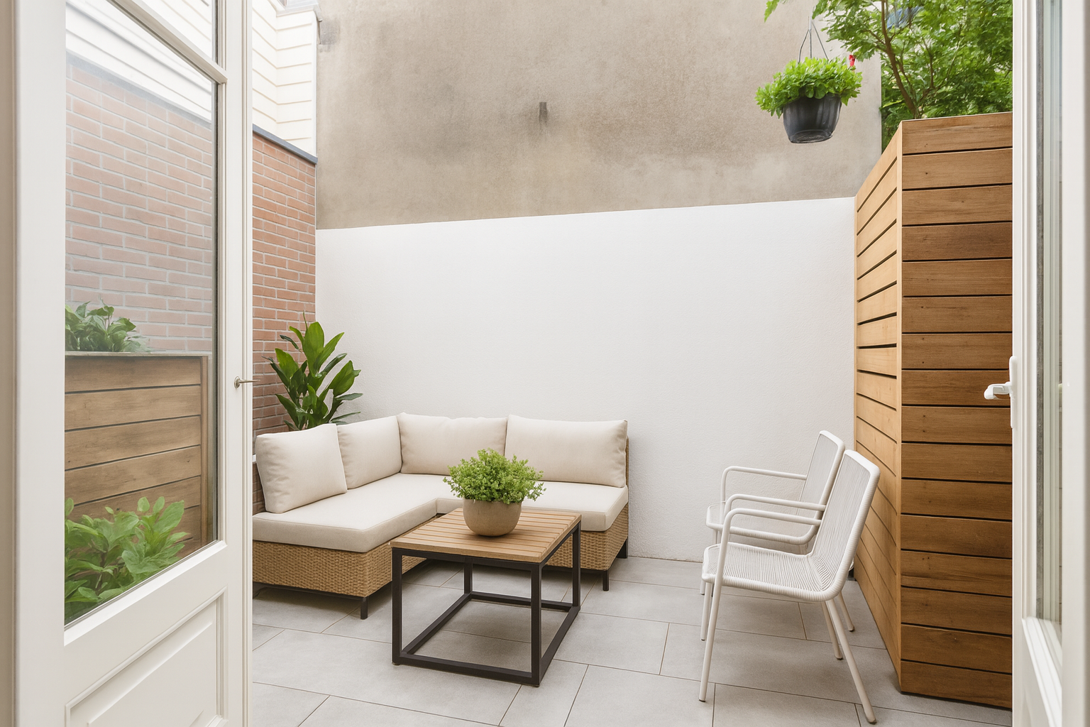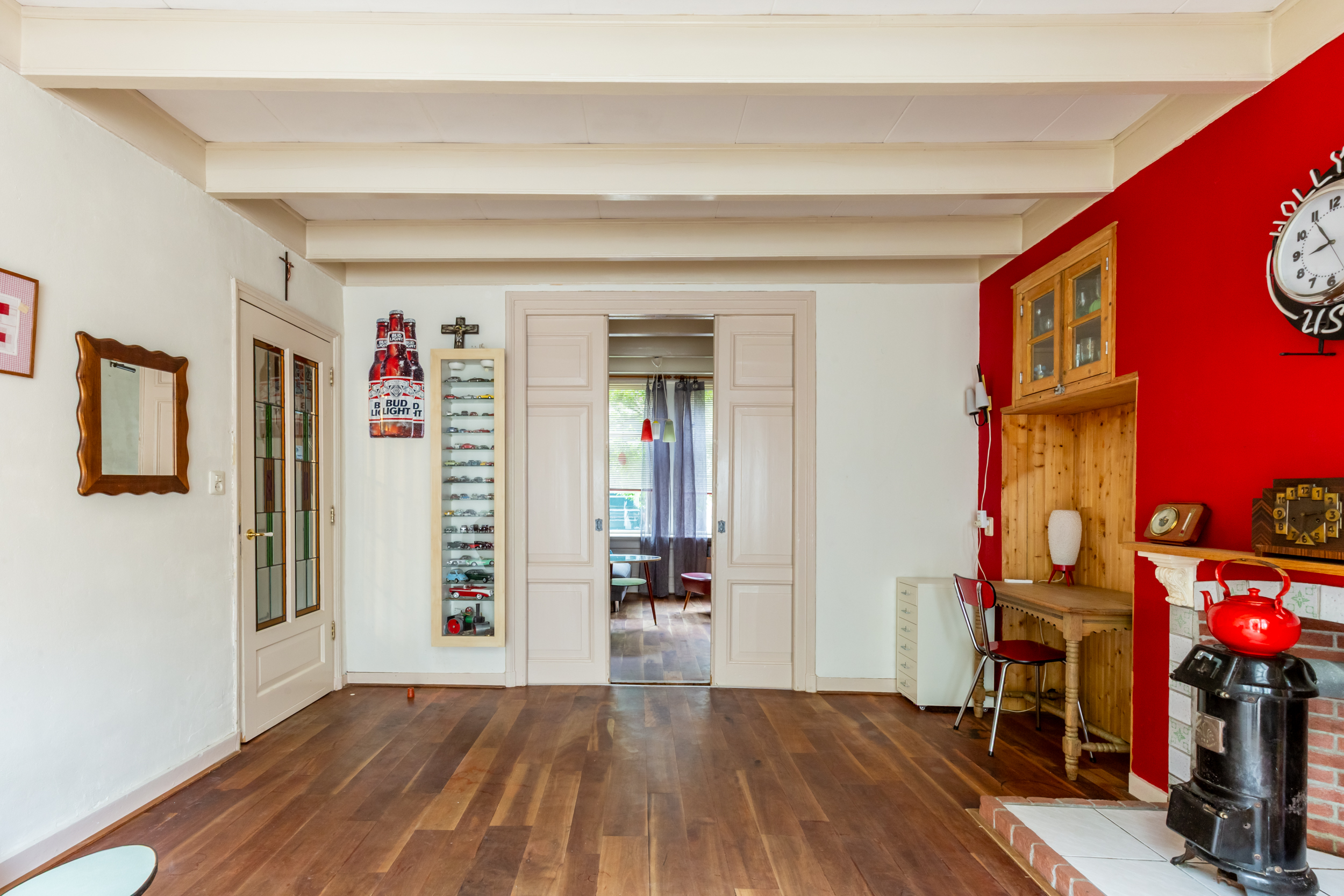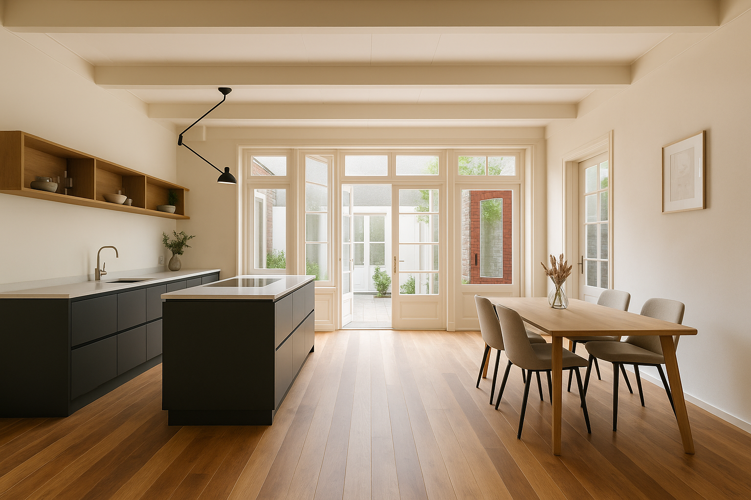 Woonkamer met ensuite-deuren en openslaande deuren naar de stadstuin.