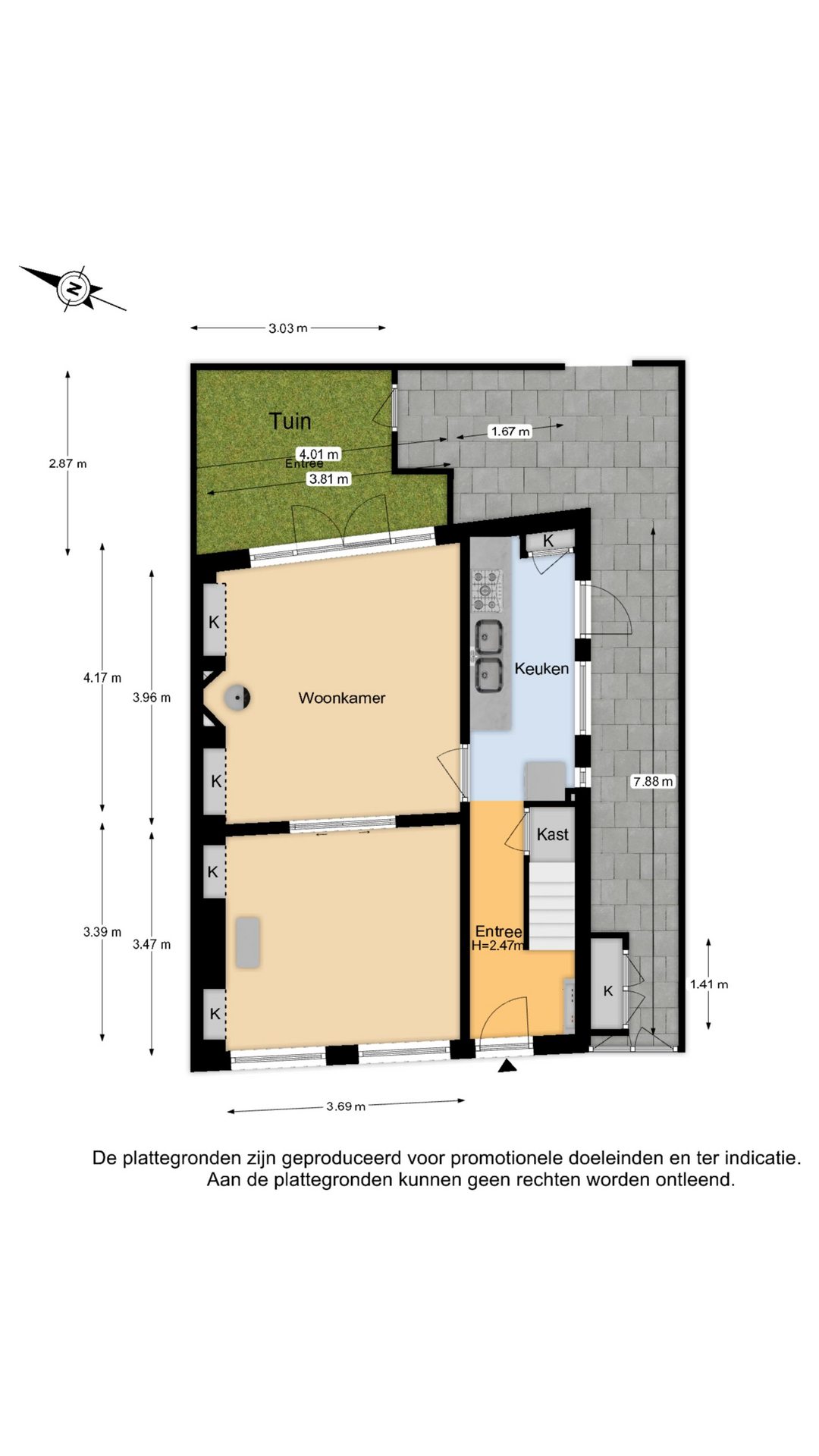 Entree/ hal, gang, keuken met deur naar de zijkant van het huis met poort en kast.