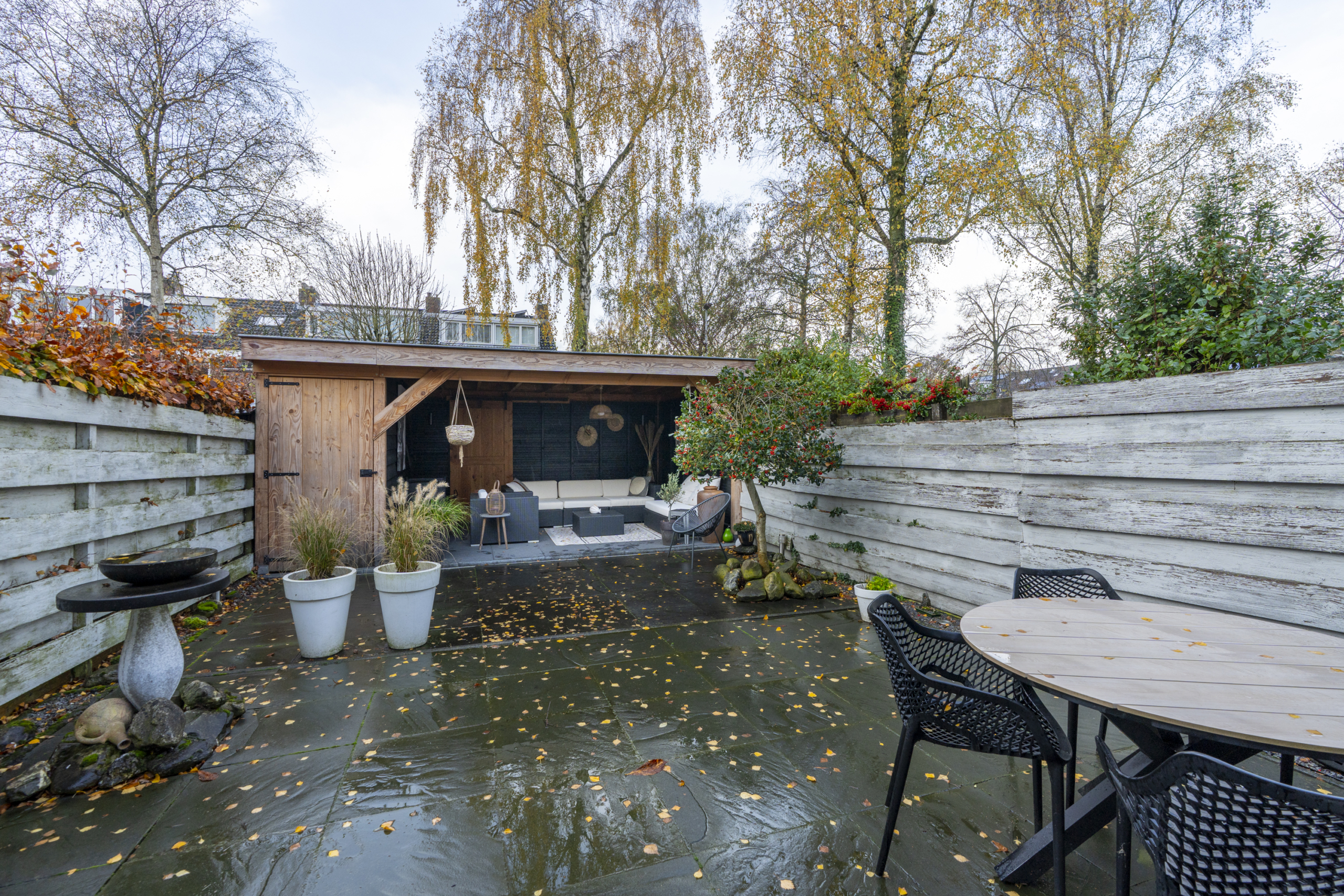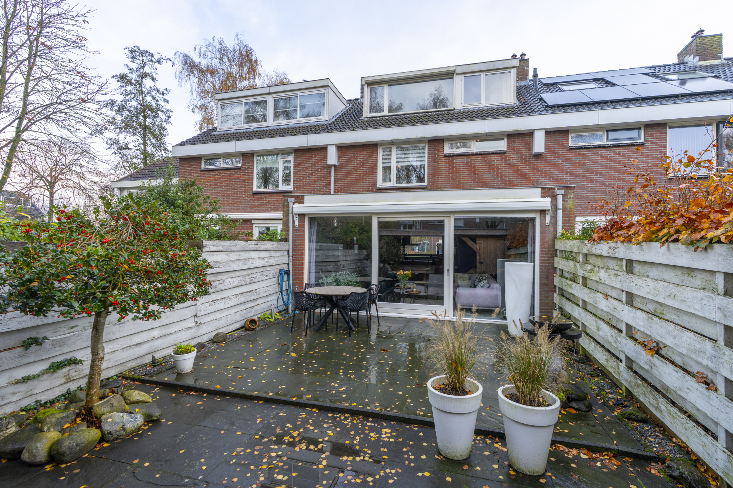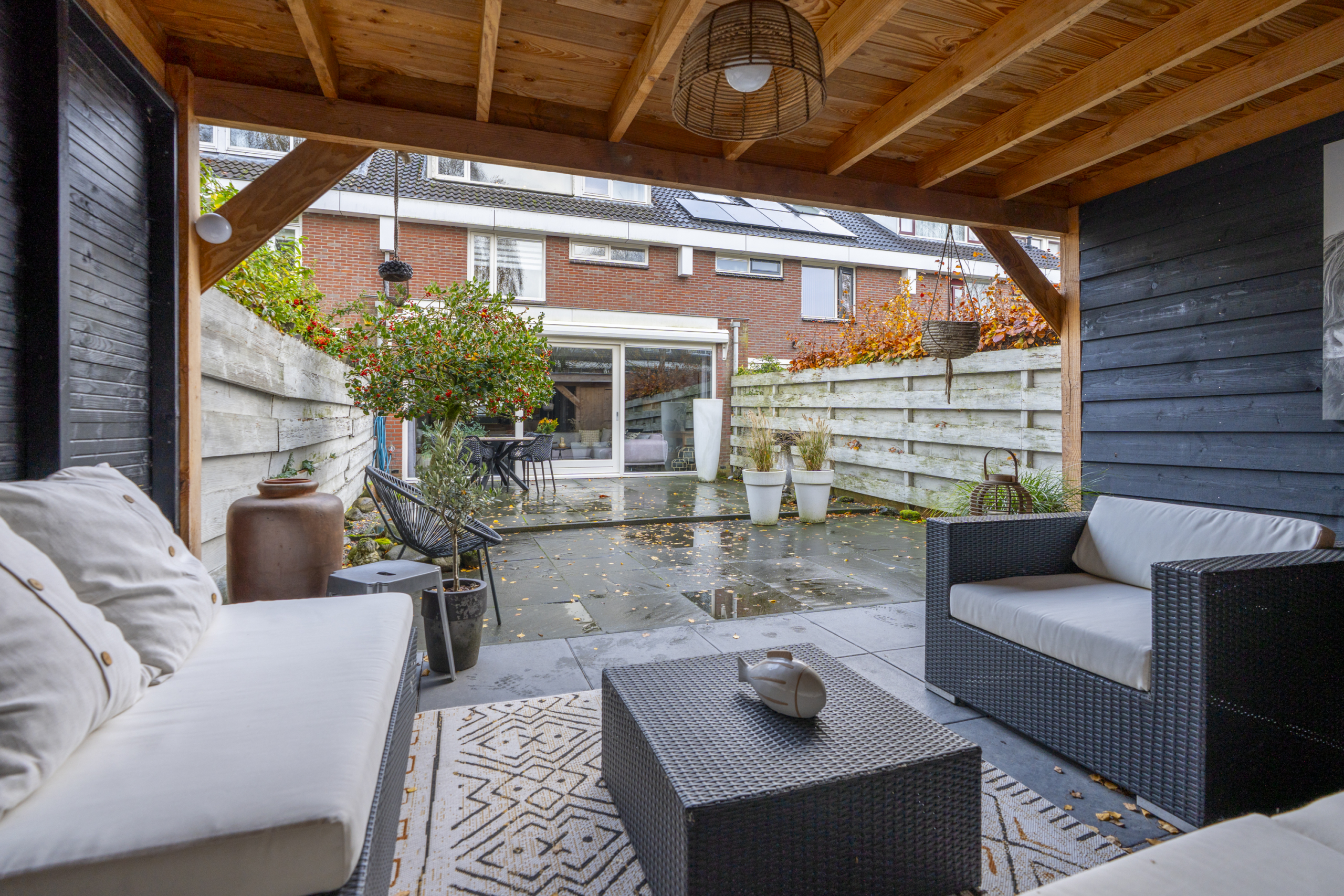 De achtertuin is een plek waar je gegarandeerd veel tijd zult doorbrengen. De verzorgde tuin met veranda zorgt voor een oase van rust. Onder de veranda kun je het hele jaar door genieten van het buitenleven, ’s ochtends starten met een kop koffie, ’s avonds ontspannen met een glas wijn of gezellig barbecueën met vrienden en familie. De ligging en de sfeer maken deze plek tot een echt verlengstuk van de woonkamer en zorgt ervoor dat je al bij de eerste aangename temperaturen buiten kunt zitten.