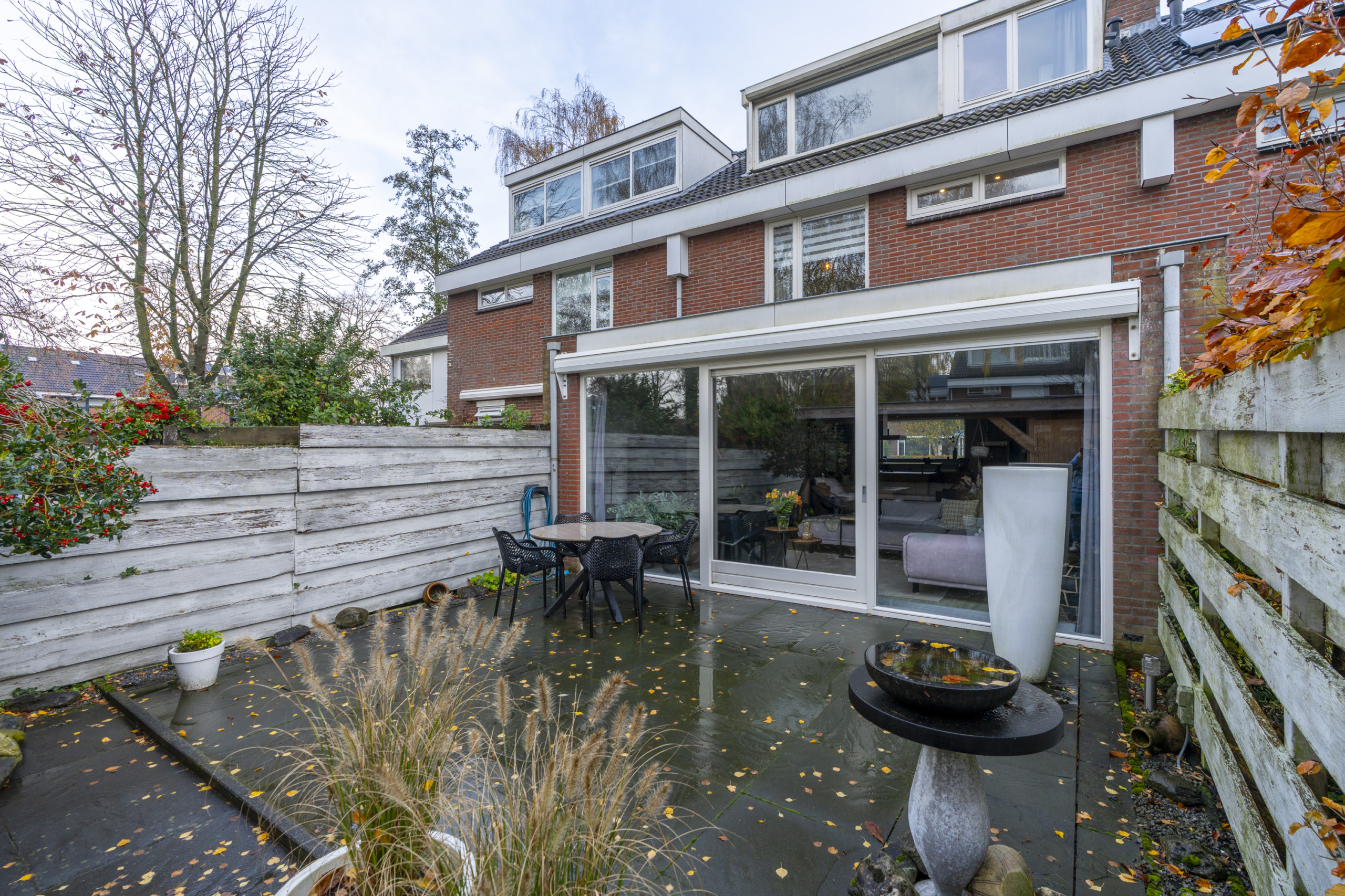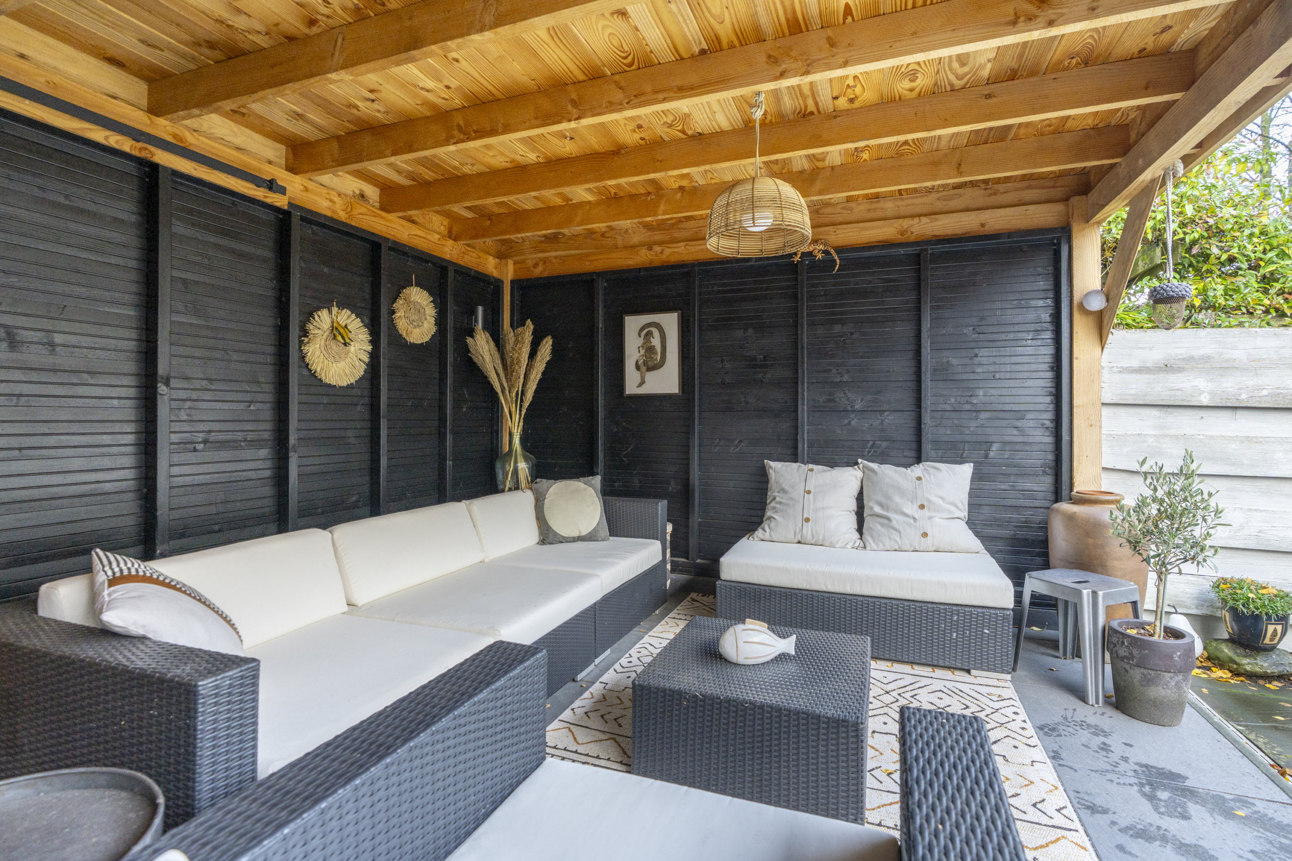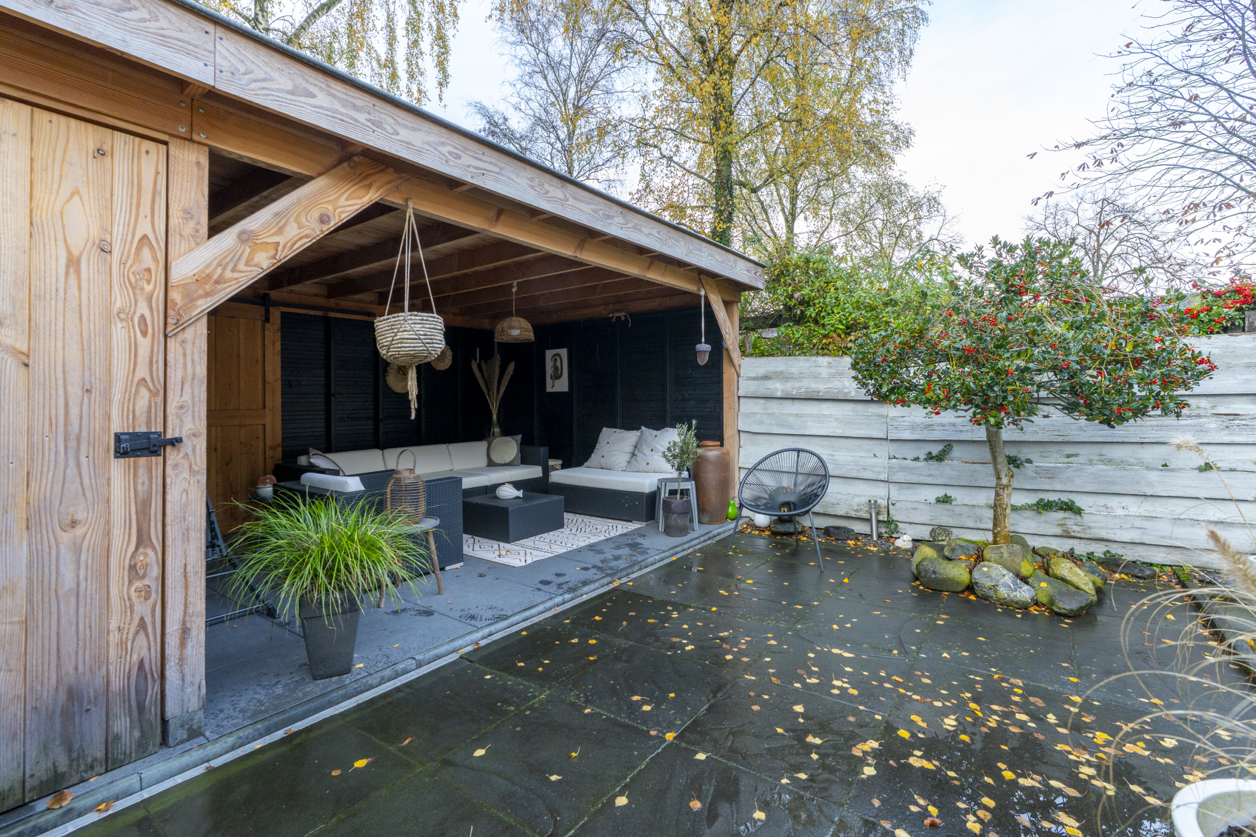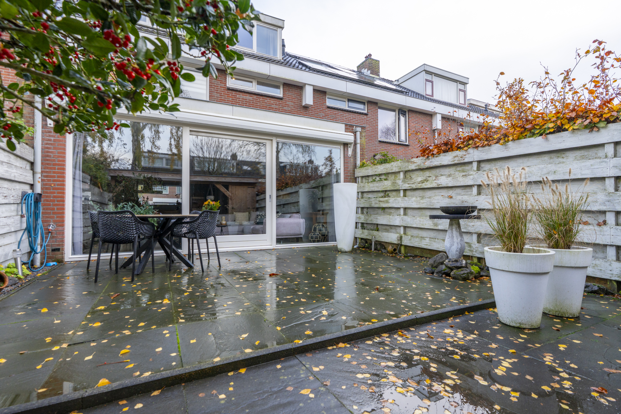 De achtertuin is een plek waar je gegarandeerd veel tijd zult doorbrengen. De verzorgde tuin met veranda zorgt voor een oase van rust. Onder de veranda kun je het hele jaar door genieten van het buitenleven, ’s ochtends starten met een kop koffie, ’s avonds ontspannen met een glas wijn of gezellig barbecueën met vrienden en familie. De ligging en de sfeer maken deze plek tot een echt verlengstuk van de woonkamer en zorgt ervoor dat je al bij de eerste aangename temperaturen buiten kunt zitten.