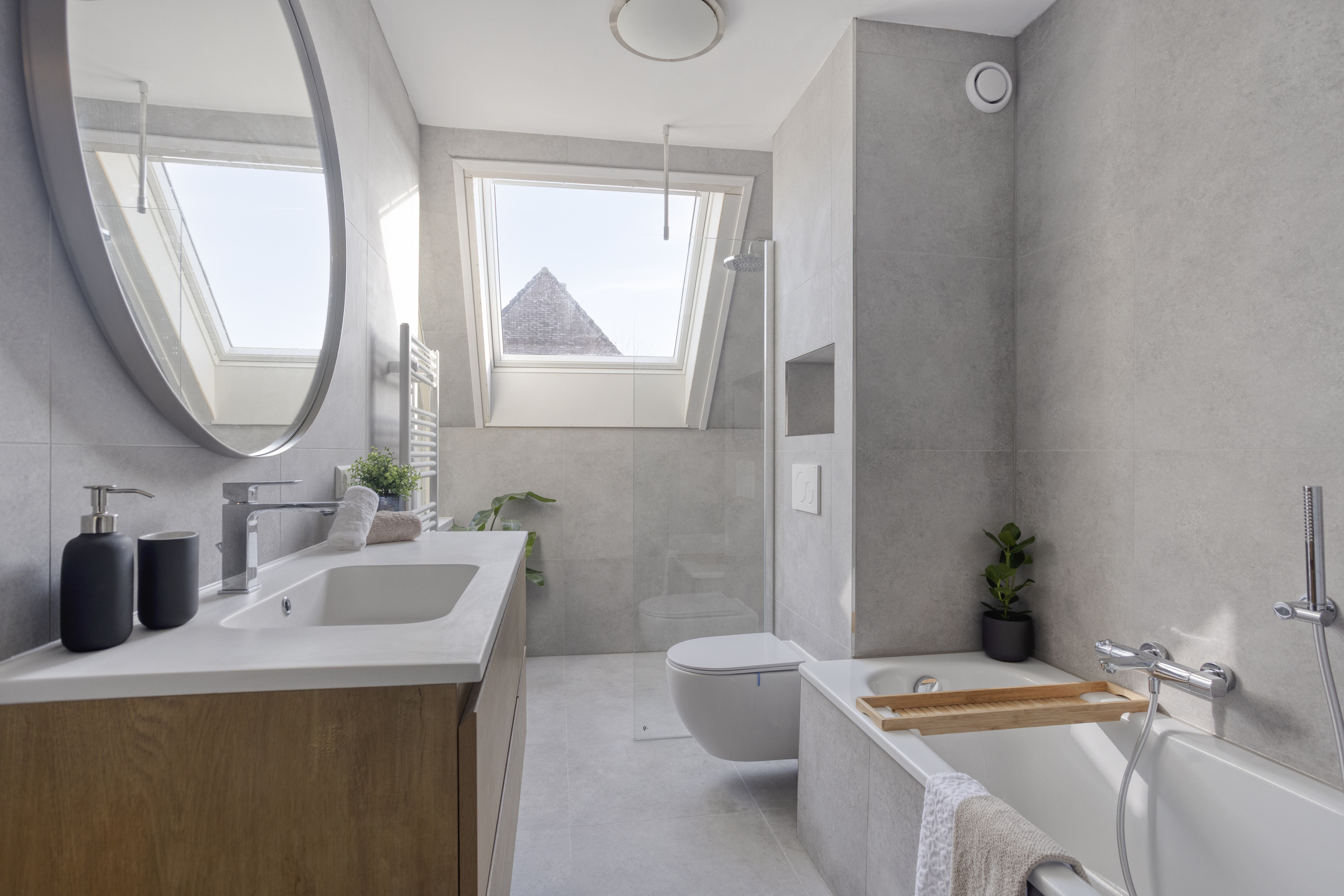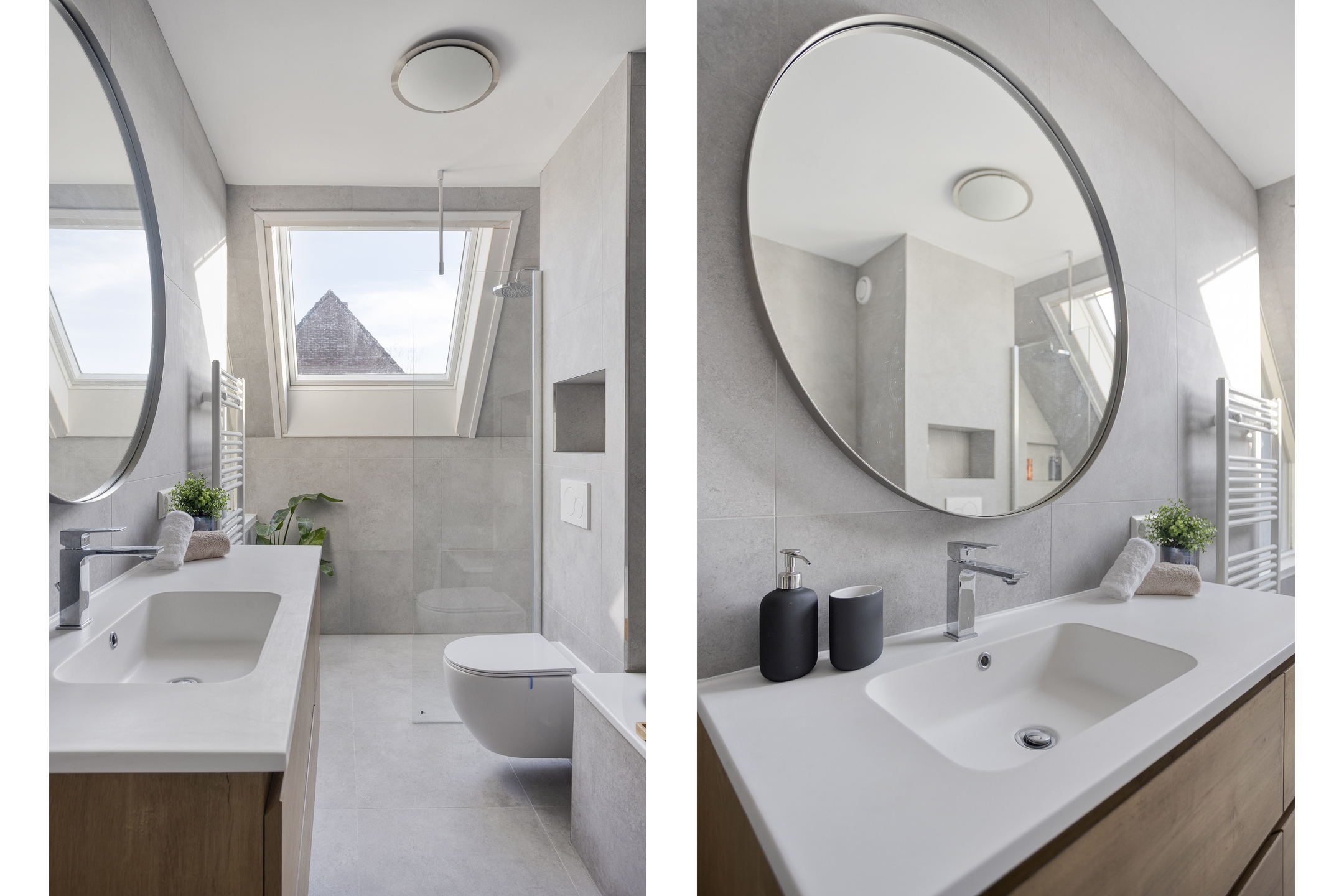 Overloop met toegang tot drie volwaardige slaapkamers. De moderne badkamer uit 2025 is luxe uitgevoerd met inloopdouche, ligbad, 2e toilet en wastafelmeubel – strak uitgevoerd en direct gereed voor gebruik.