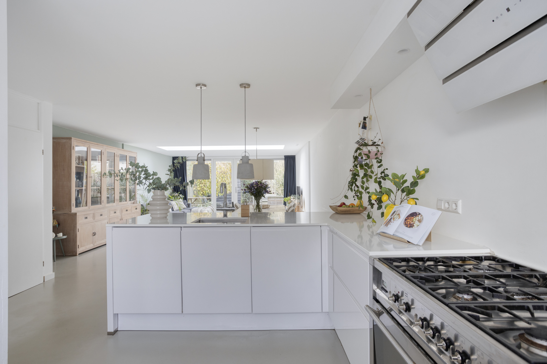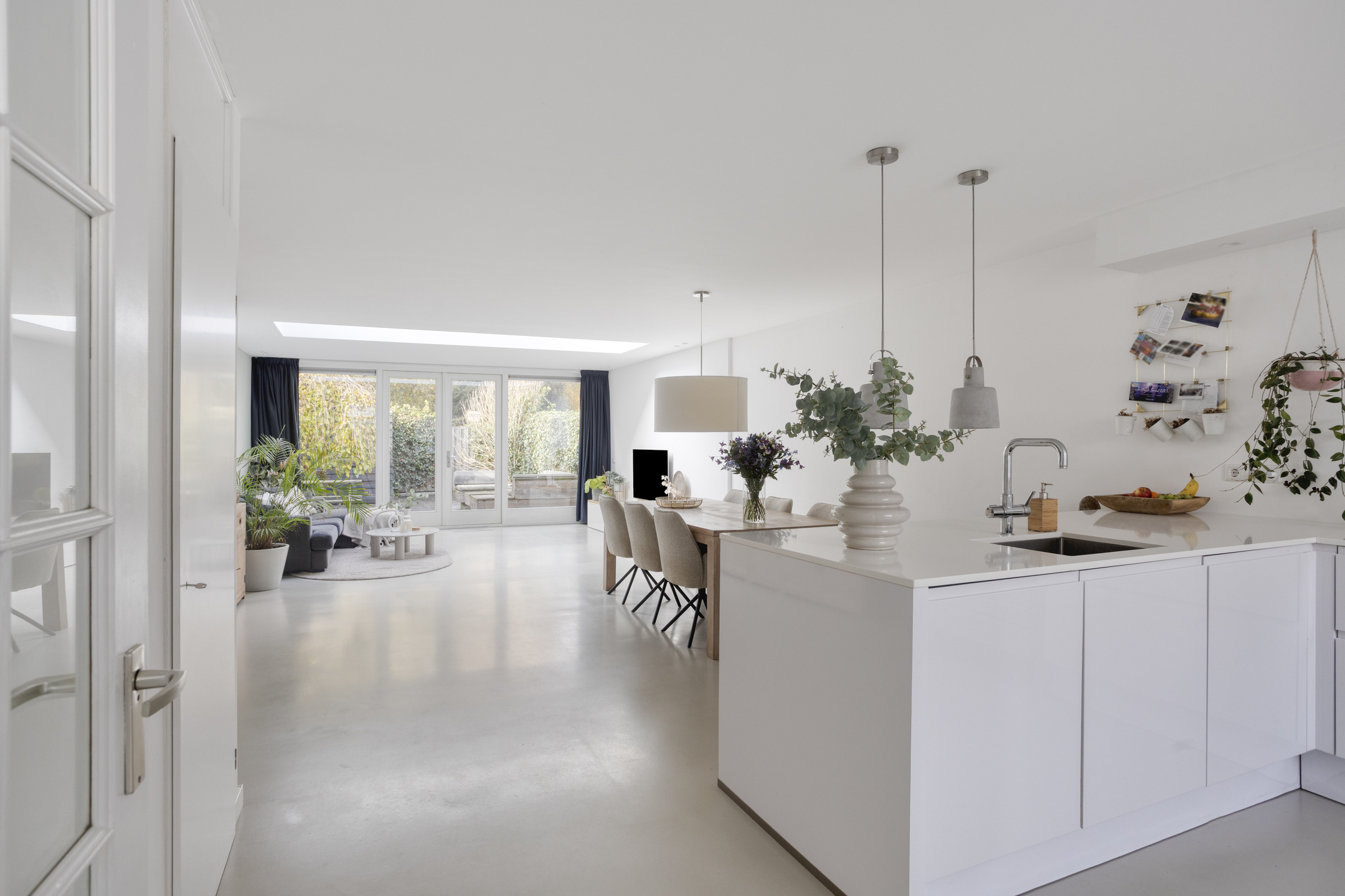 Ruime entree met moderne vloerafwerking (gietvloer), toiletruimte en toegang tot de ruime hal. De royale woonkamer is heerlijk licht dankzij de uitbouw met lichtstraat en staat middels openslaande deuren in verbinding met de zonnige tuin op het west-noordwesten. De moderne open keuken (Nolte) is uitgerust met kwaliteitsapparatuur van Siemens Studioline met o.a. een combi-oven, extra grote koelkast en separate vriezer, vaatwasser, koffiemachine en een kokend-waterkraan van Grohe — perfect voor families en voor wie graag kookt. Zowel de begane grond als de overige verdiepingen zijn voorzien van een luxe gietvloer; op de begane grond is vloerverwarming aanwezig.