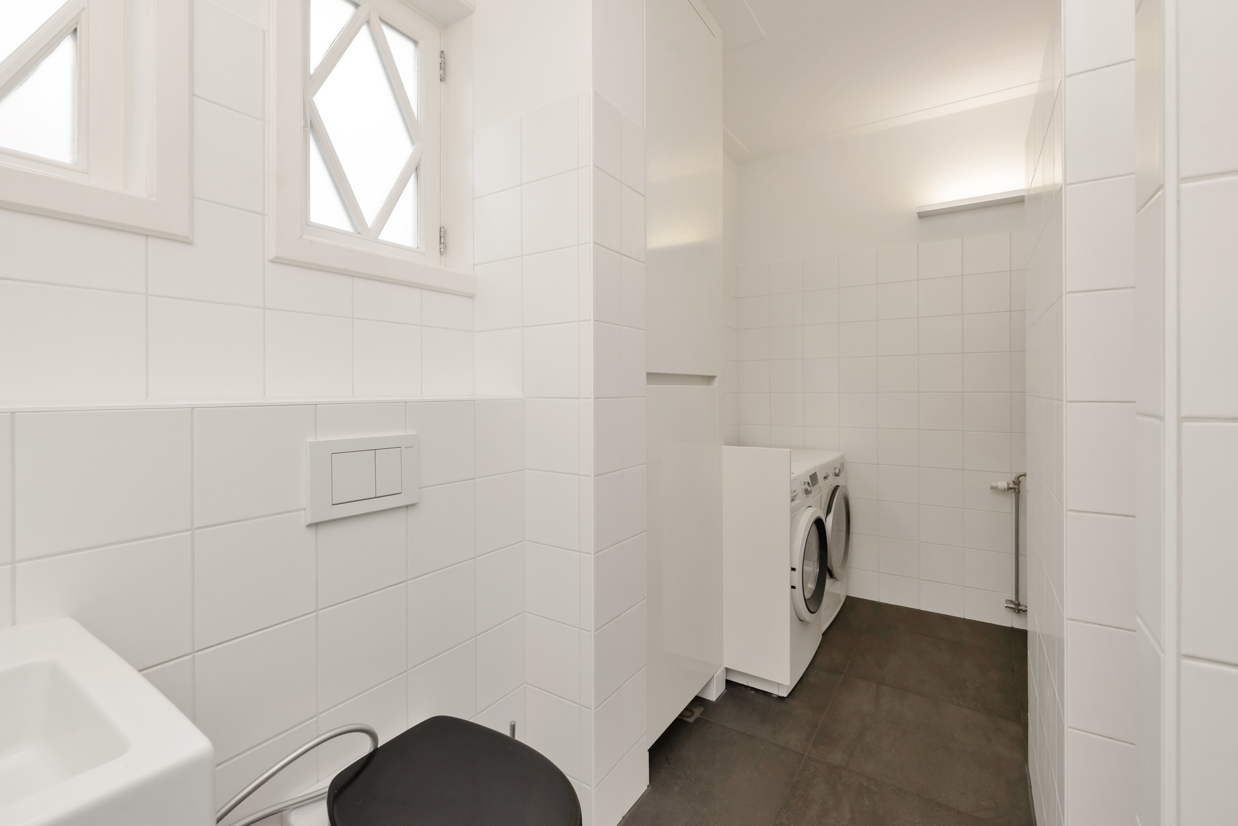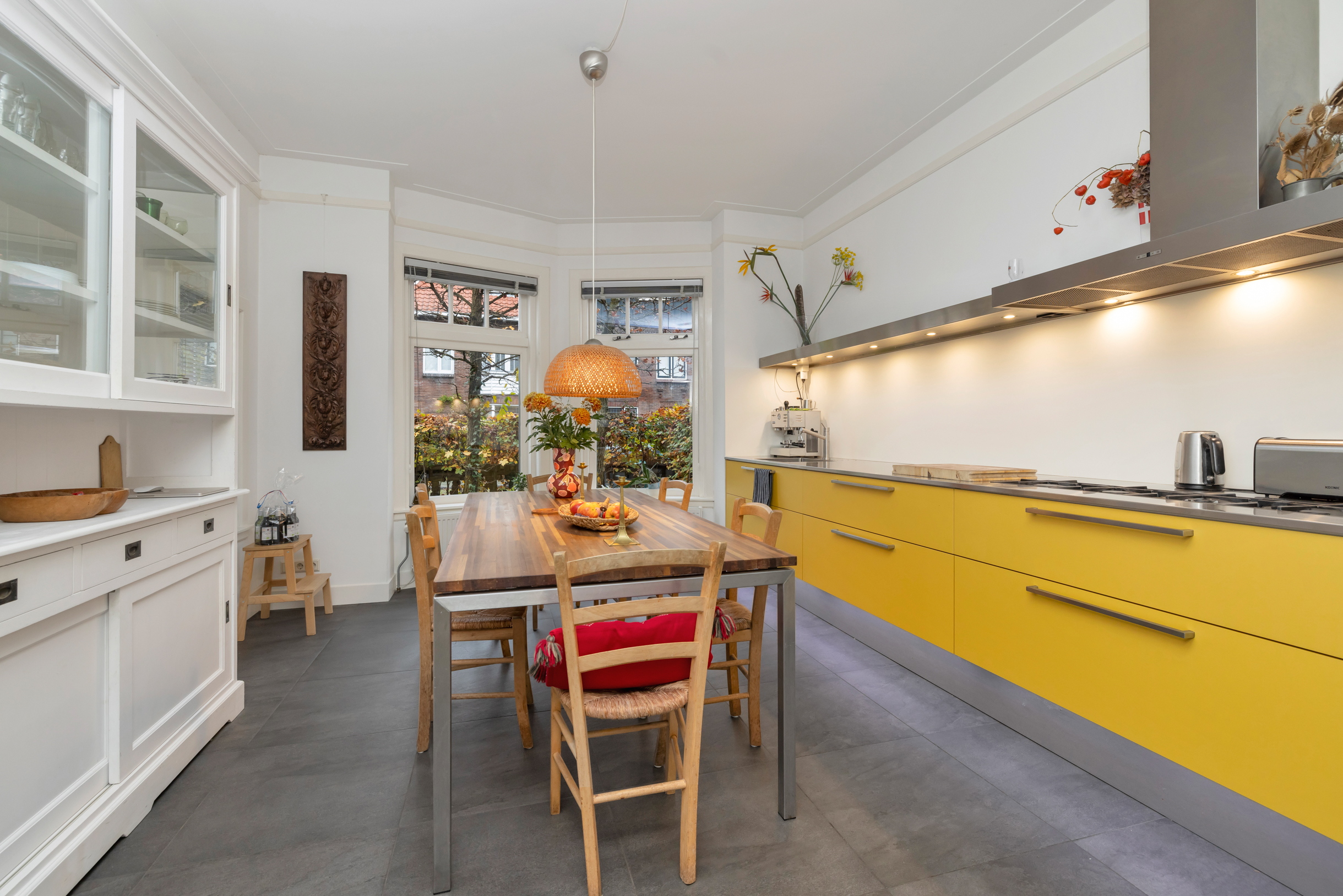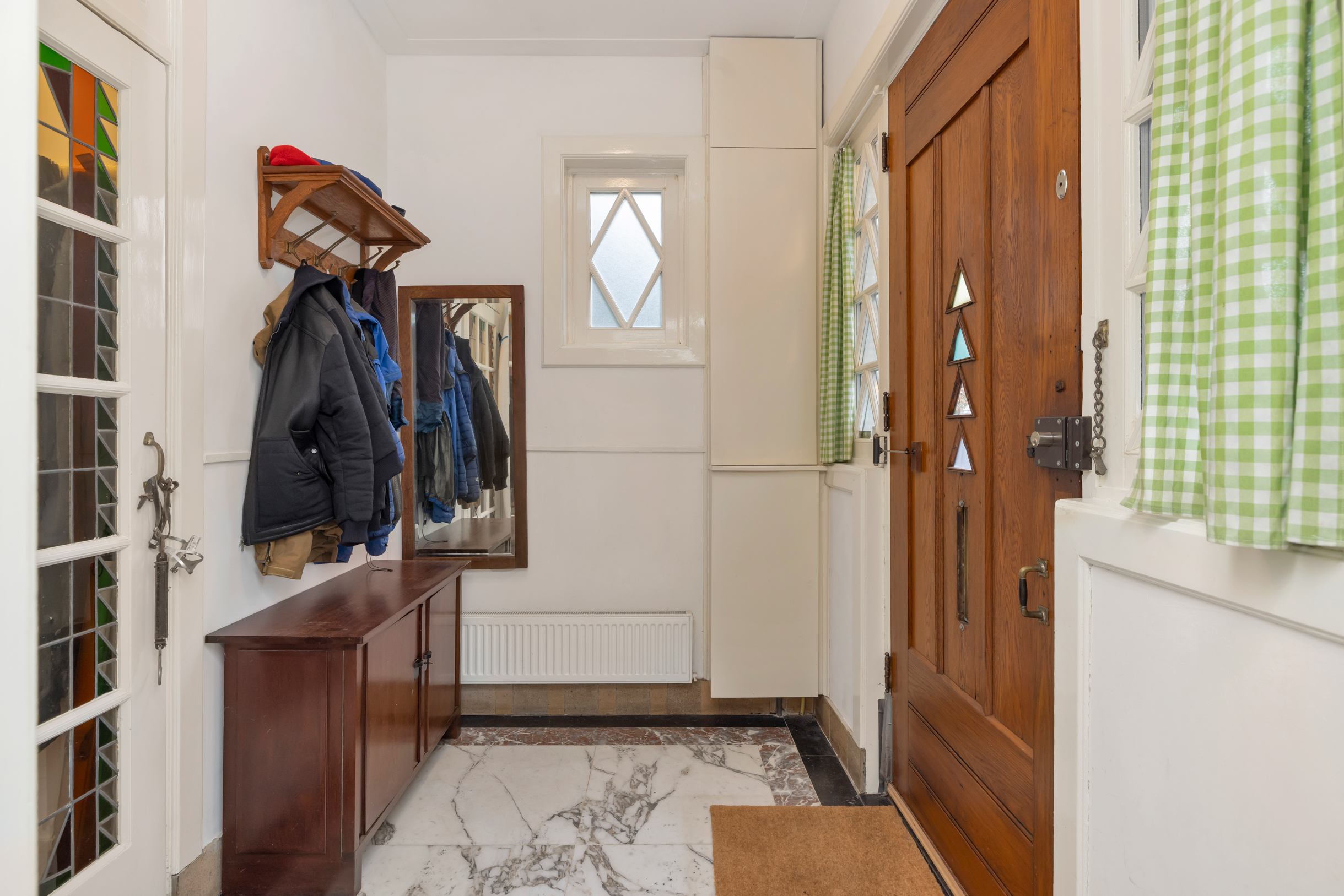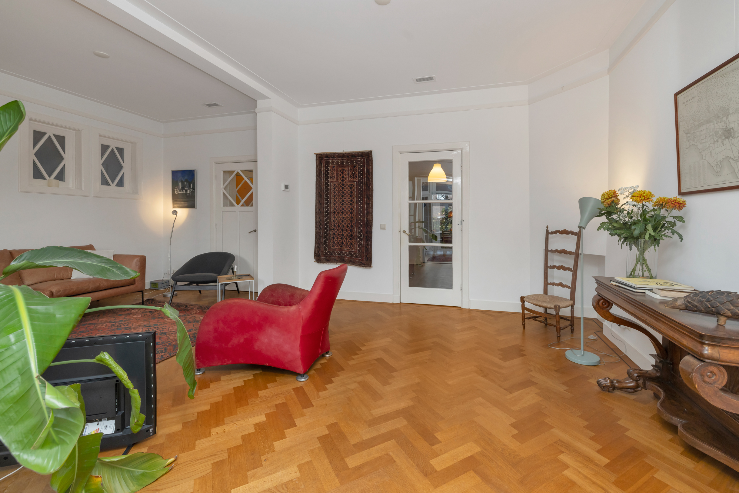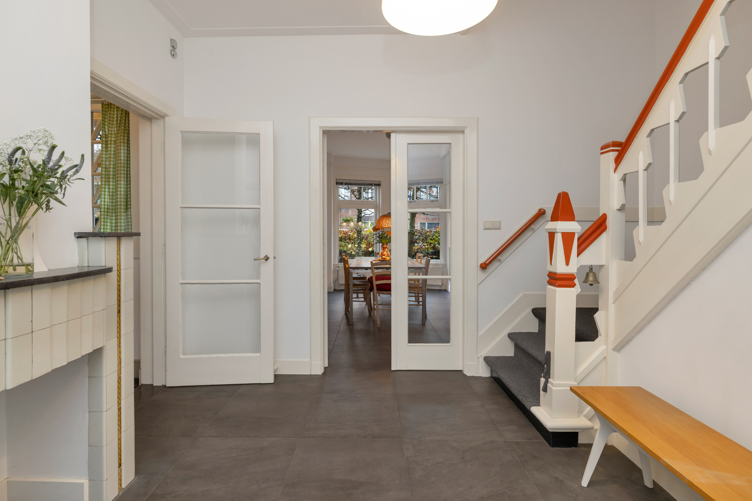 Fraaie entree met teakhouten voordeur, ruim tochtportaal met fraaie originele marmeren vloerplaten en glas in lood ramen, royale hal met representatief “Amsterdamse School” trappenhuis en karaktervolle schouw, ondergelegen ruime kelderruimte, tussenhal c.q. garderobe, apart toilet (zwevend) met hardstenen fontein, fraaie karaktervolle L-vormige living met brede visgraat parketvloeren met dubbele bies doorlopend in serre met schuifdeuren en openslaande deuren naar tuin (ZW), moderne woonkeuken met voorerker en diverse RVS inbouw- en losse apparatuur, RVS-aanrechtblad en stenen vloer;