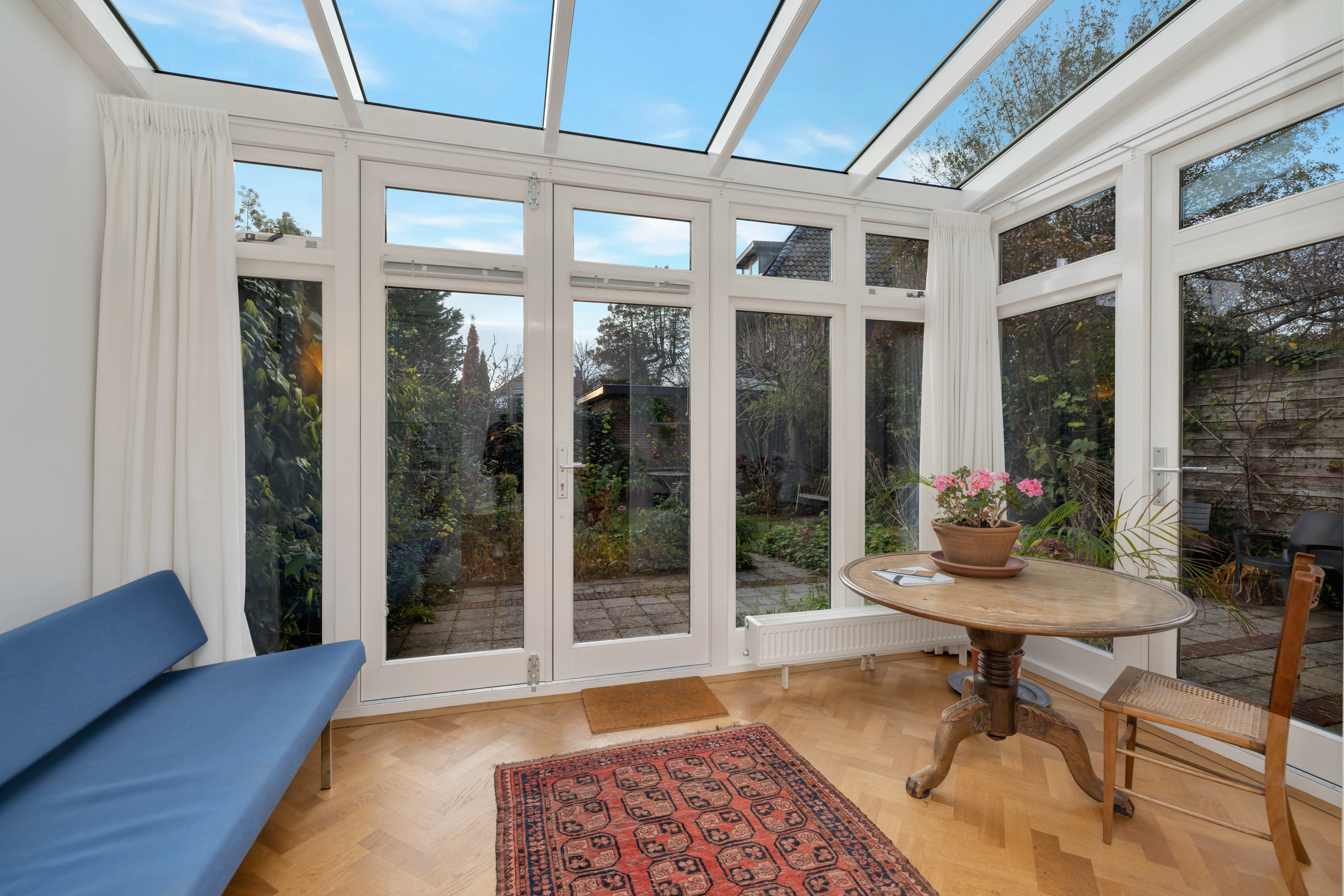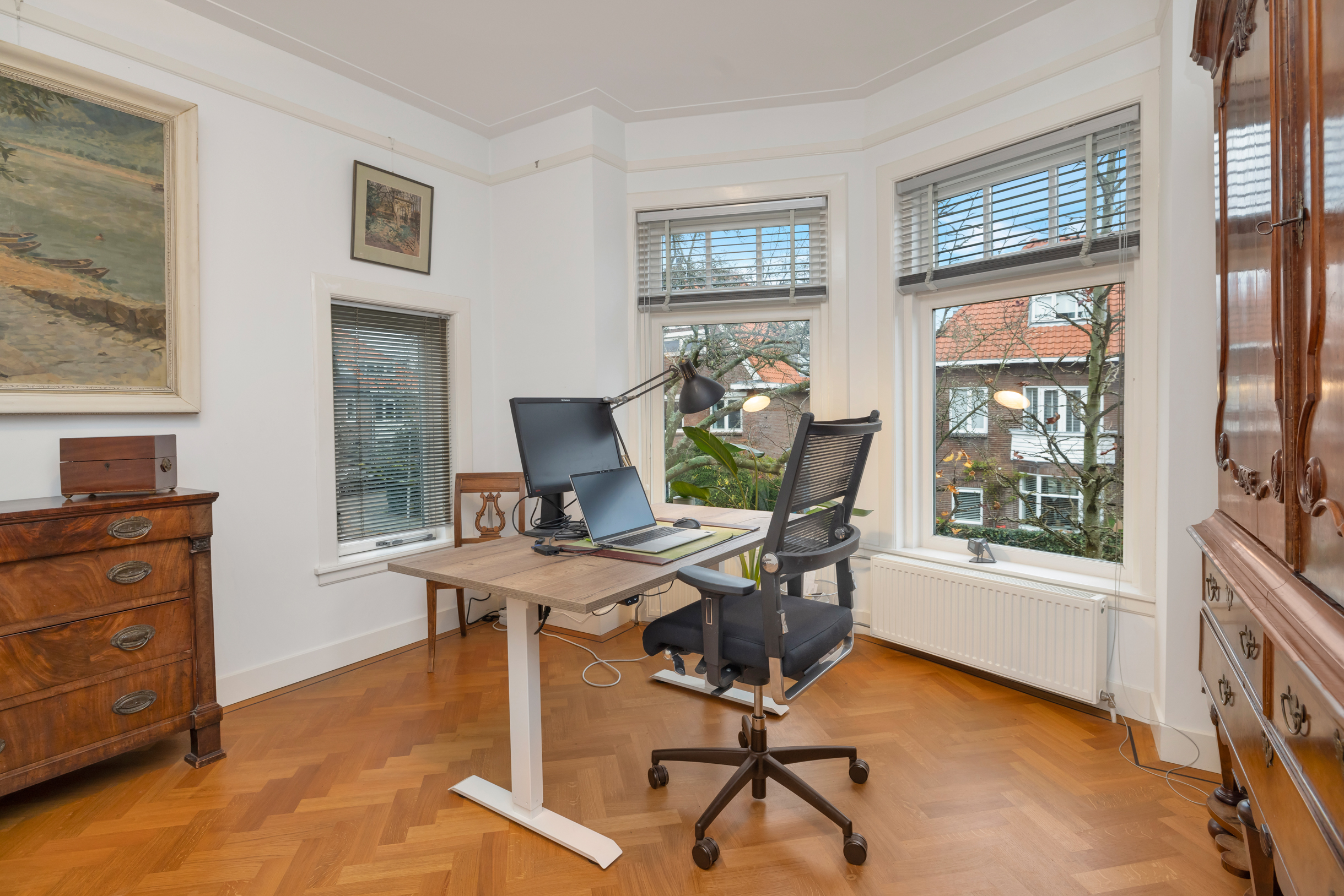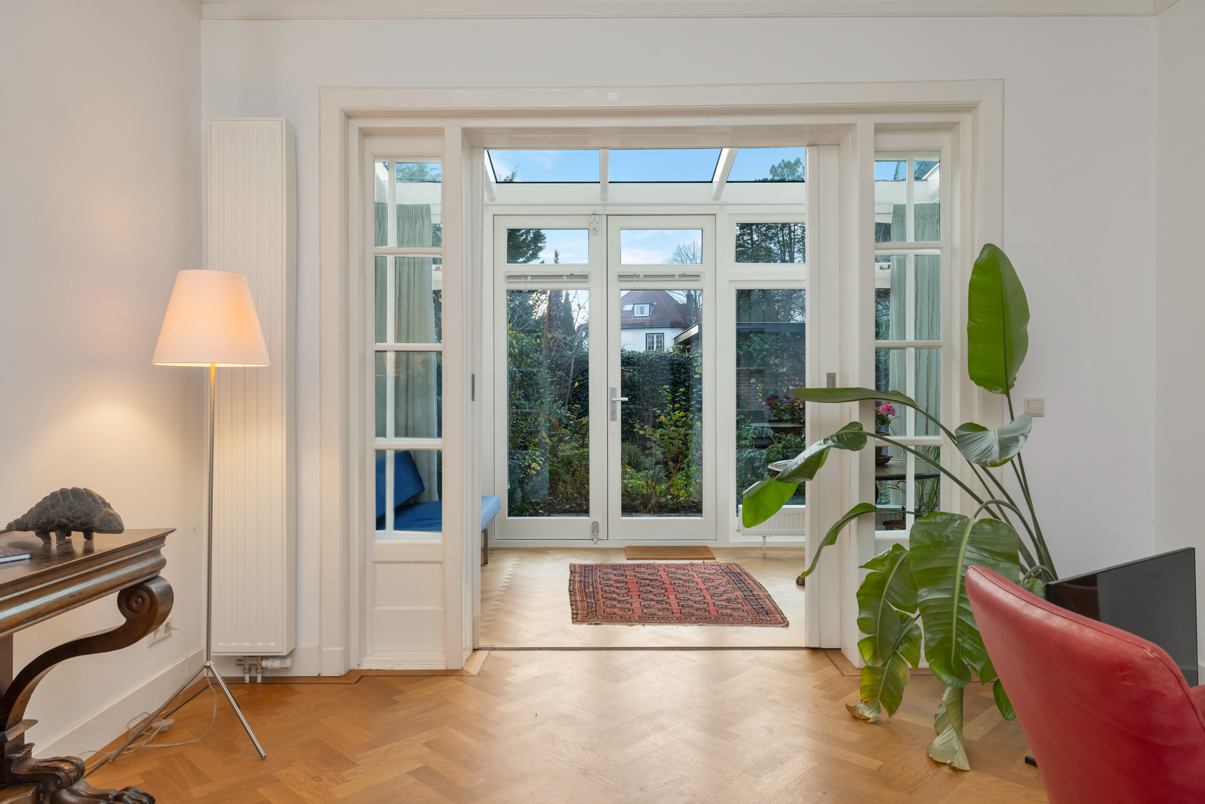 Een woning met omvang, ruime moderne woonkeuken met erker, royale hal met trappenhuis, L-vormige huiskamer met fraaie karaktervolle parketvloeren met dubbele bies doorlopend in lichte serre met openslaande deuren naar een zonnige tuin. Op de verdiepingen vijf royale slaapkamers