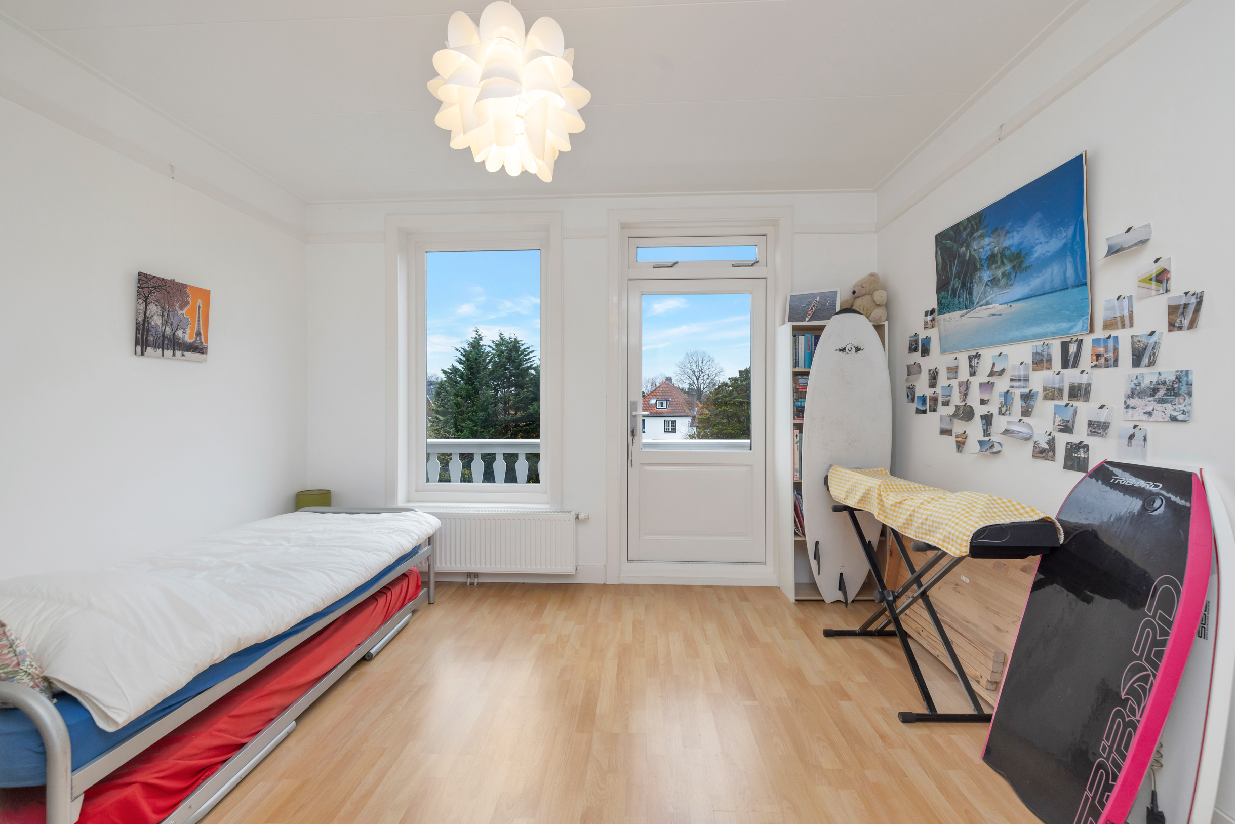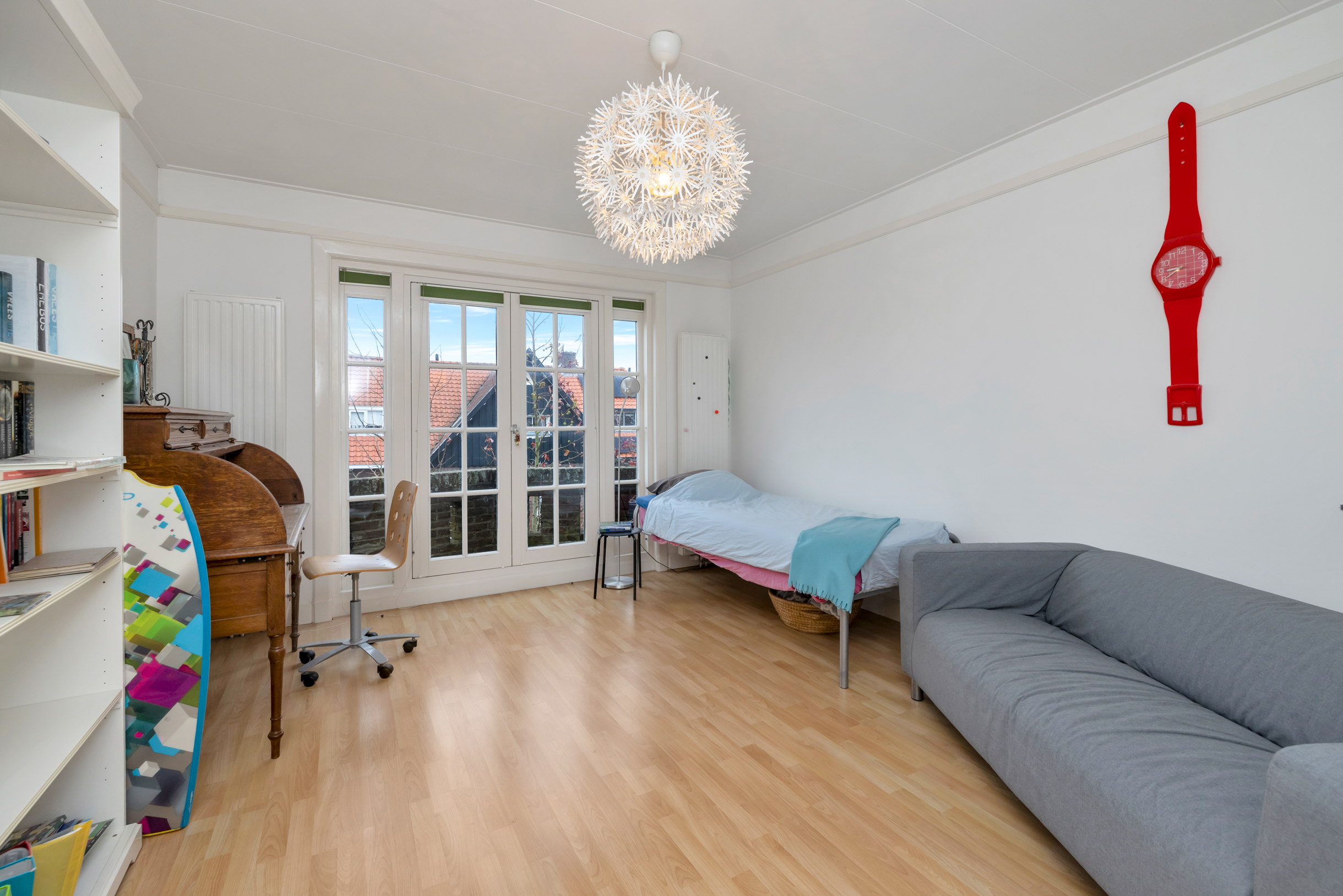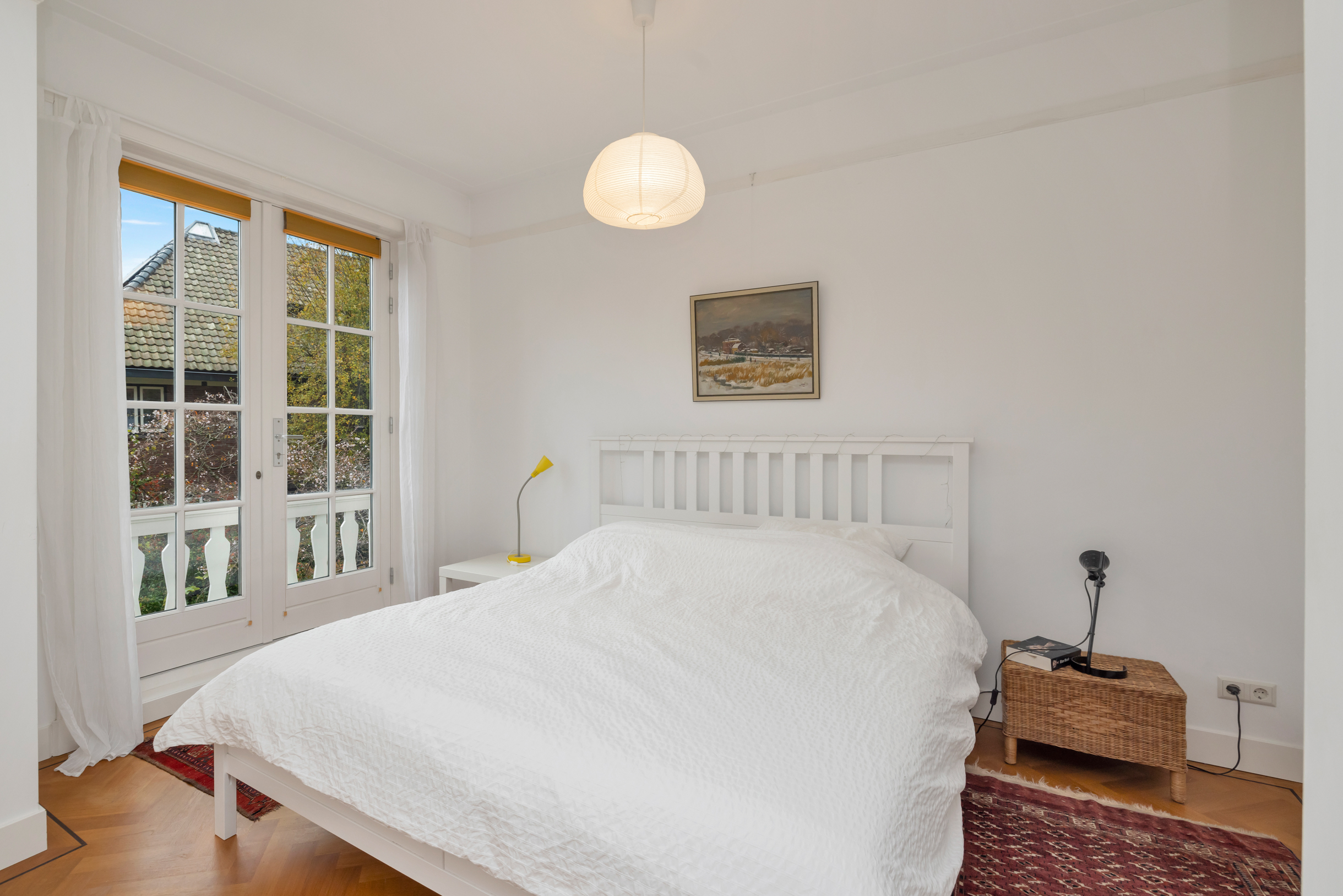 Via de dubbele bordestrap naar een ruime overloop met fraaie stijlvolle schouw, voorslaap- werkkamer met schouw, erker, brede visgraatparketvloer met enkele bies en inbouwkast, royale achterslaapkamer (voorheen 2 kamers) met erker, brede visgraatparketvloer en enkele bies, kastenwand plus openslaande deuren naar frans balkon (ZW), tussenliggende moderne ruime badkamer met inloopdouche, 2e toilet (zwevend), wastafel en wasmachine/droger aansluiting en CV-ketel;