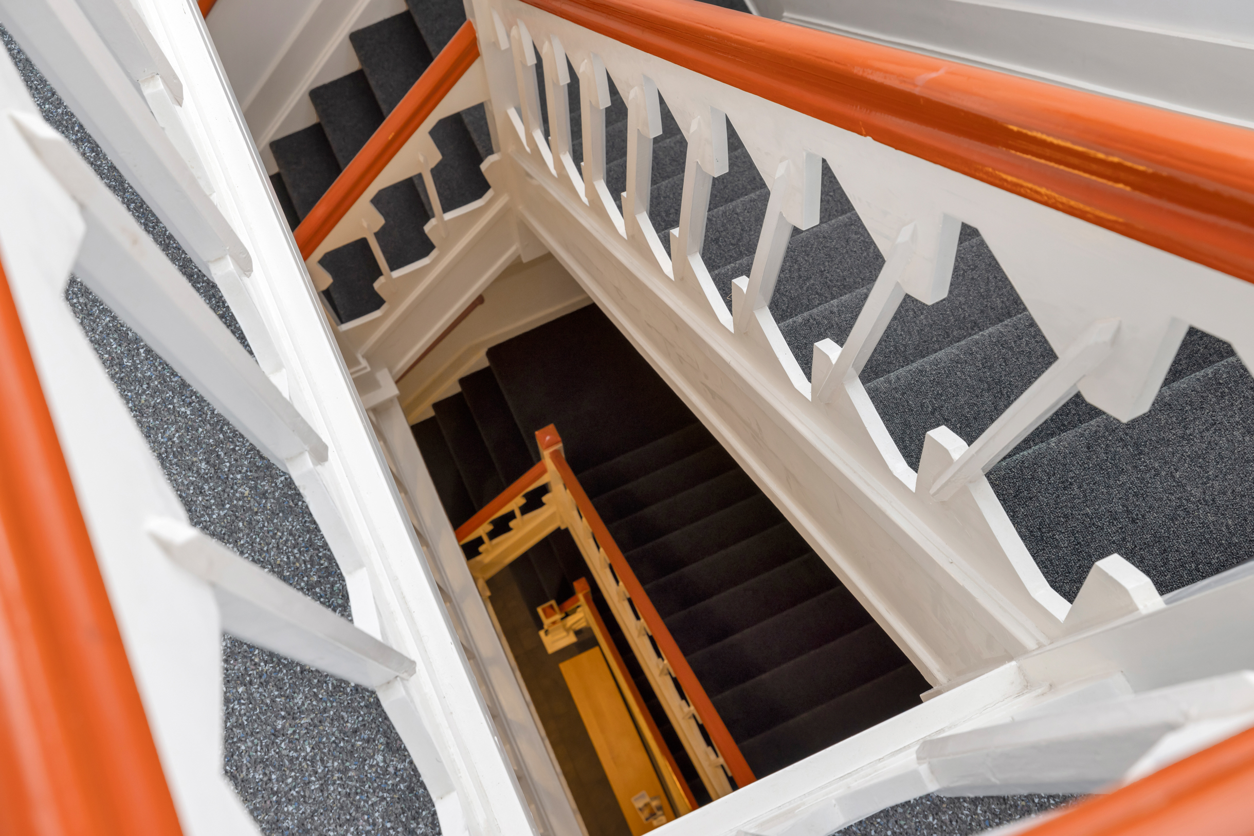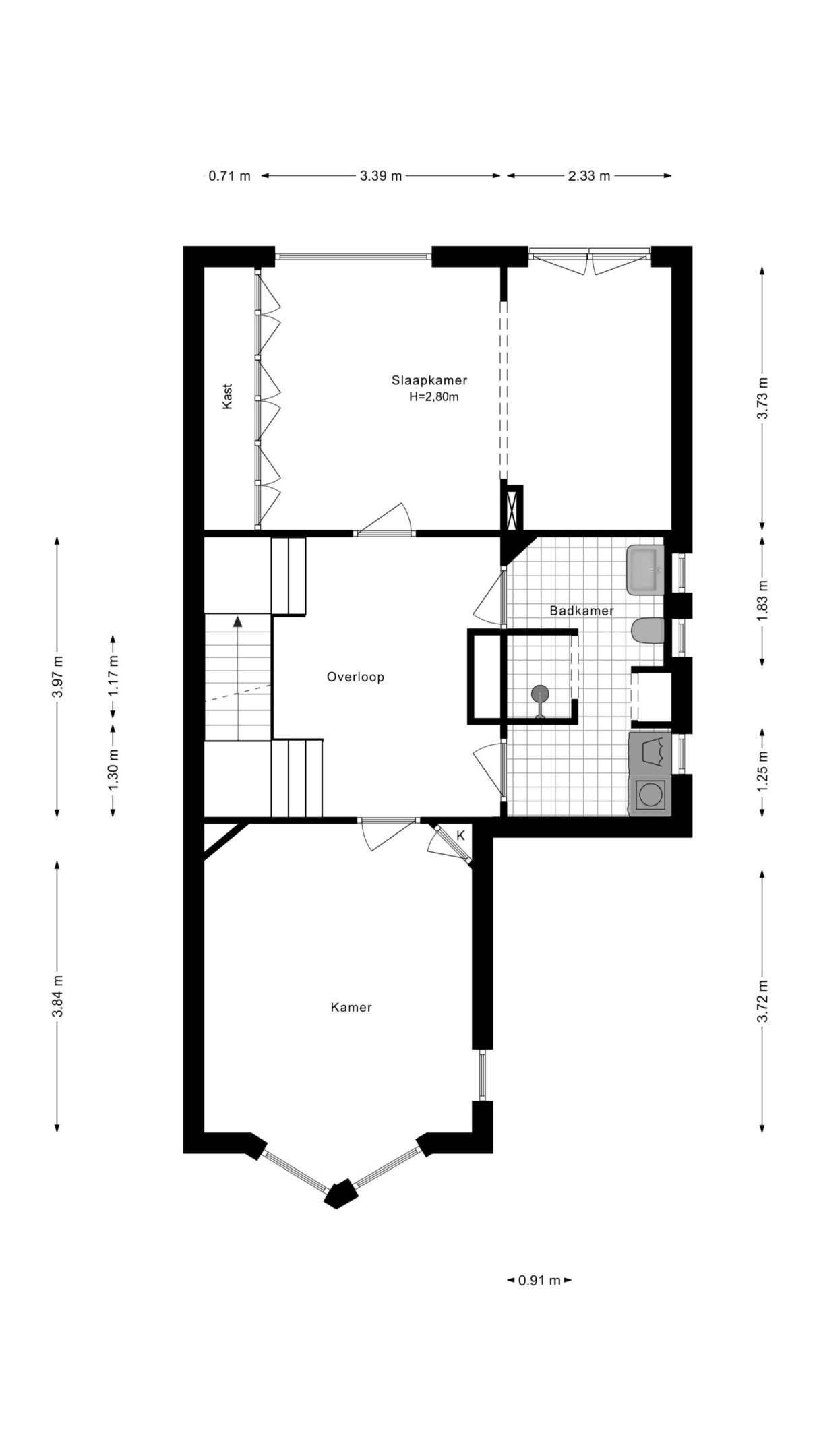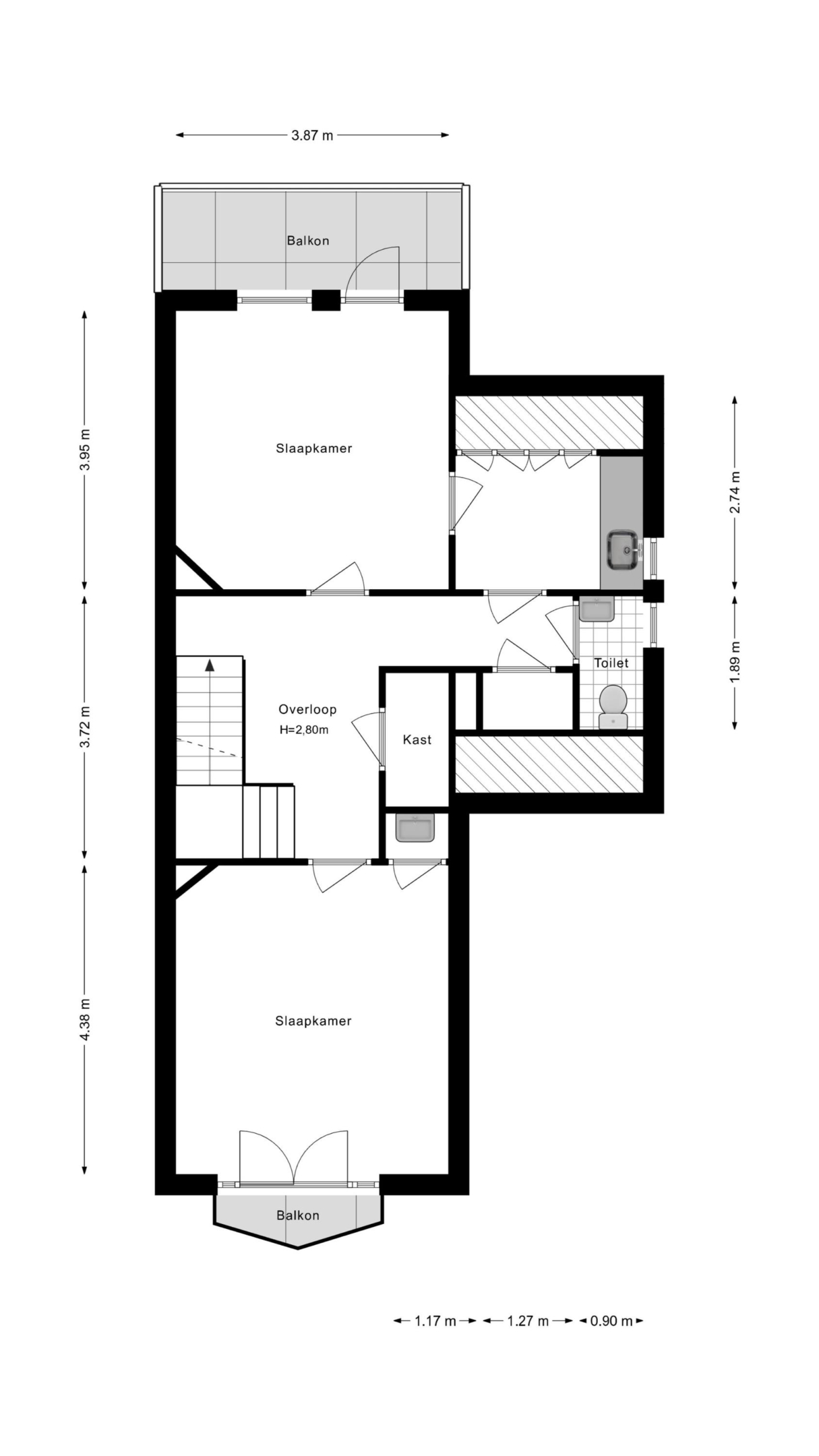 Via bordestrap naar overloop met vaste kast, ruime voorslaapkamer met schouw,