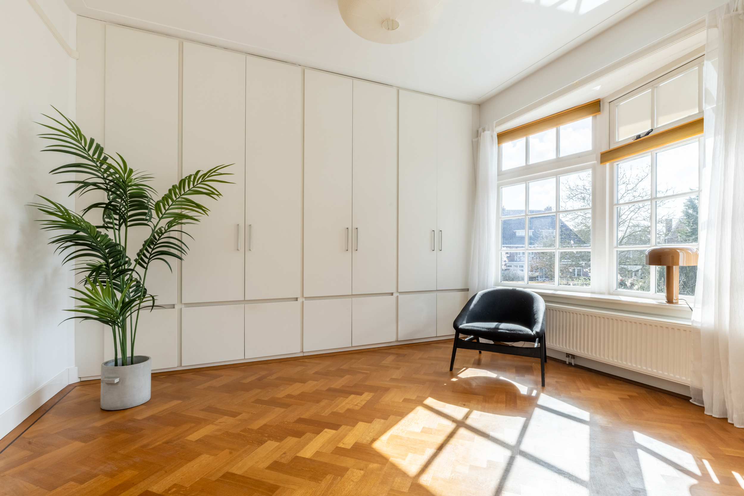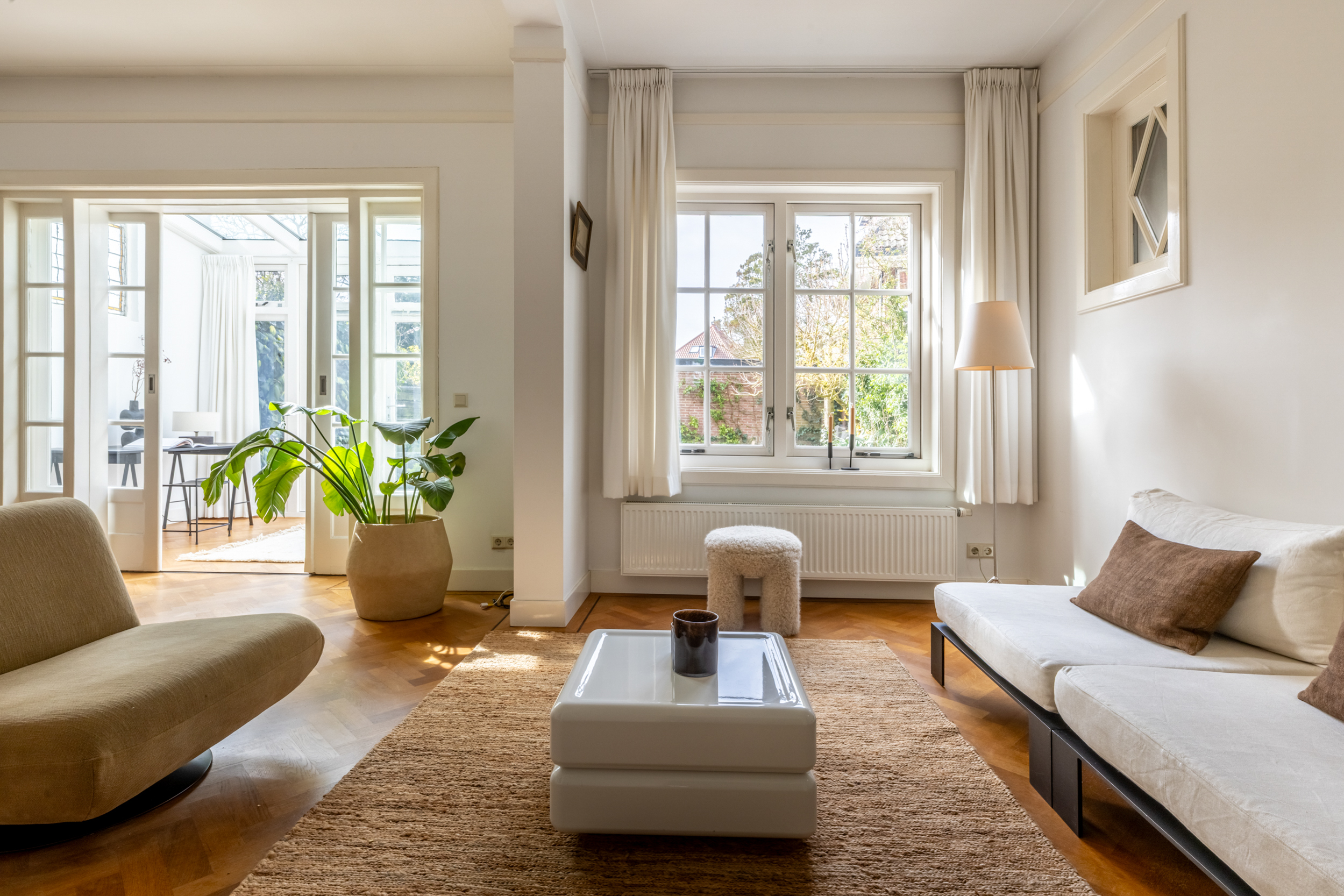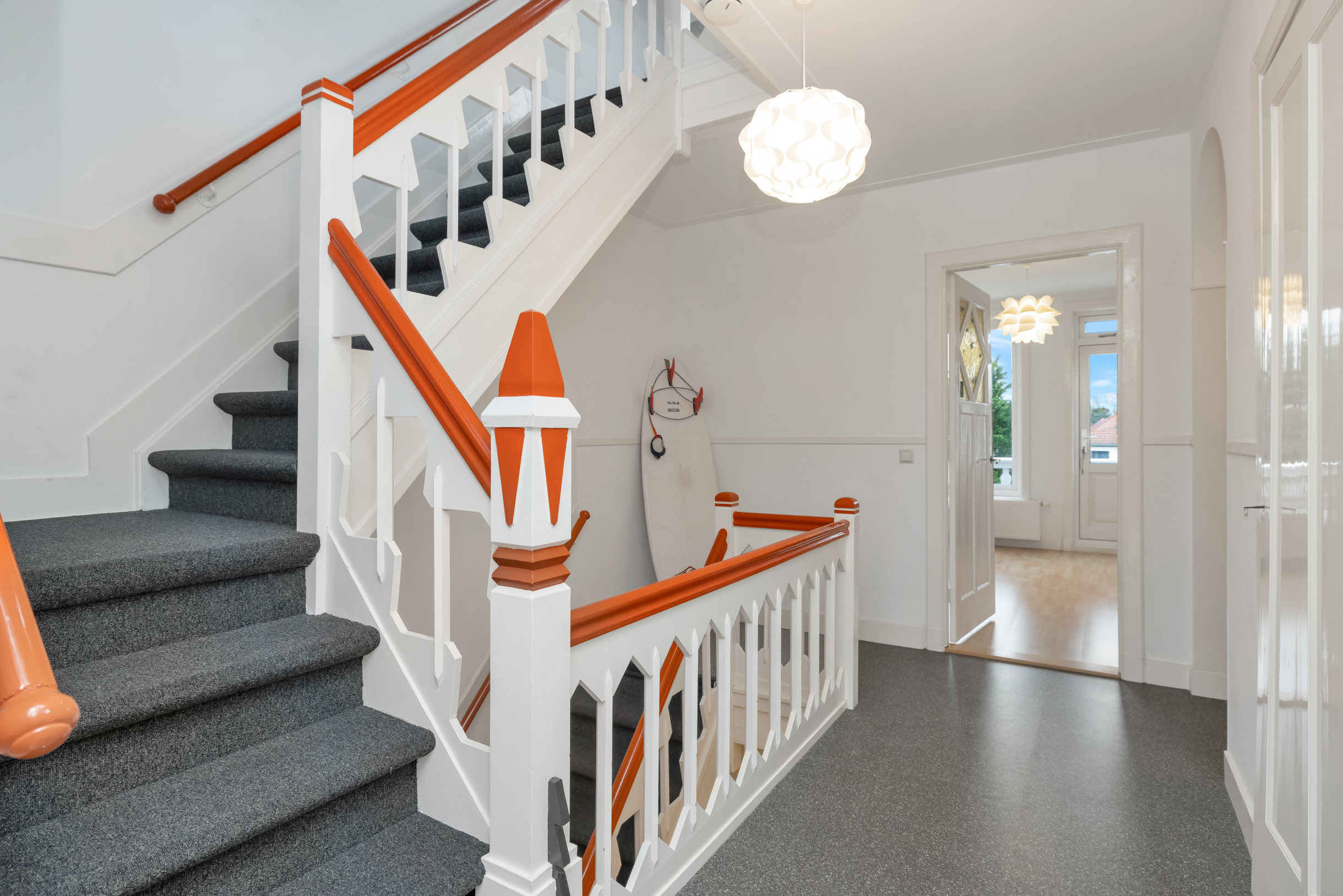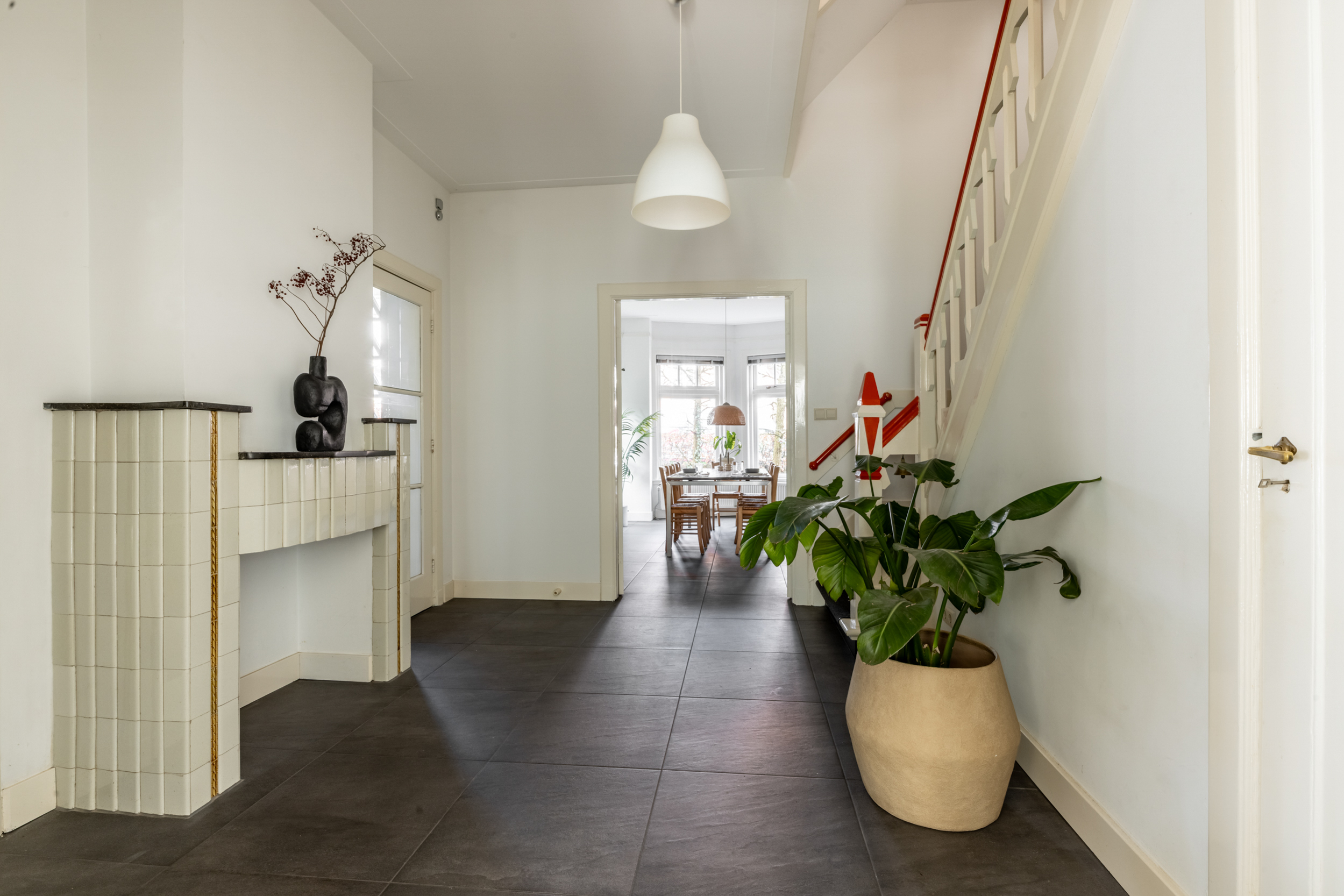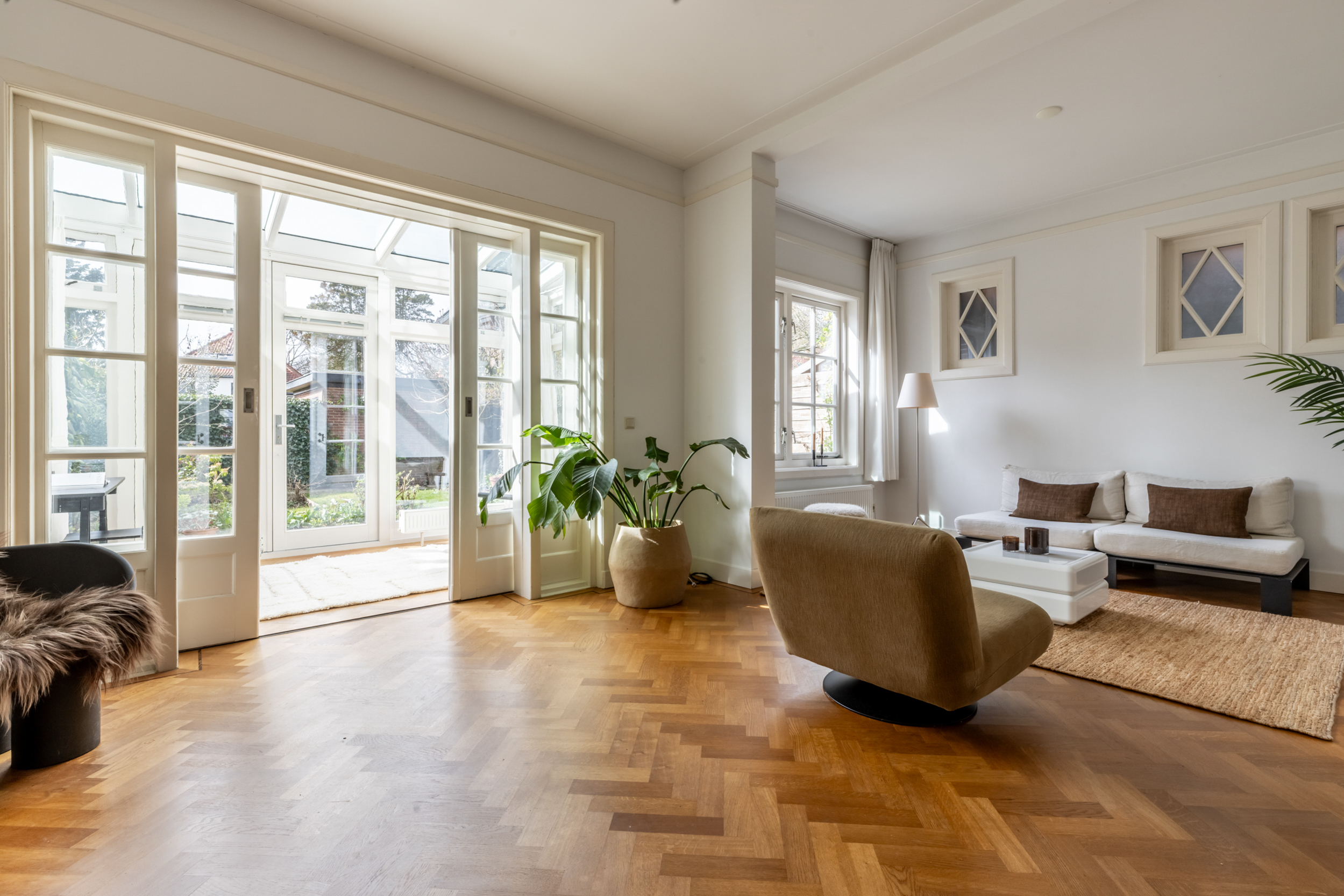 Een woning met volume, hoge verdiepingen, ruime moderne woonkeuken met erker, royale hal met trappenhuis, L-vormige huiskamer met fraaie karaktervolle parketvloeren met dubbele bies doorlopend in lichte serre met openslaande deuren naar een zonnige tuin. Op de verdiepingen vijf royale slaapkamers