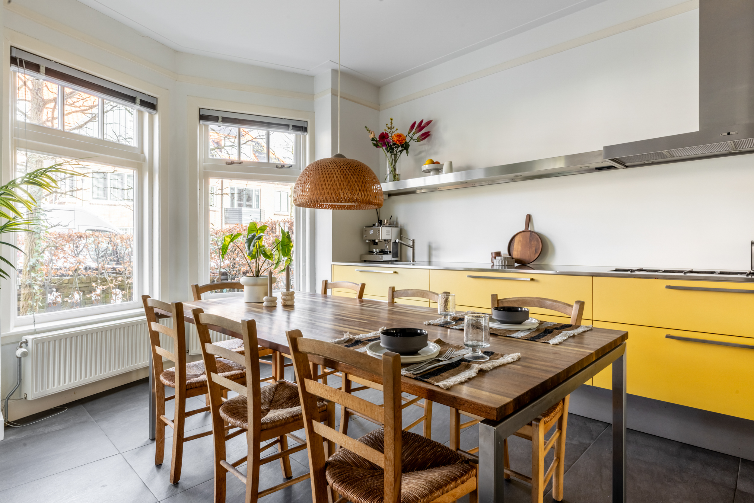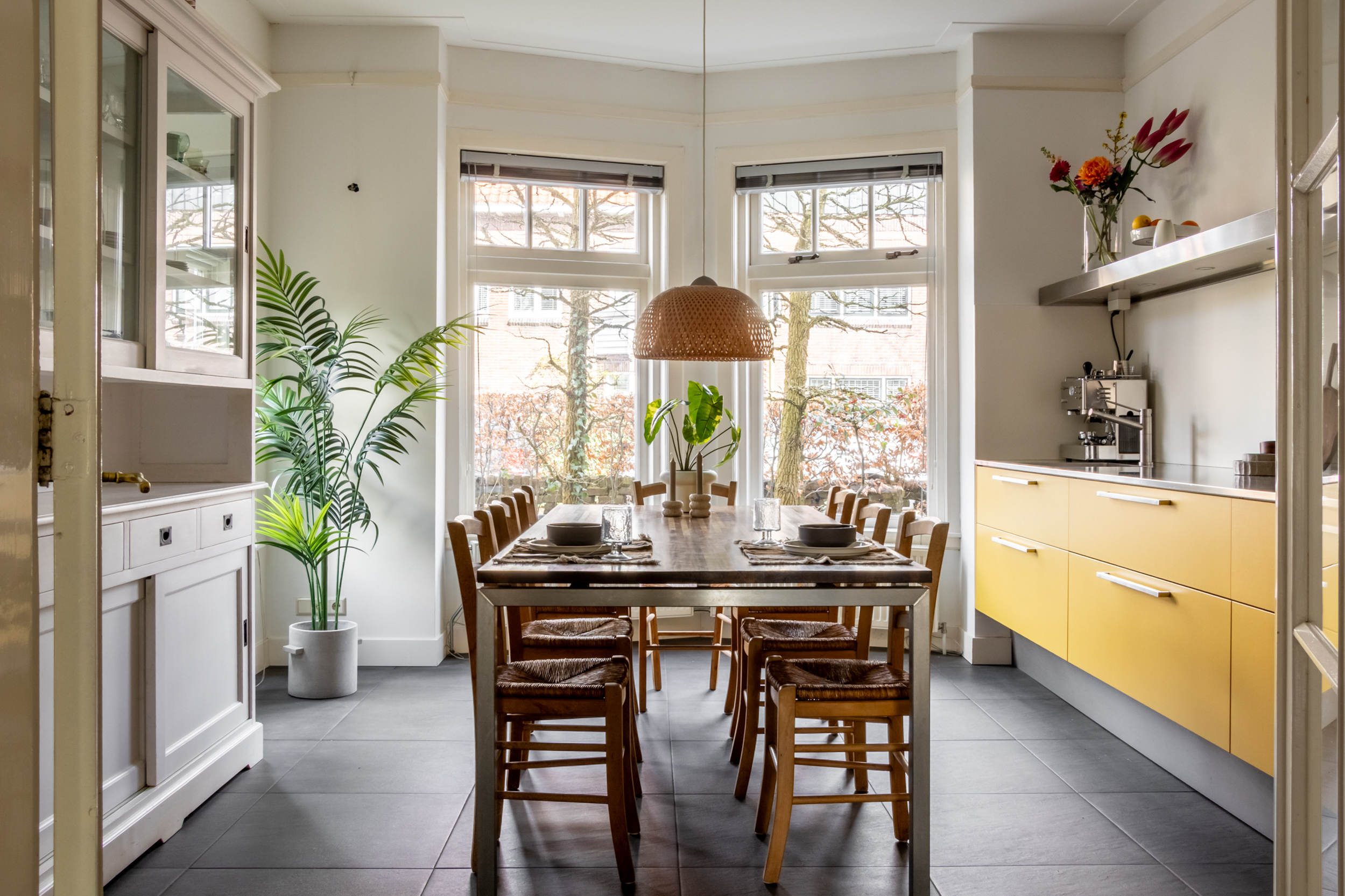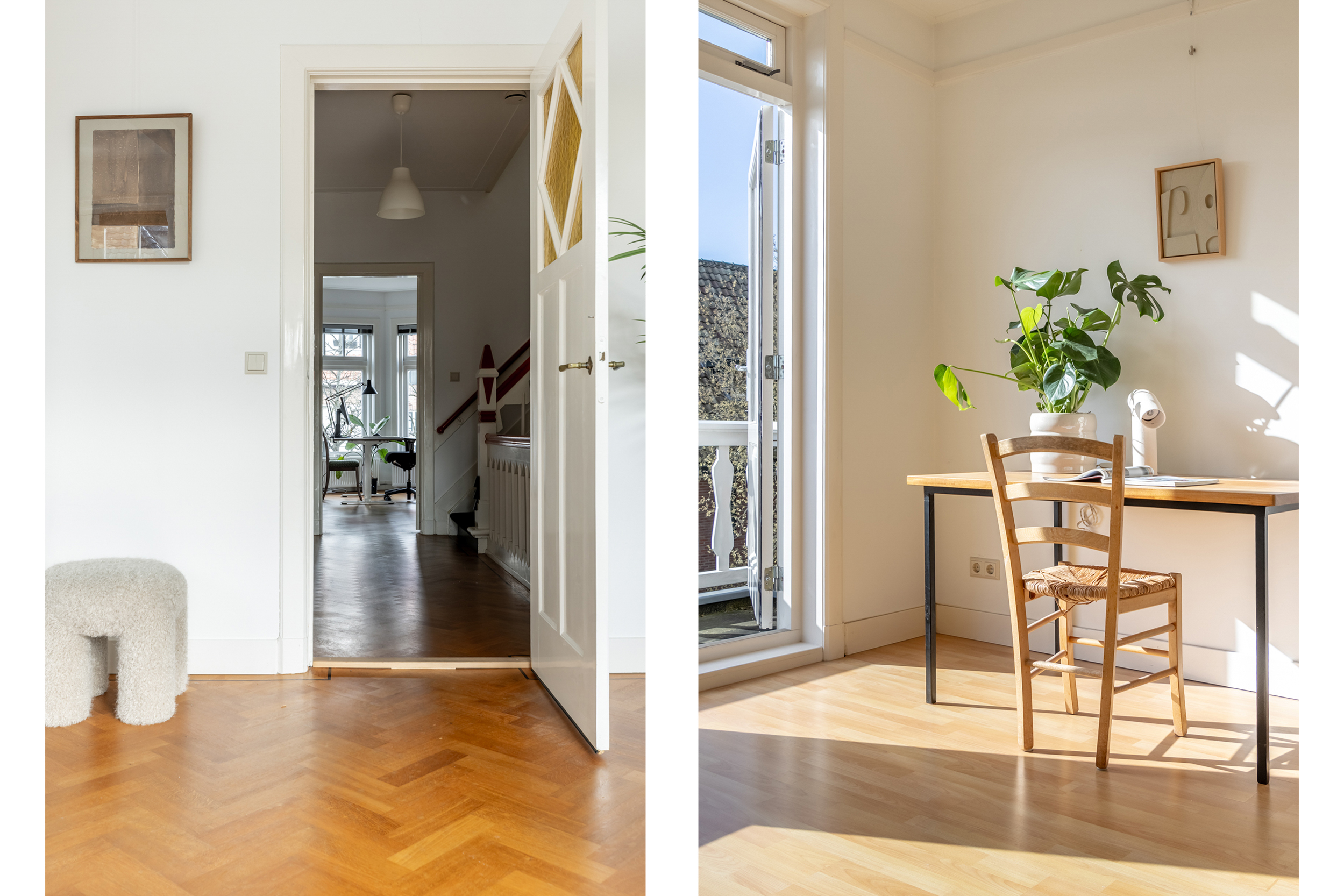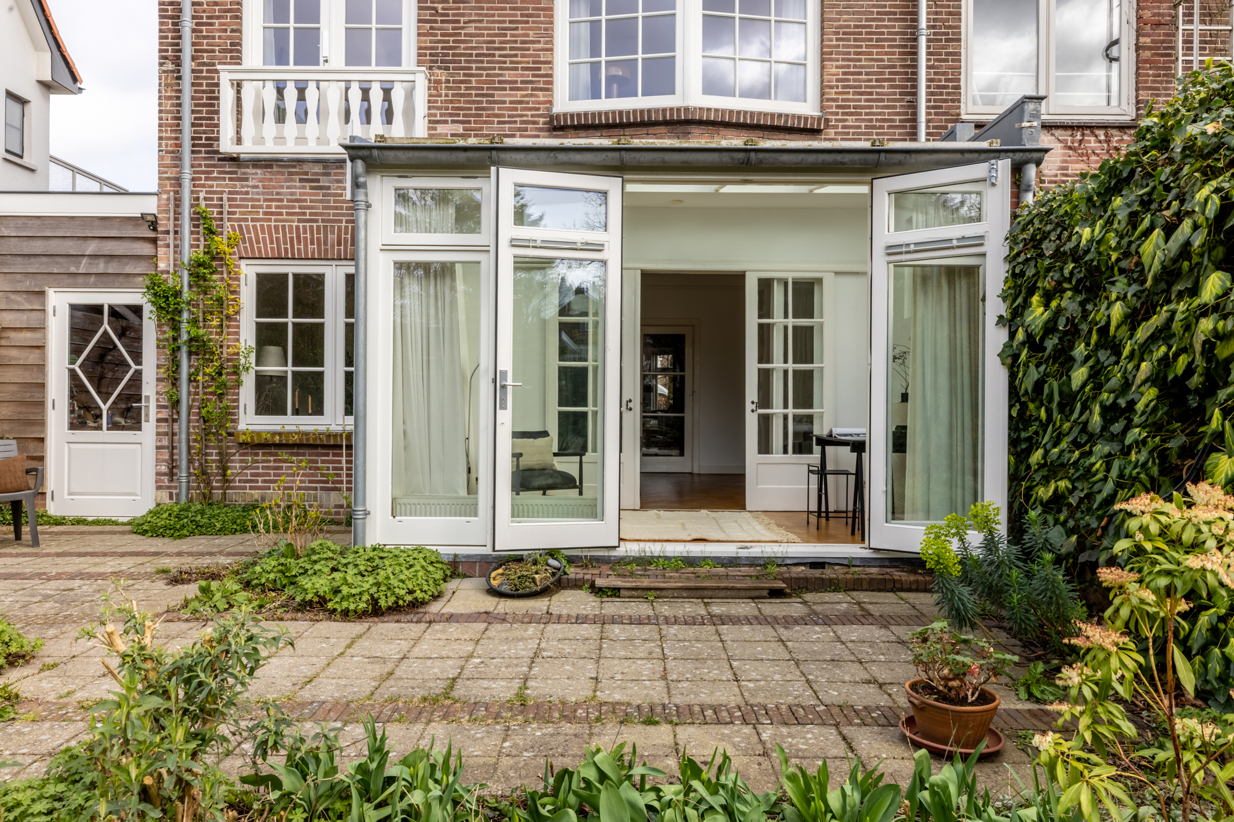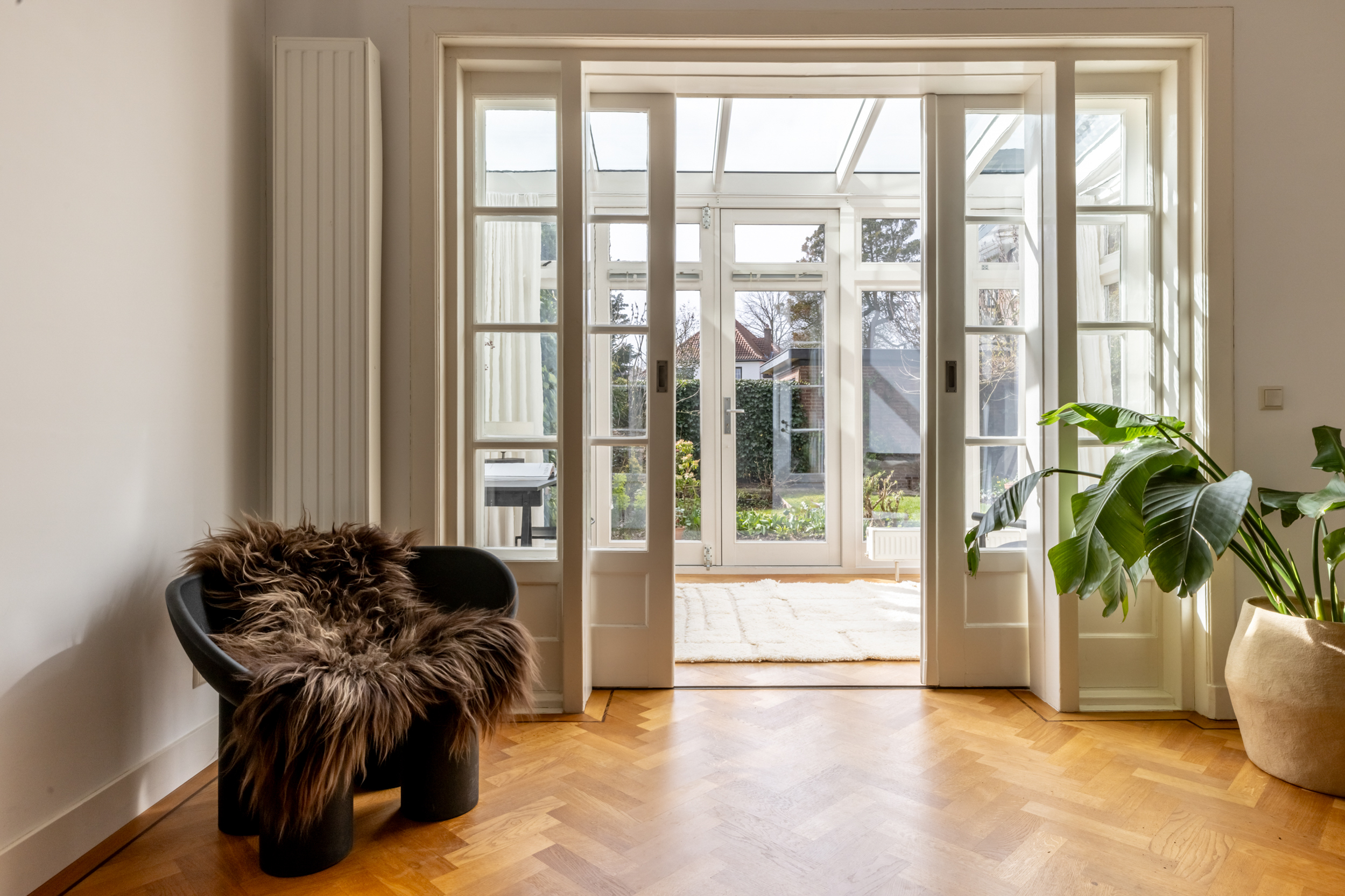 Een woning met volume, hoge verdiepingen, ruime moderne woonkeuken met erker, royale hal met trappenhuis, L-vormige huiskamer met fraaie karaktervolle parketvloeren met dubbele bies doorlopend in lichte serre met openslaande deuren naar een zonnige tuin. Op de verdiepingen vijf royale slaapkamers