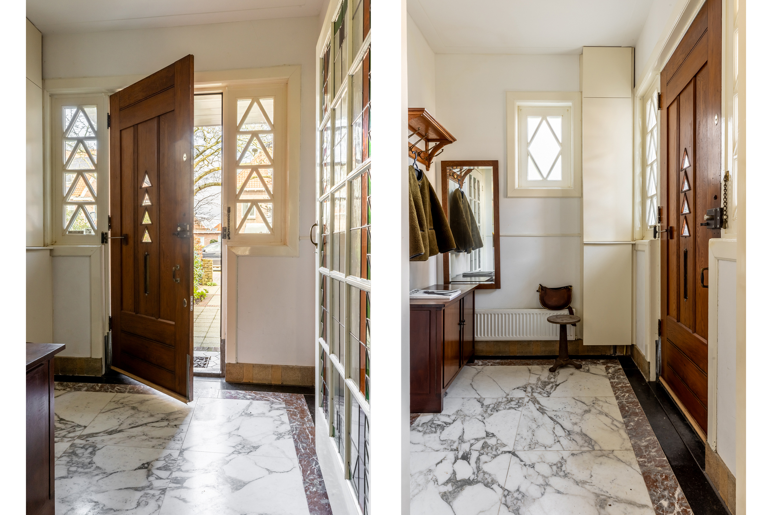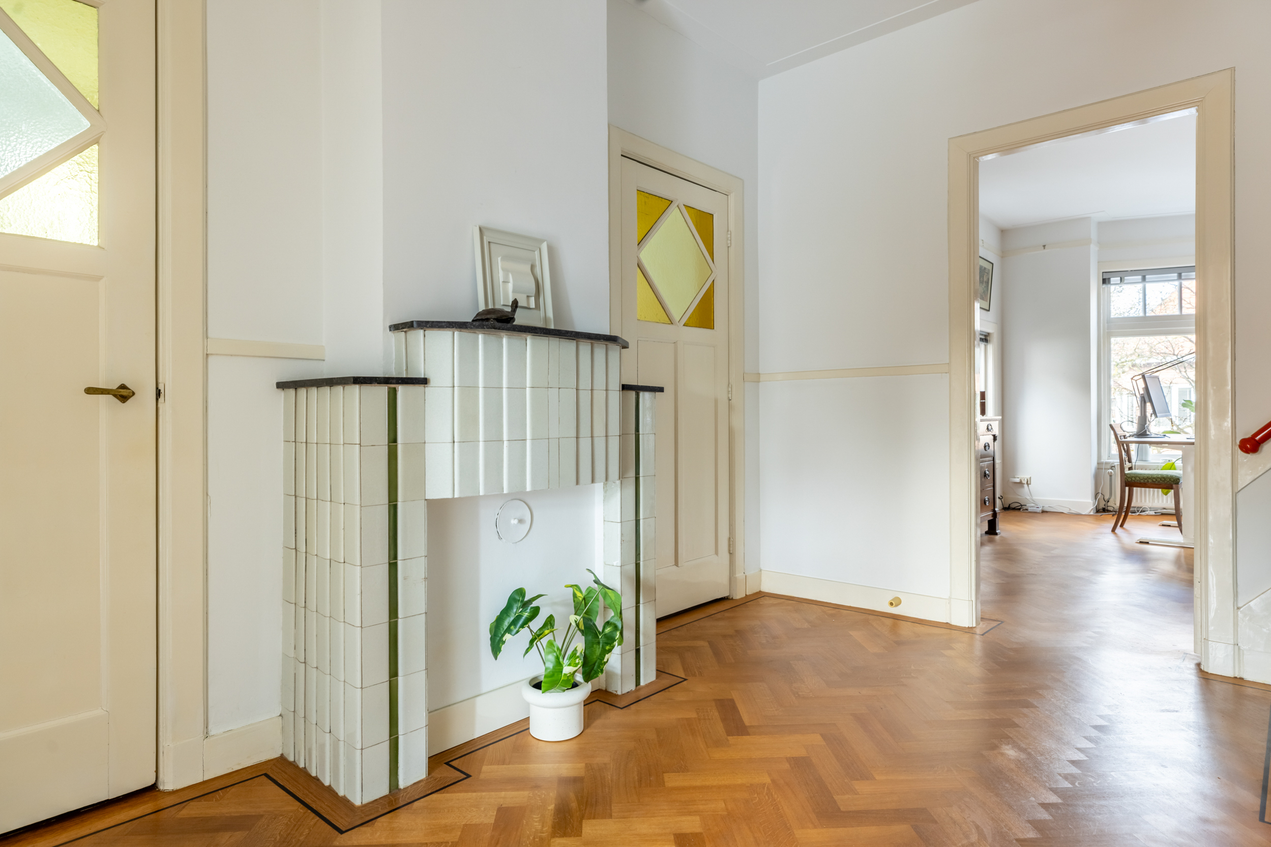 Fraaie entree met teakhouten voordeur, ruim tochtportaal met mooie marmeren vloerplaten en originele glas in lood deur, royale hal met fraai Amsterdamse School trappenhuis en karaktervolle schouw, ondergelegen ruime kelderruimte, tussenhal c.q. garderobe, apart toilet (zwevend) met hardstenen fontein, ruimte gezellige L-vormige living met brede visgraat parketvloeren met dubbele bies doorlopend in serre. De serre heeft schuifdeuren en openslaande deuren naar de tuin (ZW).