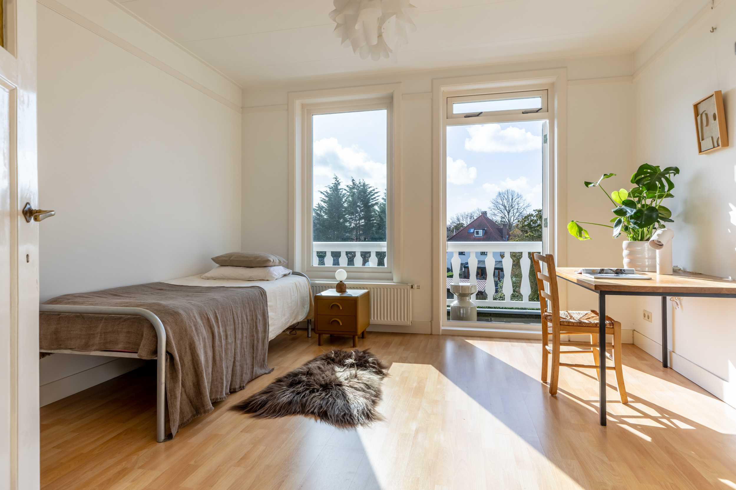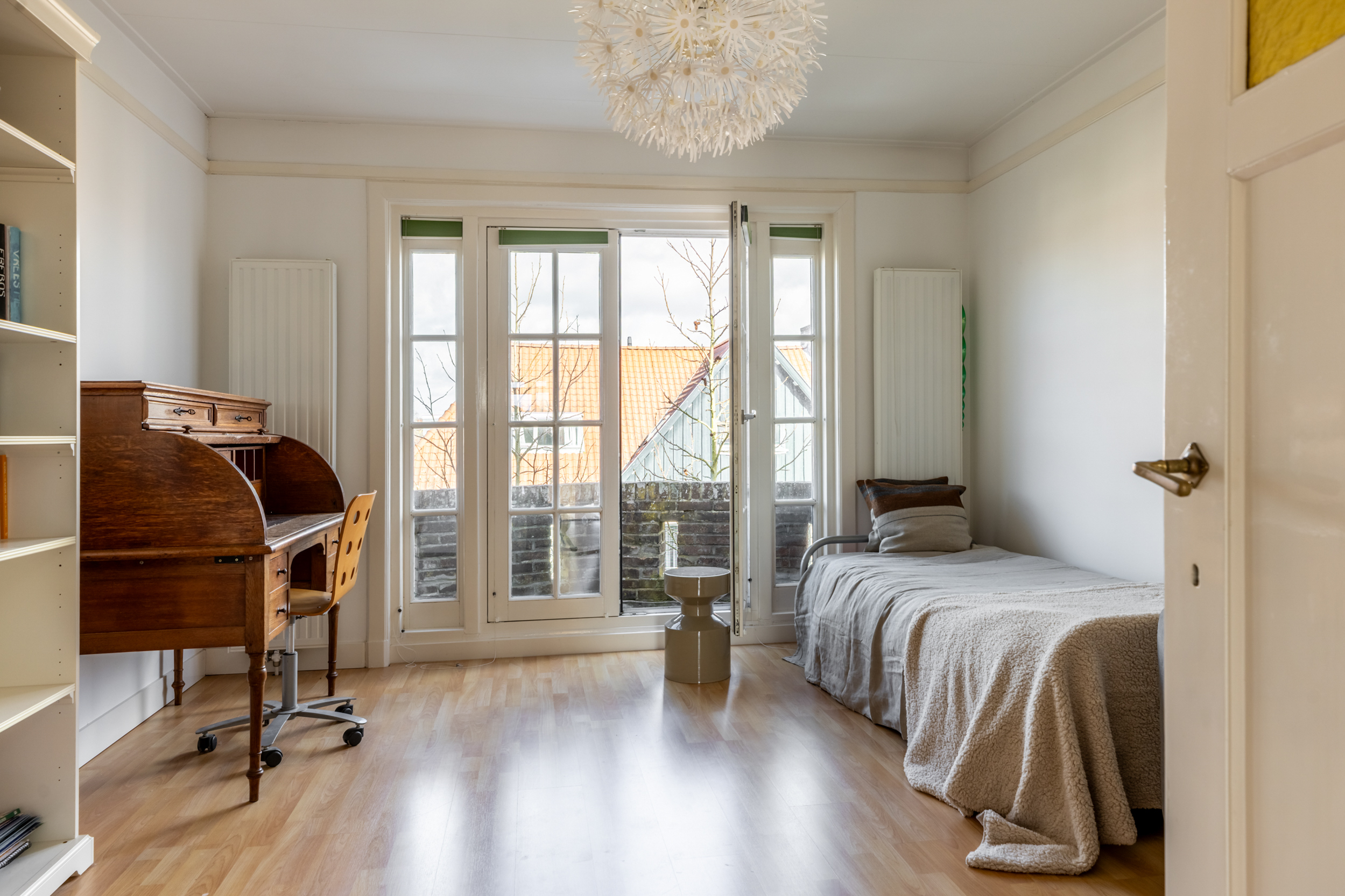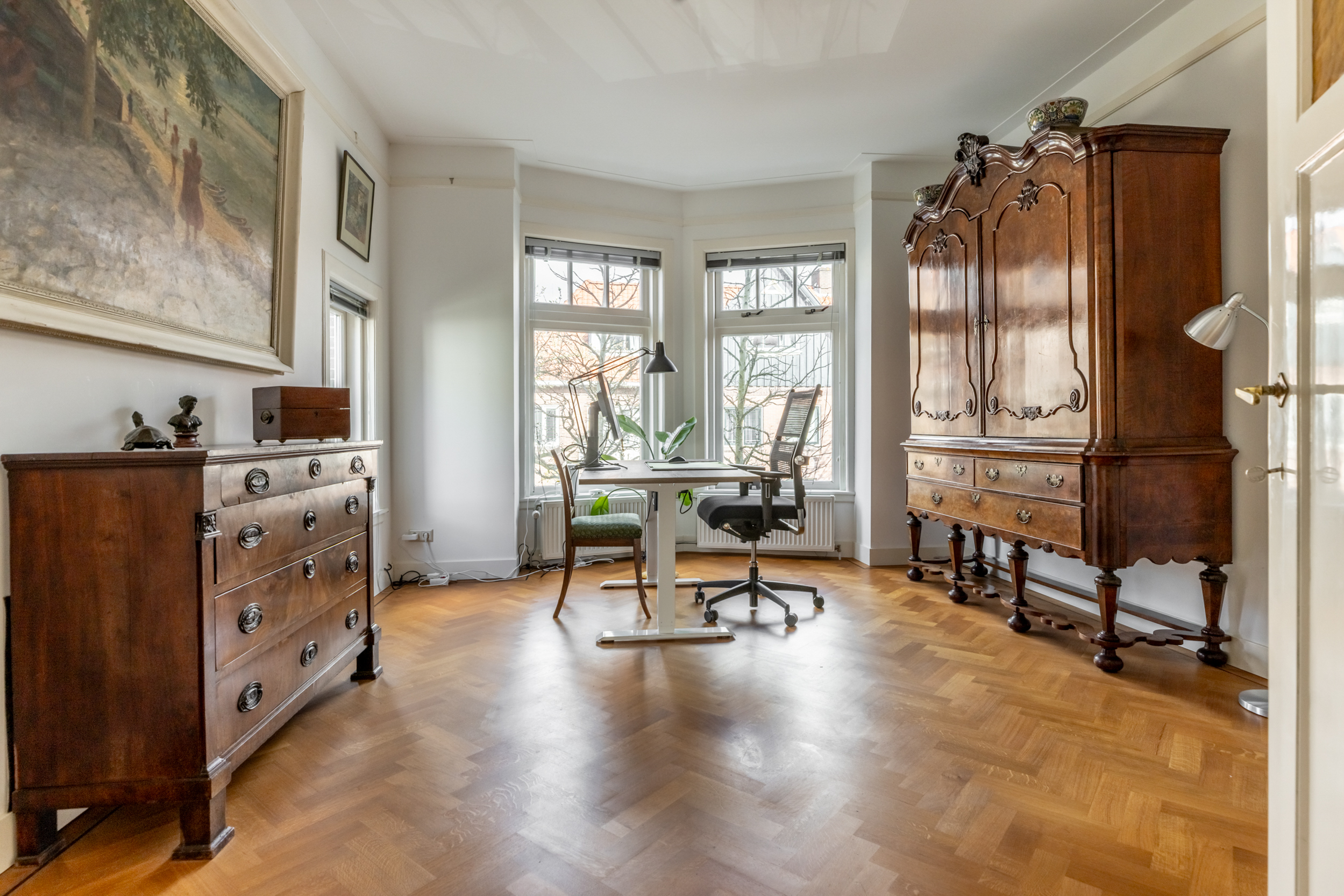 De trap heeft een dubbel bordes en komt uit op een ruime overloop met stijlvolle schouw. De eerste verdieping is geheel voorzien van visgraat parketvloer. Vanuit de overloop toegang tot de kamers. De voorslaap- werkkamer met schouw, erker en inbouwkast. De royale achterslaapkamer (voorheen 2 kamers) met erker, kastenwand en openslaande deuren naar frans balkon (ZW), tussenliggende moderne ruime badkamer met inloopdouche, 2e toilet (zwevend), wastafel en wasmachine/droger aansluiting en CV-ketel.